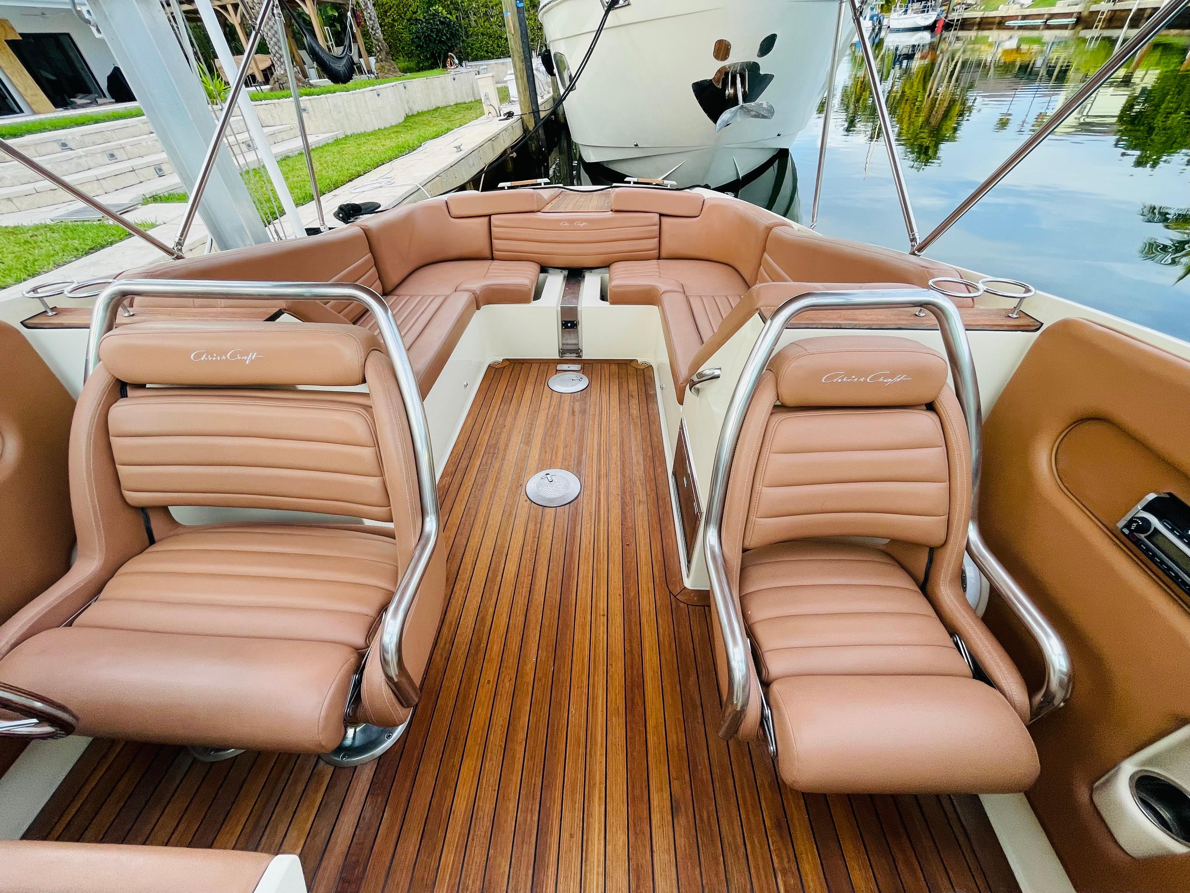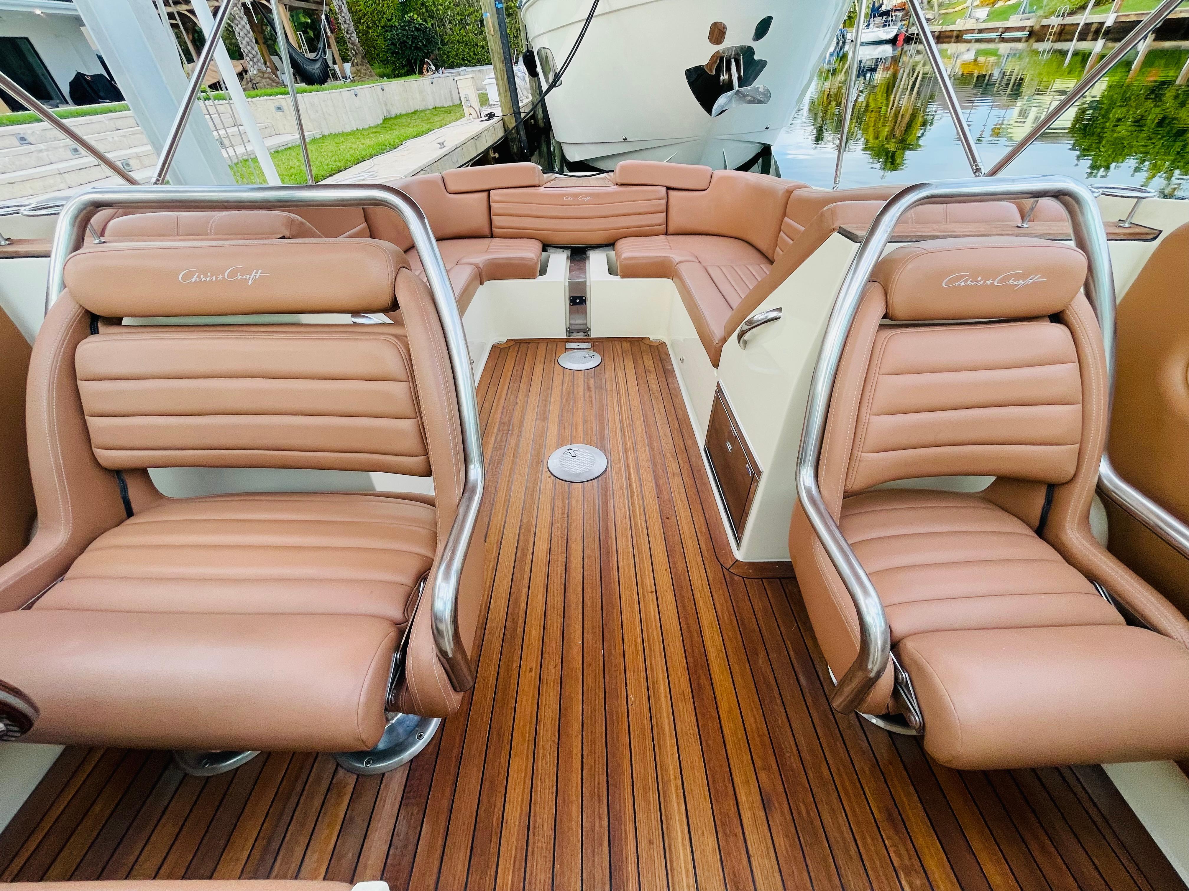- Concealed teak cockpit table that conveniently sets up and stores under the