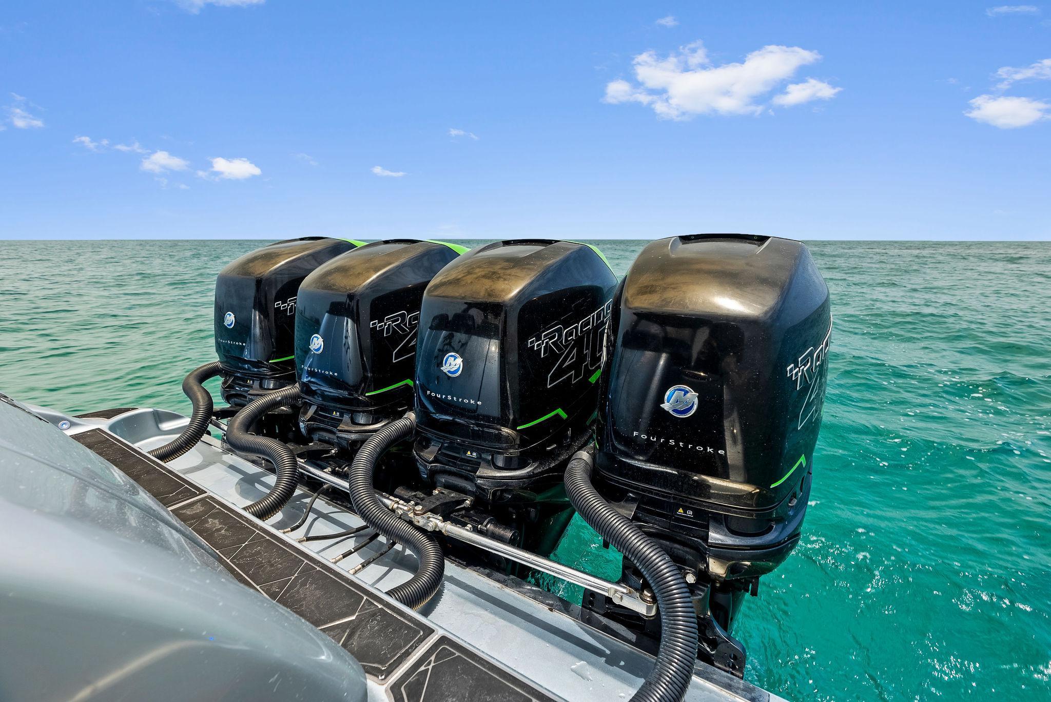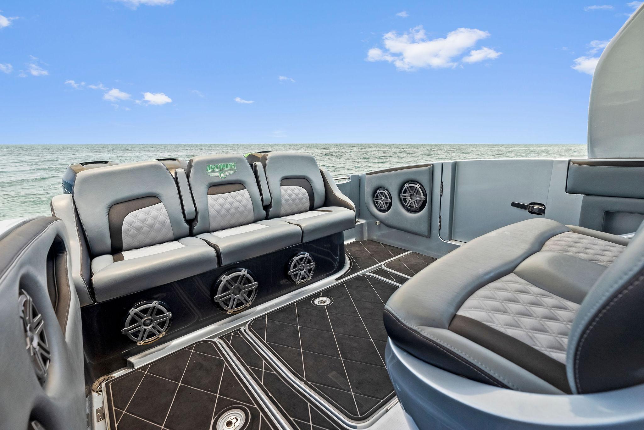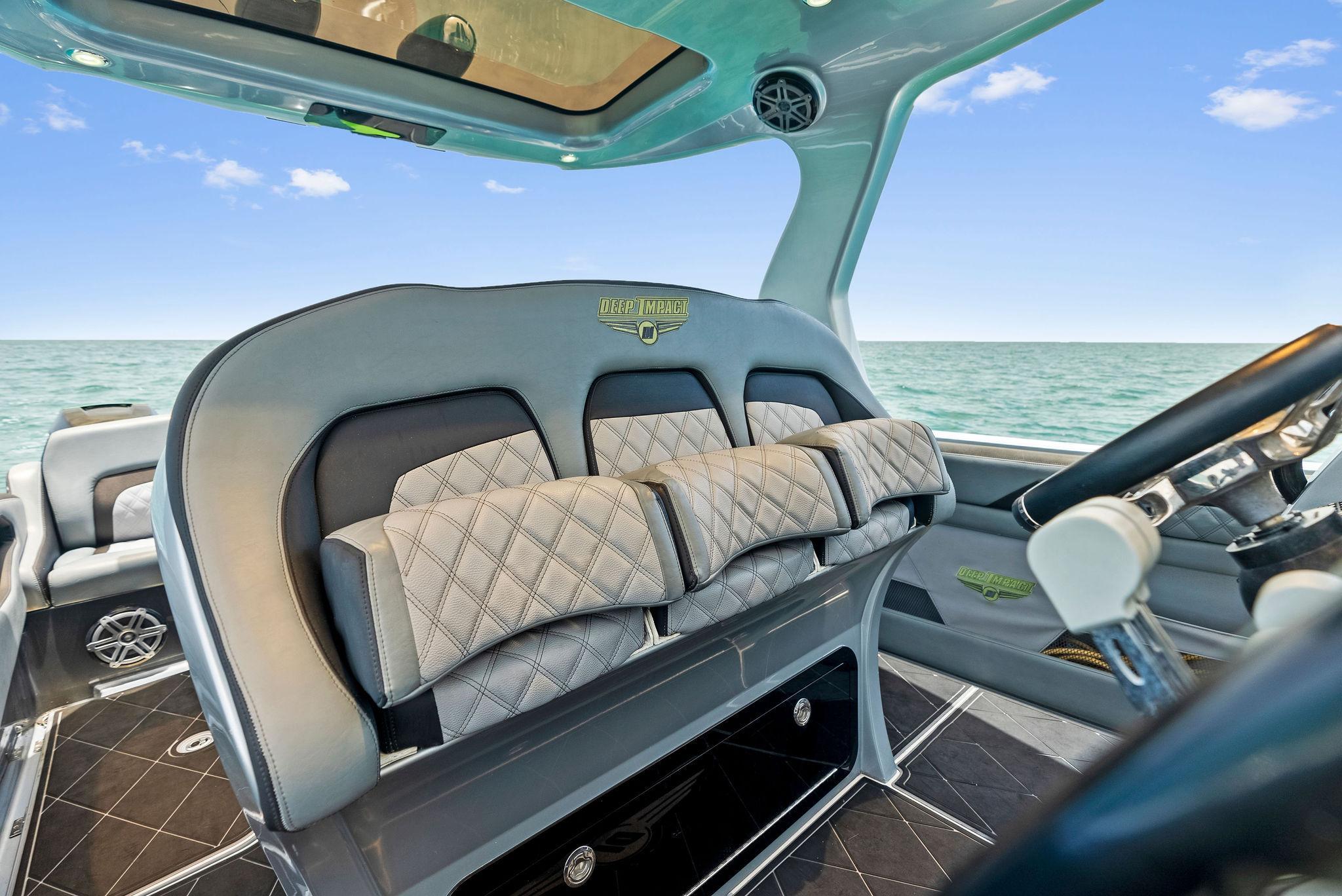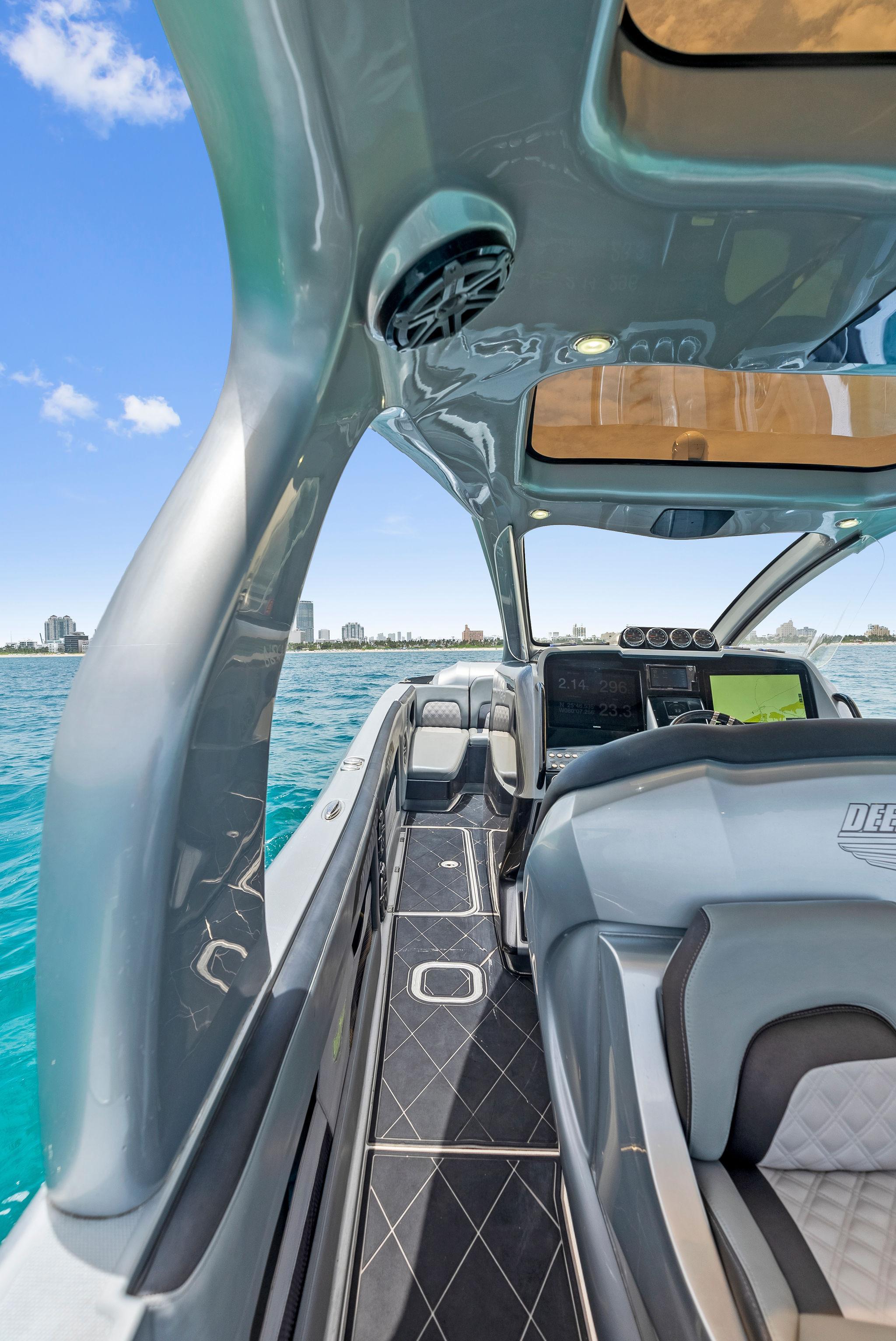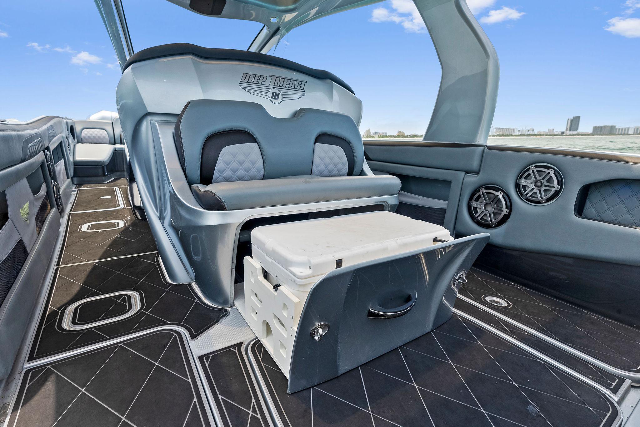 2018 Deep Impact 399 Cabin | BABYThe 399 Cabin is the best combination of an open center console that features a forward cabin for comfortable overnighting. A full V berth, hanging locker, galley and a bonus aft sleeping area come together in air-conditioned comfort. This boat also features a separate head under the console. What’s more is that all of this comes packaged in the look and ride of the new Deep Impact 399, a true offshore thoroughbred.FeaturesPowered by Quad Mercury Verado Racing 400HP Charcoal sea deck design Sky light hardtop Speakers & multicolor lightning Outstanding accommodations Features: Dual Garmin 17" GPS displays Premium JL audio stereo system with fusion head unit, 24 JL audio speakers, 8 amplifiers, 2 aft conesCustom modular helm bench/triple seat convertible center console w/ custom molded fiberglass frame & sealed tinted acrylic panel windshield. Rear starboard triple custom bench seating Luxury Cabin w/ TV, A/C, bed, kitchen with black Corian counter and backsplash cabinetry, a stainless sink, upright refrigerator, a microwave, & full hanging locker Port hinged dive door with custom marine stair Hardtop frame rod holders hardtop Freshwater washdown Bow thruster Underwater lightsLast maintenance was done at 300 hoursTrailer