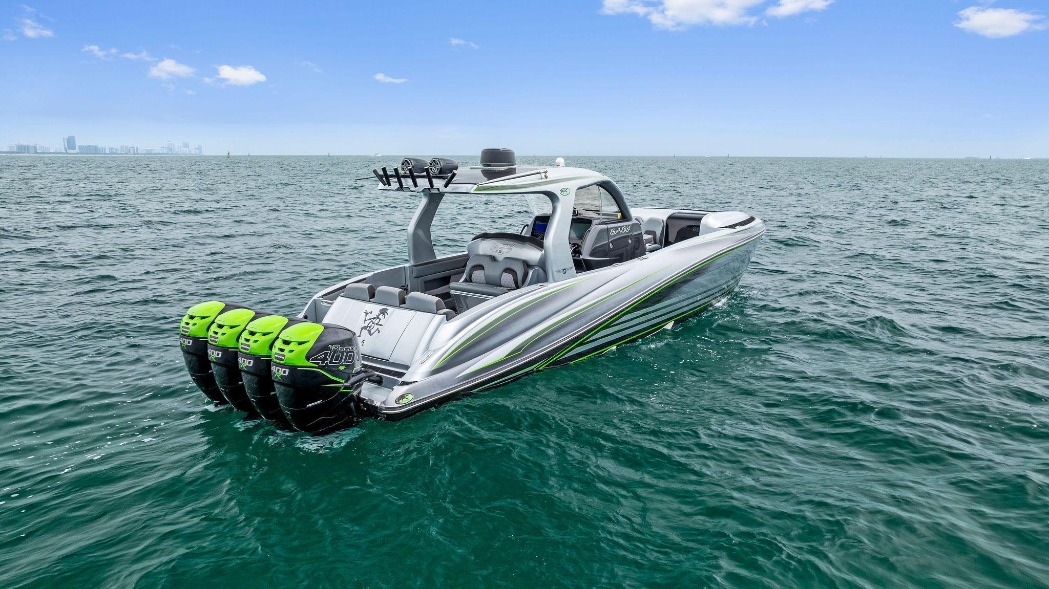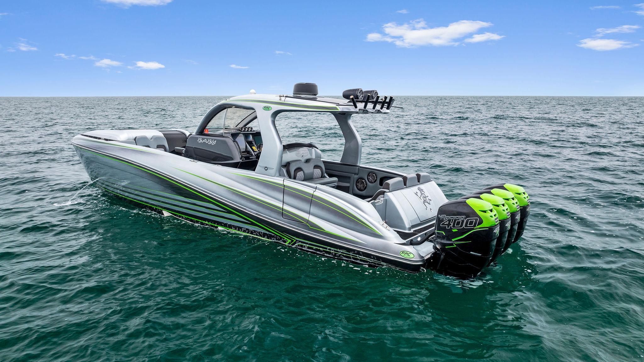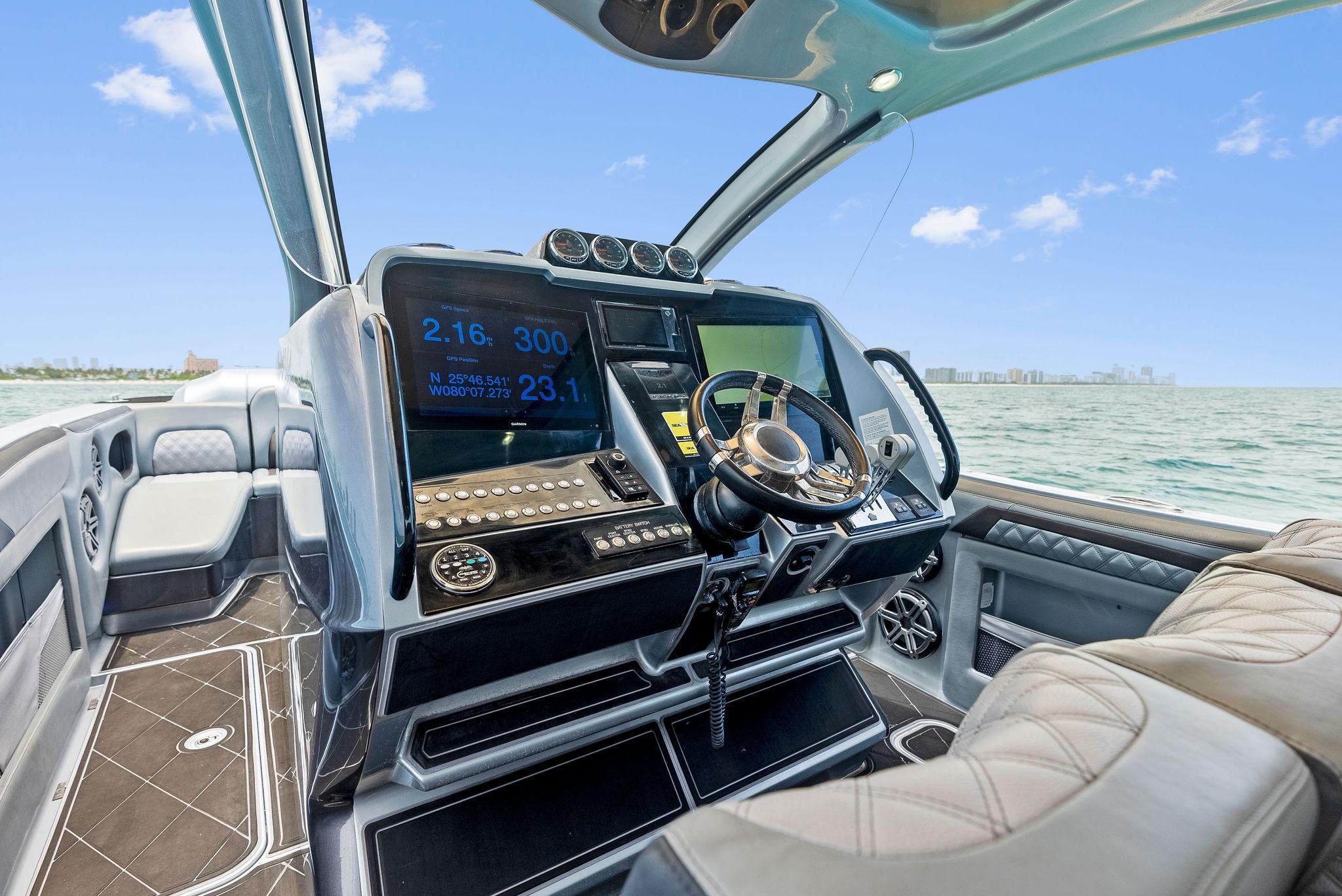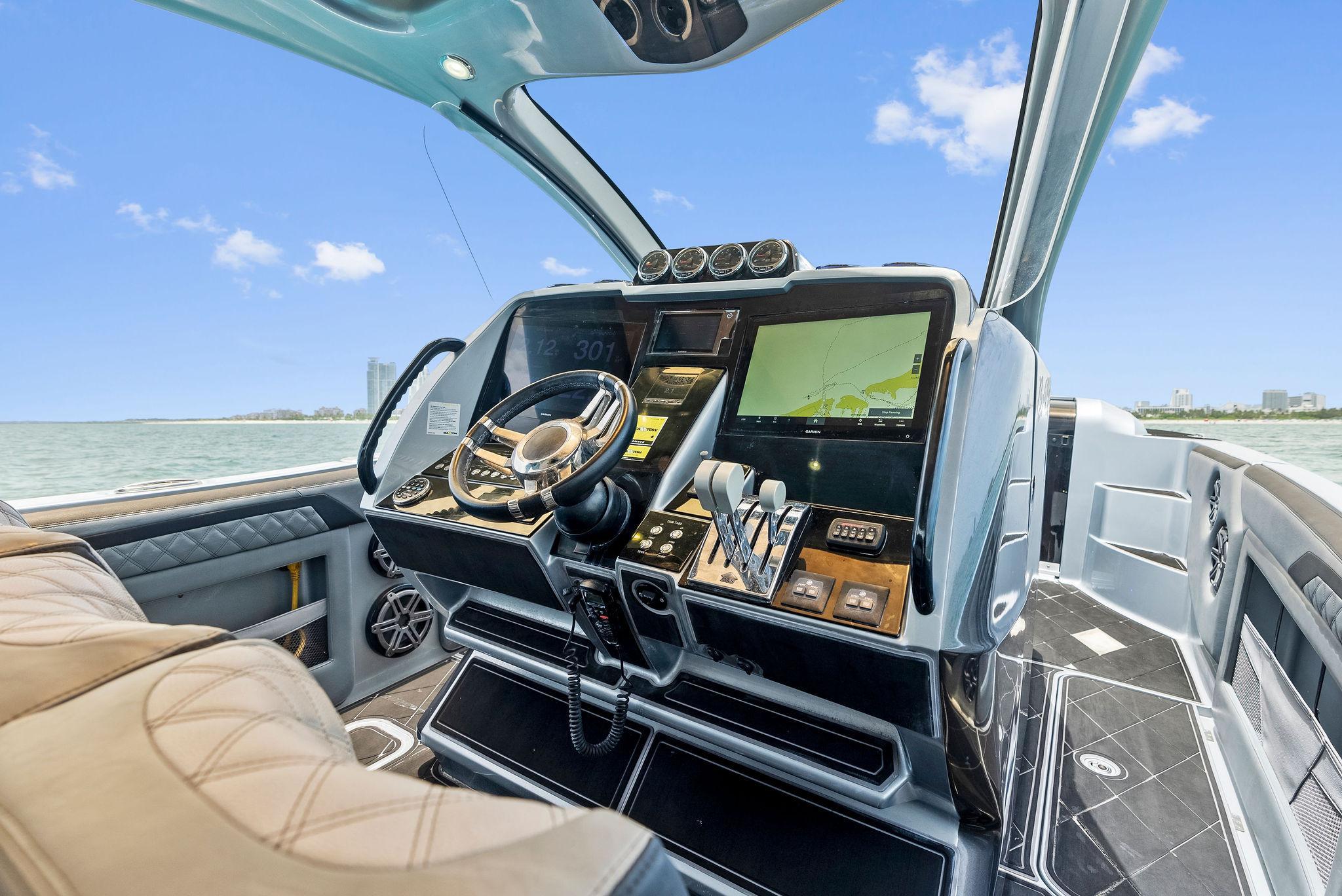 2018 Deep Impact 399 Cabin | BABYThe 399 Cabin is the best combination of an open center console that features a forward cabin for comfortable overnighting. A full V berth, hanging locker, galley and a bonus aft sleeping area come together in air-conditioned comfort. This boat also features a separate head under the console. What’s more is that all of this comes packaged in the look and ride of the new Deep Impact 399, a true offshore thoroughbred.FeaturesPowered by Quad Mercury Verado Racing 400HP Charcoal sea deck design Sky light hardtop Speakers & multicolor lightning Outstanding accommodations Features: Dual Garmin 17" GPS displays Premium JL audio stereo system with fusion head unit, 24 JL audio speakers, 8 amplifiers, 2 aft conesCustom modular helm bench/triple seat convertible center console w/ custom molded fiberglass frame & sealed tinted acrylic panel windshield. Rear starboard triple custom bench seating Luxury Cabin w/ TV, A/C, bed, kitchen with black Corian counter and backsplash cabinetry, a stainless sink, upright refrigerator, a microwave, & full hanging locker Port hinged dive door with custom marine stair Hardtop frame rod holders hardtop Freshwater washdown Bow thruster Underwater lightsLast maintenance was done at 300 hoursTrailer