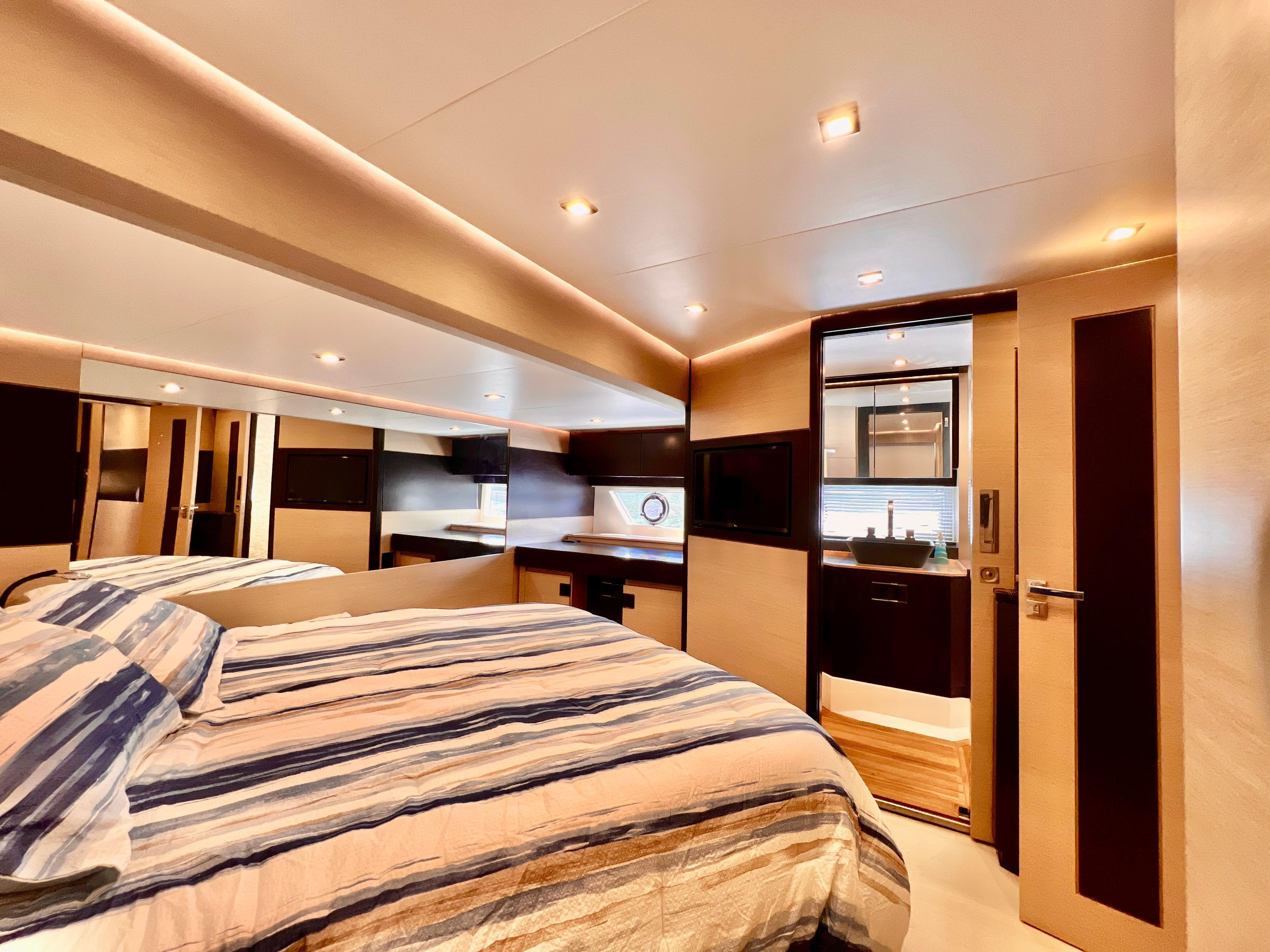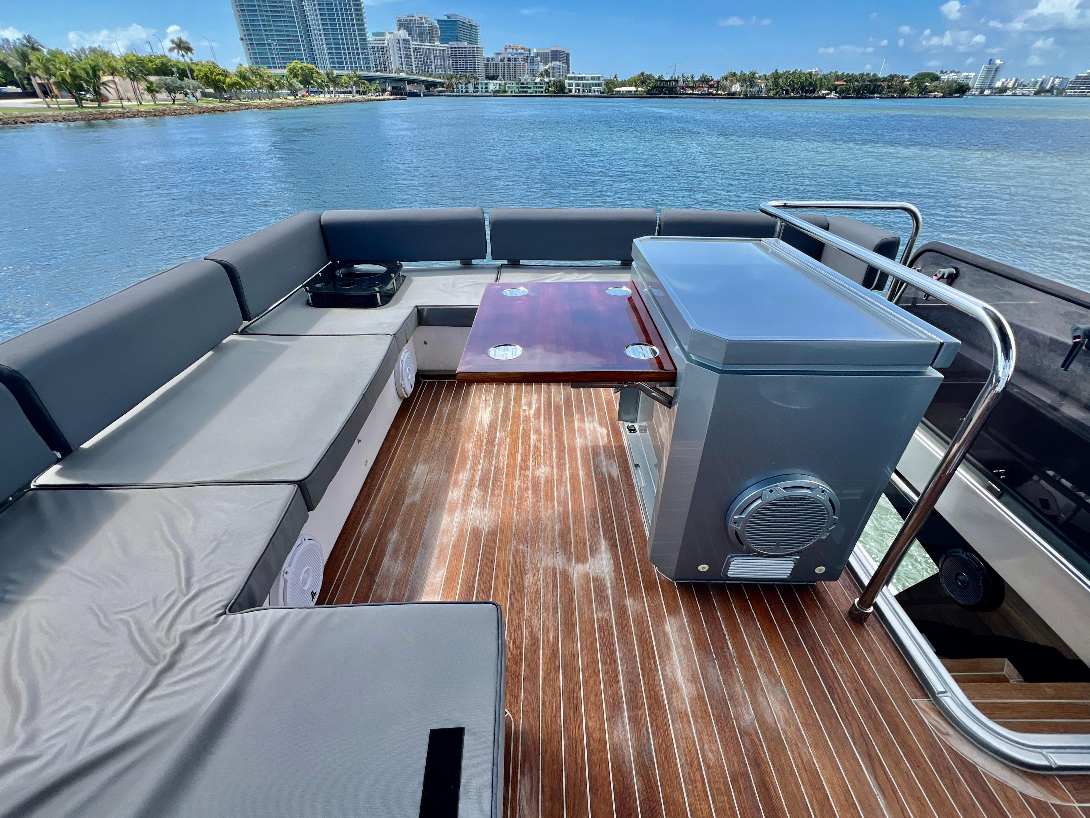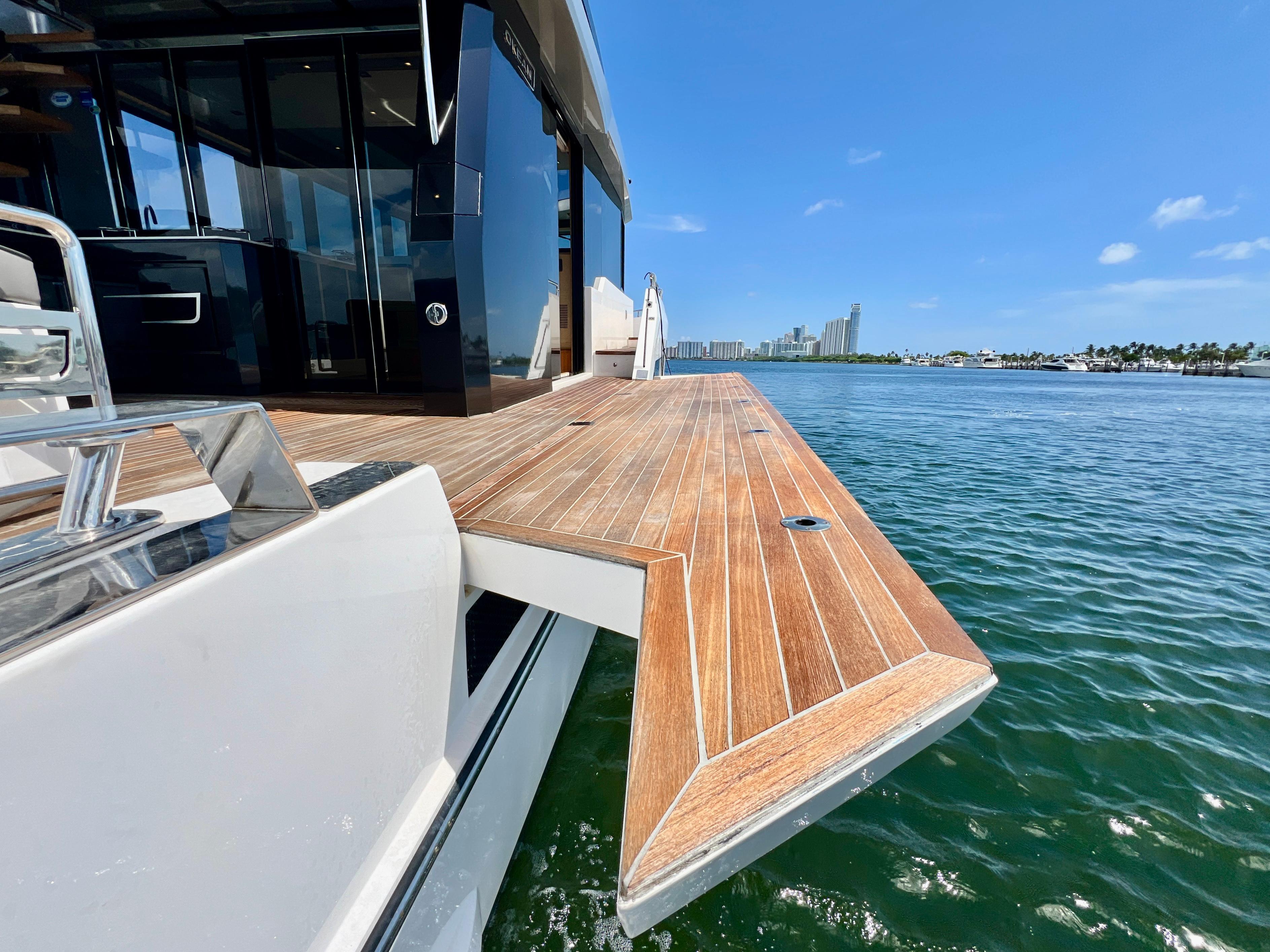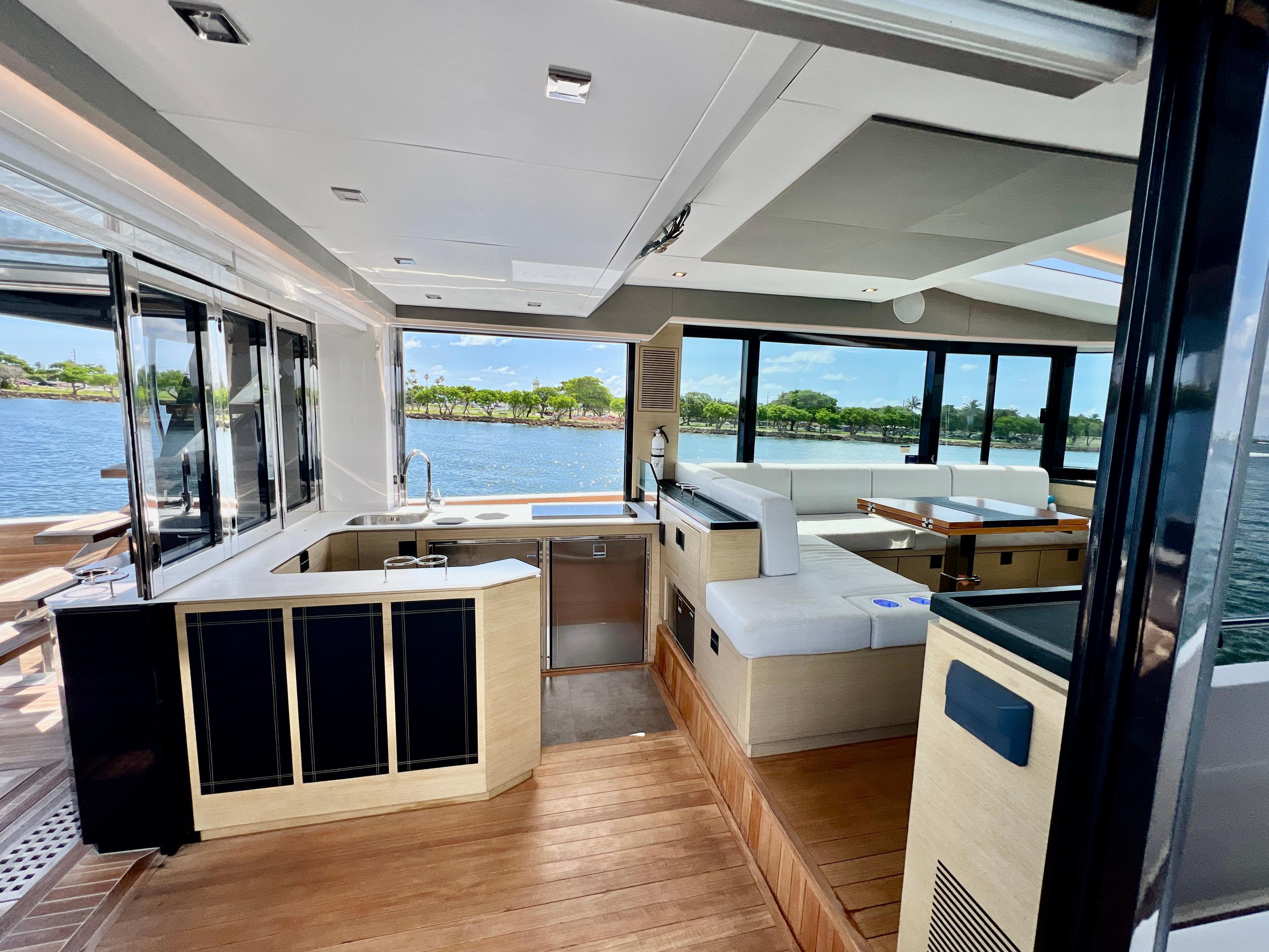 - Salon to aft deck access through folding stainless steel framed doors with tinted laminated glass