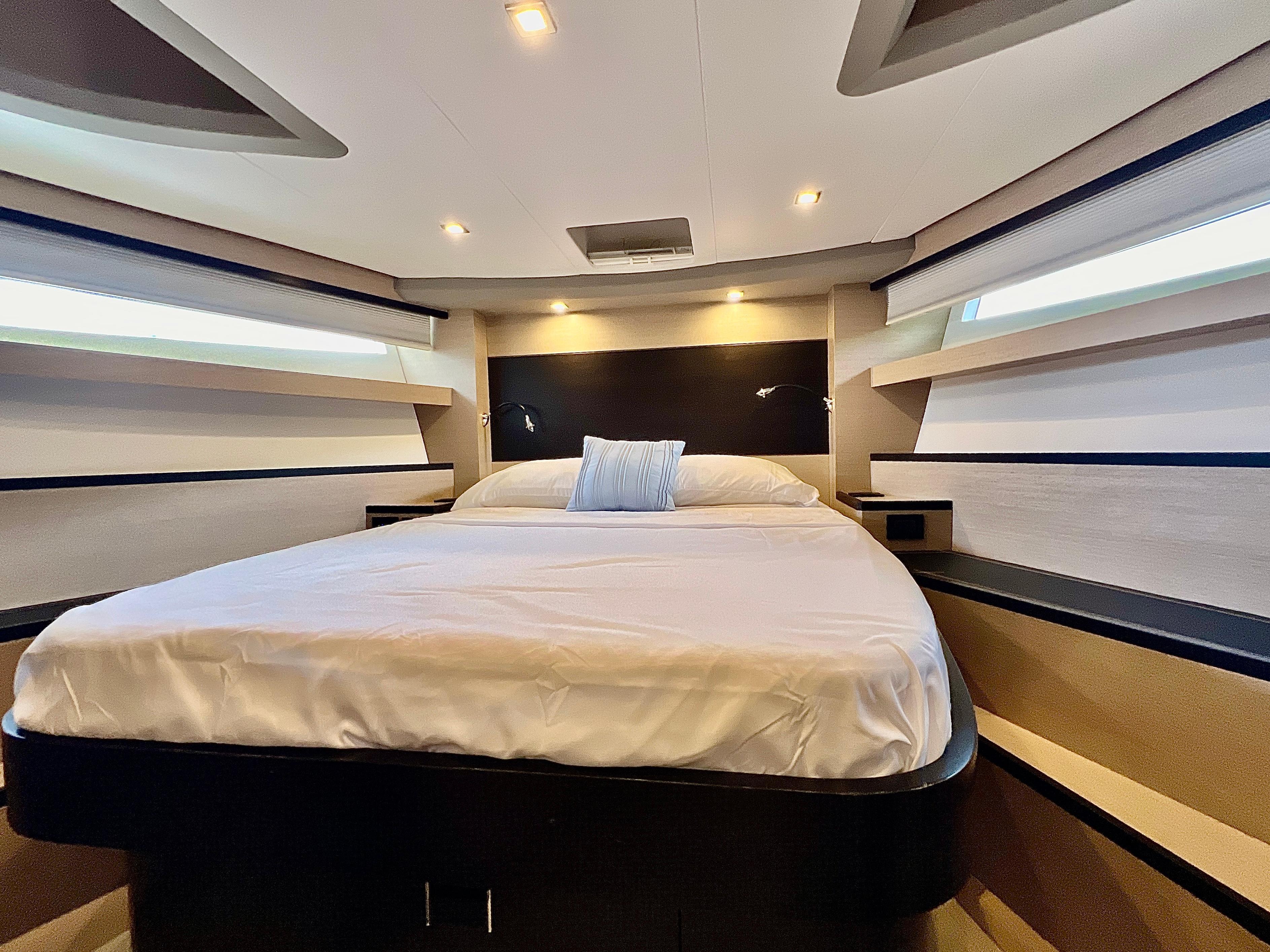 - Storage cabinets, port and starboard sides of bed, finished maple interiors