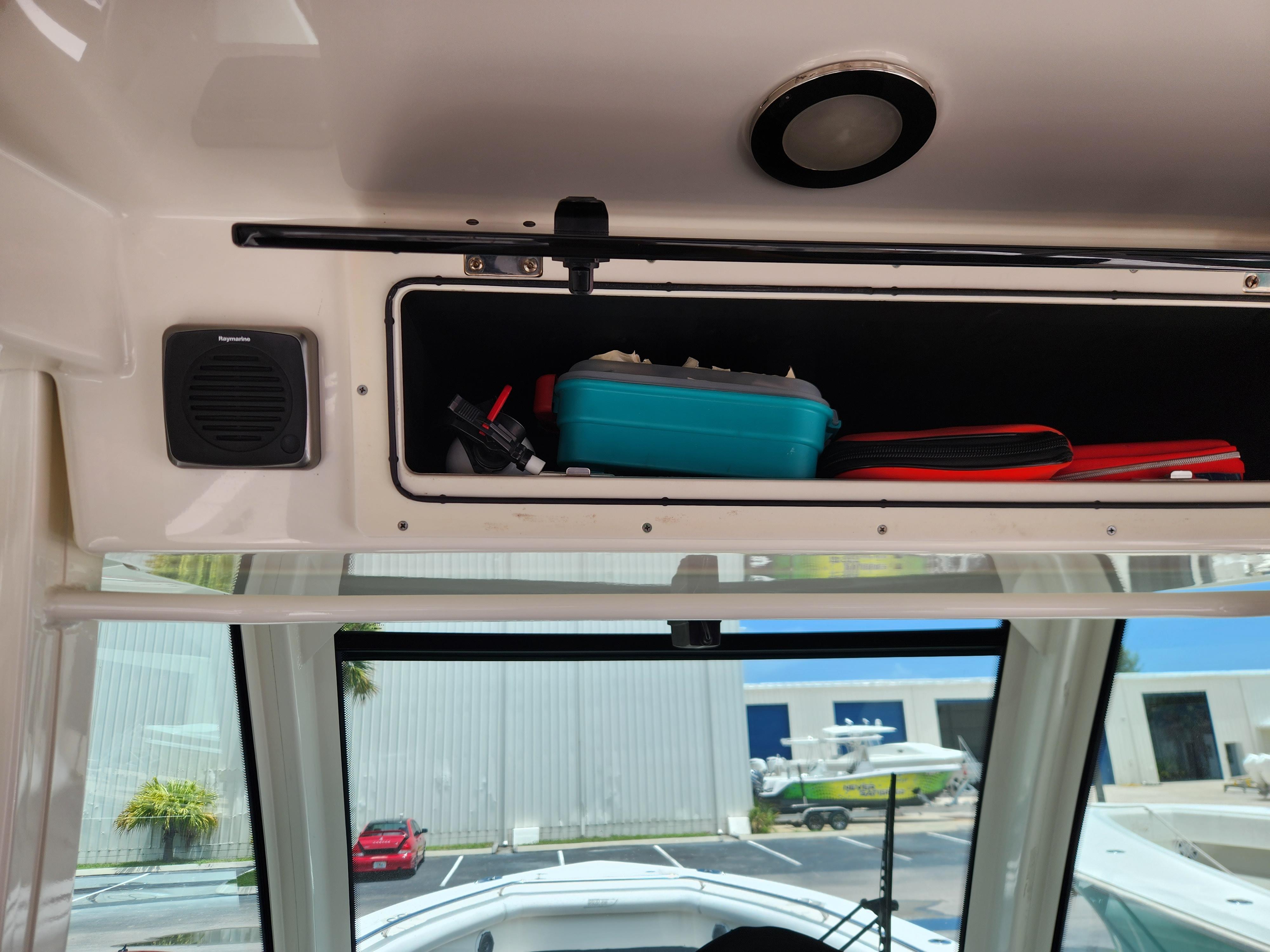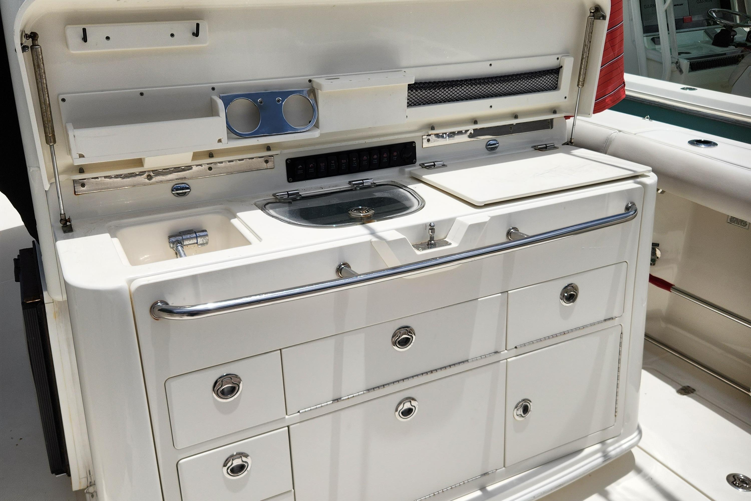- Tackle center with bait prep area with cutting board, fresh water sink, live well, tackle drawers and storage compartment, Slide out carry -on Yeti cooler compartment, drink holders, Stainless steel grab rail, storage lid with tool holders