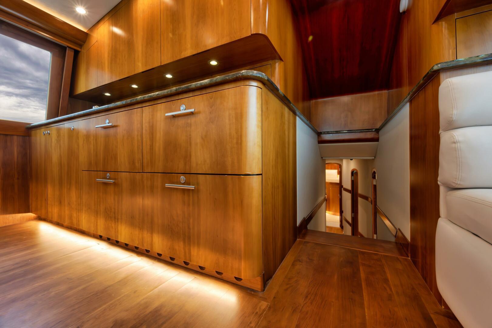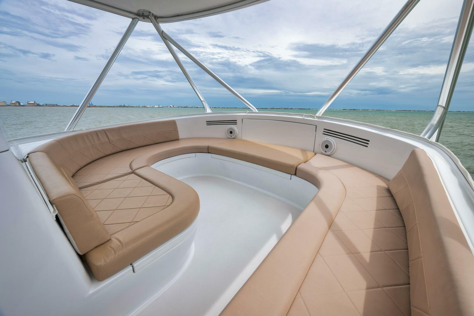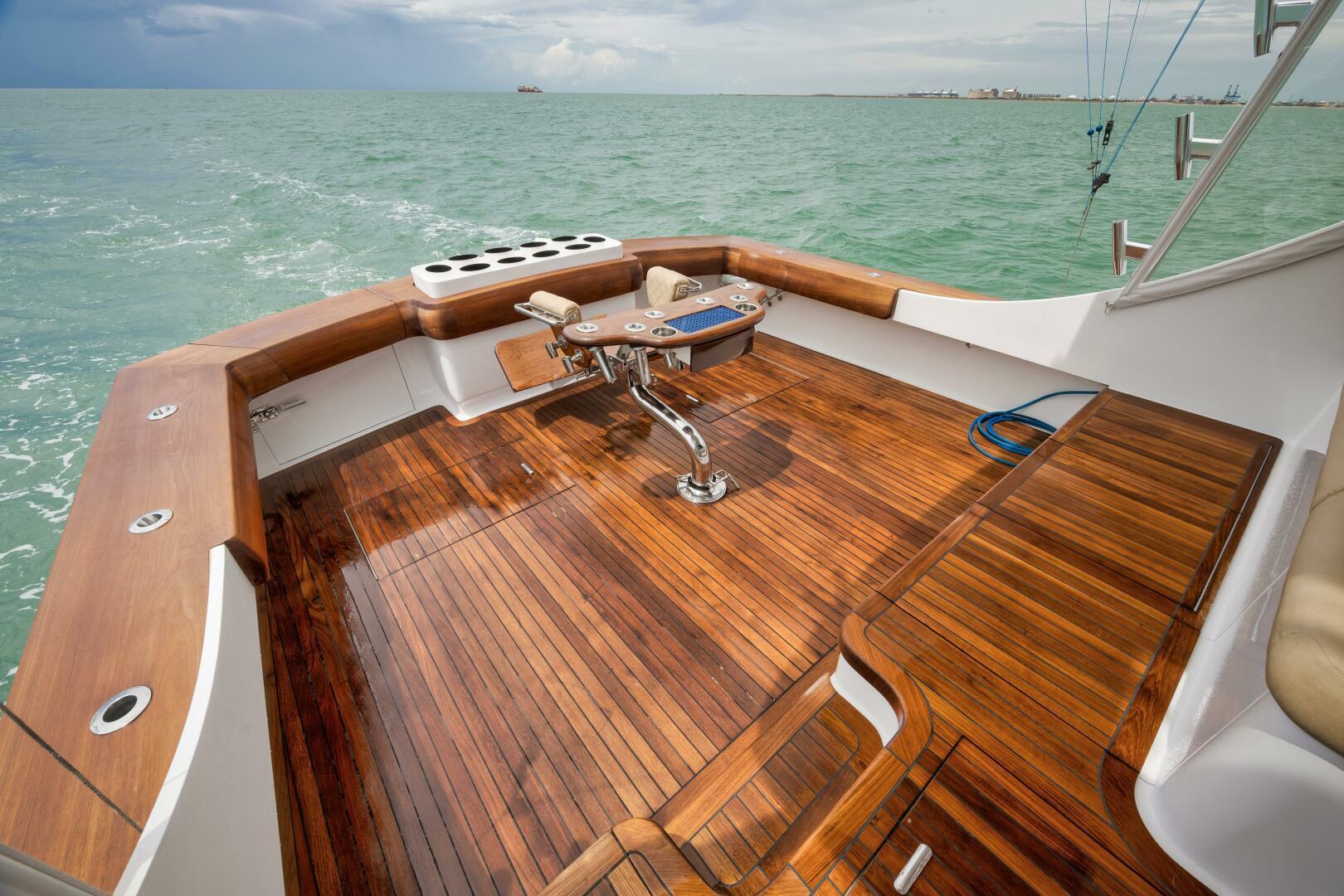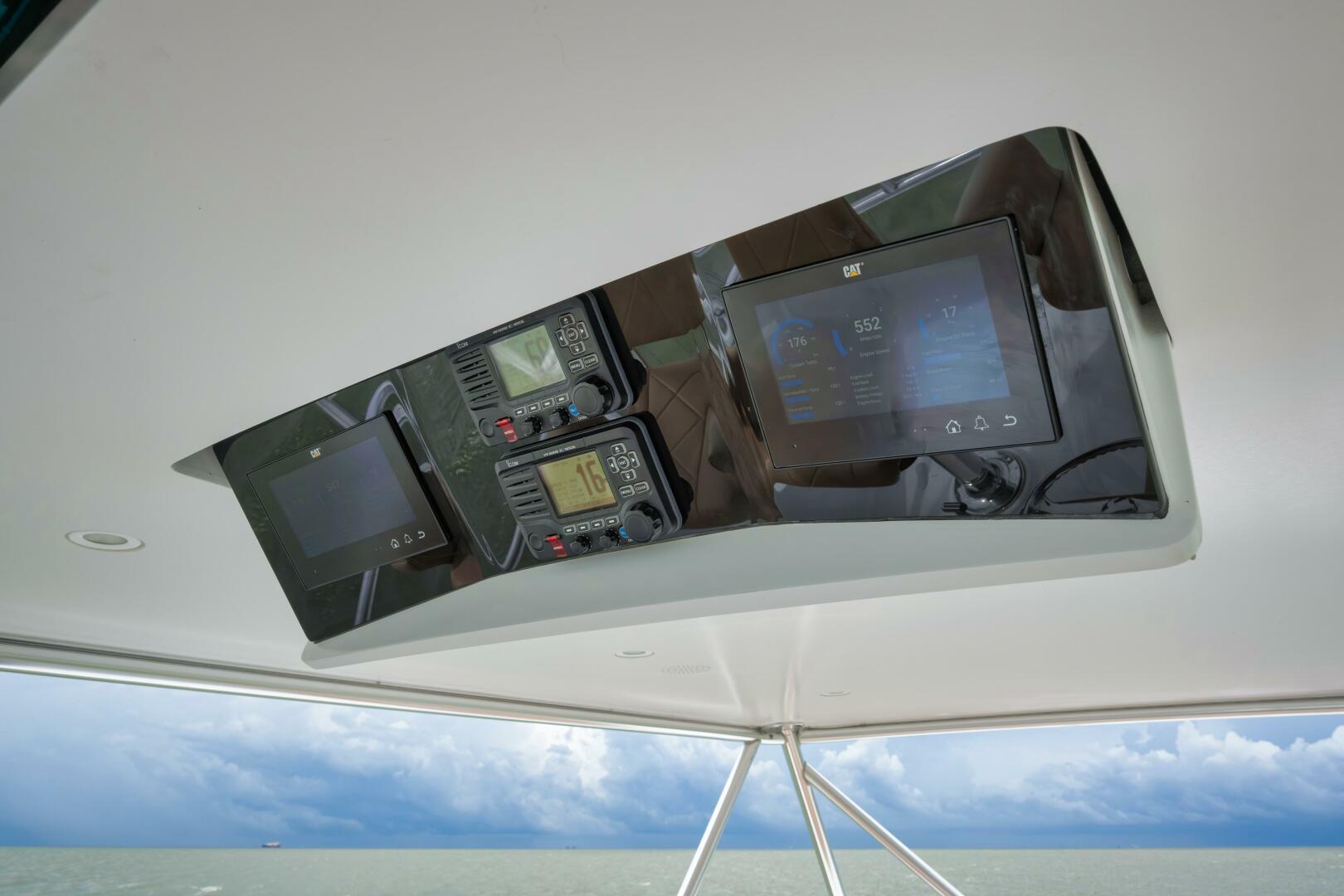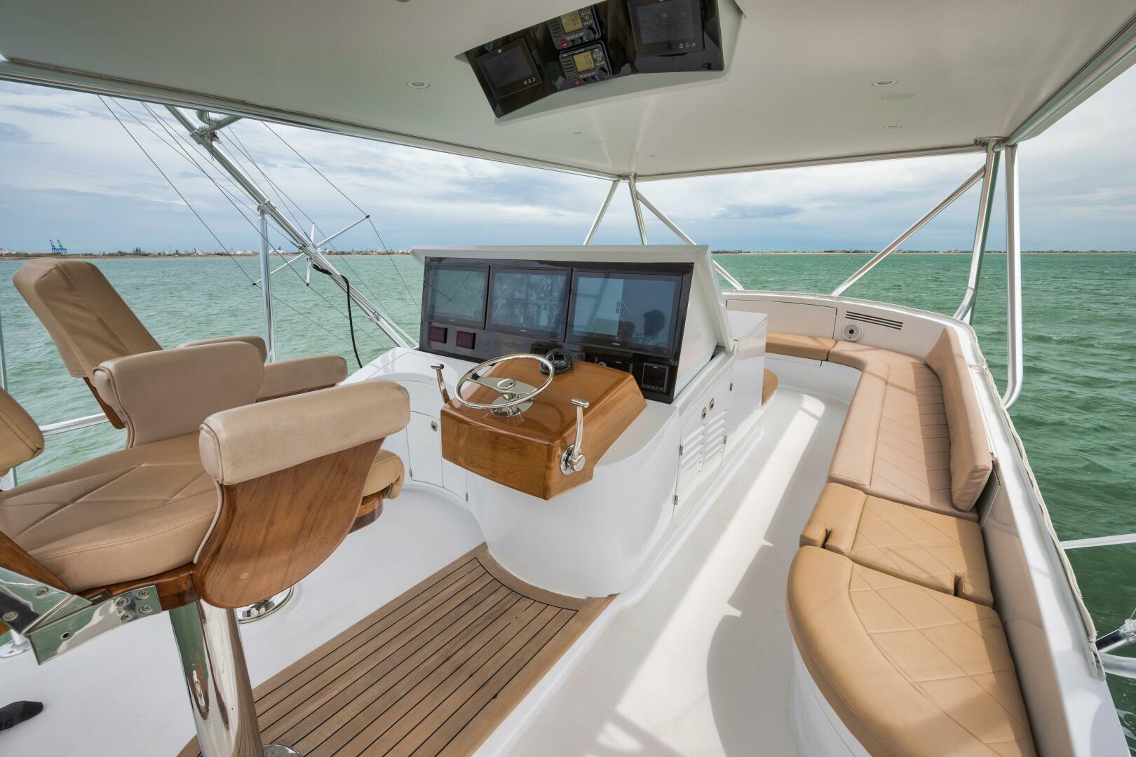 Flybridge(2) 8" CAT Engine Displays Mounted in Hardtop Actuating Box (2024) (2) ICOM VHF Mounted In Hardtop Actuating Box Wrap Around Forward Bridge Seating (Ample Storage Below) w/ Diamond Imprint (Sunbrella Cushions) Recovered (2022) NEW Oversized Chest Freezer (2023) Oversized Refrigerated Drink Box (2023) Teak Bluewater Helm Chairs Teak Helm Pod Teak Step up Platform at Helm Stainless Steel Marine Wheel New ZF Controls Electric Actuating Overhead Box w/ CAT Displays & ICOM VHF Acrylic Enclosure New 2015 Teaser Reels in Over Head (2) US-9R Miya Epoch (2) US15R Miya Epoch (8) Tri Color LED Lights Backup Control System (Rexroth) AC/DC Breaker Panel Underneath Helm Satin White Underside of Hardtop Rigid Curved 55" LED Light Bar (3) Lumitec Spreader Lights