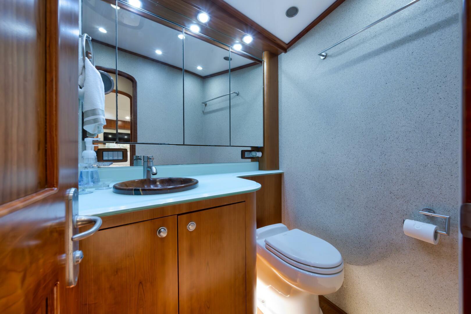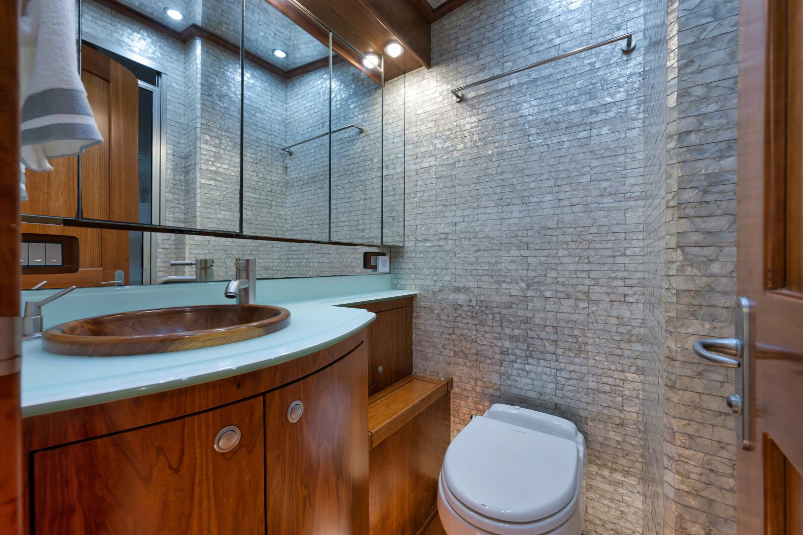 Master Stateroom HeadNEW 2020 Macerator Head System Mother of Pearl Wall Covering Brushed Nickel Fixtures Full Shower w/ Two Shower Heads Cherry Wood Floor Mesquite Wood Sink Basin NEW Sink Hardware (2022)