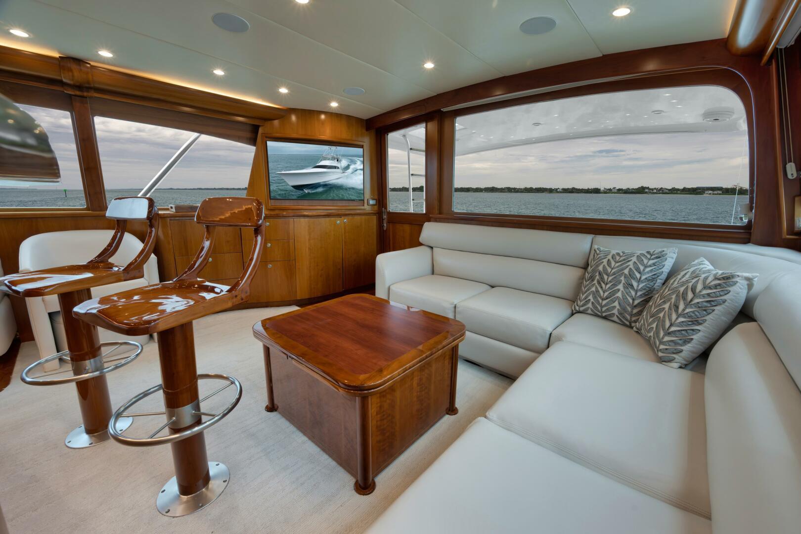 NEW Upholstery throughout (2022) NEW Carpeting throughout (2024) NEW Cherry Floor Entry (2024) NEW Headliner (2020) NEW LED Lumitec Lighting Throughout Entire Cabin NEW Valance Lighting NEW Surround Sound System w/ Amplifier (2020) NEW Recovered Custom L Shaped Couch w/ Storage (2024) Release Marine Hi/Lo Table w/ Storage Sound Down installed Below Carpet Insulation Custom Cherry Wood Cabinets Release Marine Bar Stools (2) (1) Cigar Chair Upholstered To Match Dinette + Salon Sofa 50” Samsung Smart TV Electrical Panel to Starboard AV Cabinet to Starboard