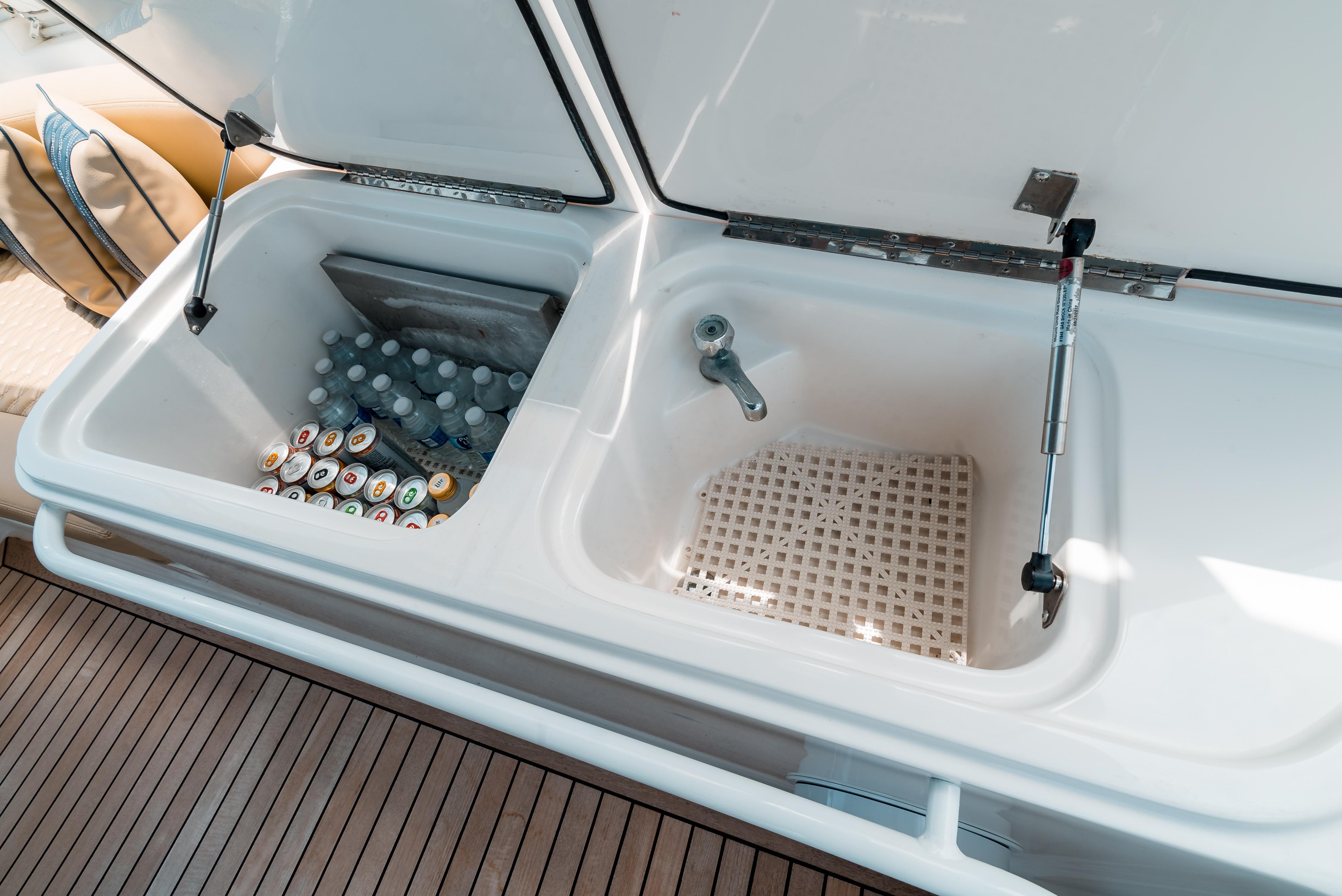 - Stbd Bench with Freezer Beneath, Fusion Stereo, and Enclosed Rod Storage Behind