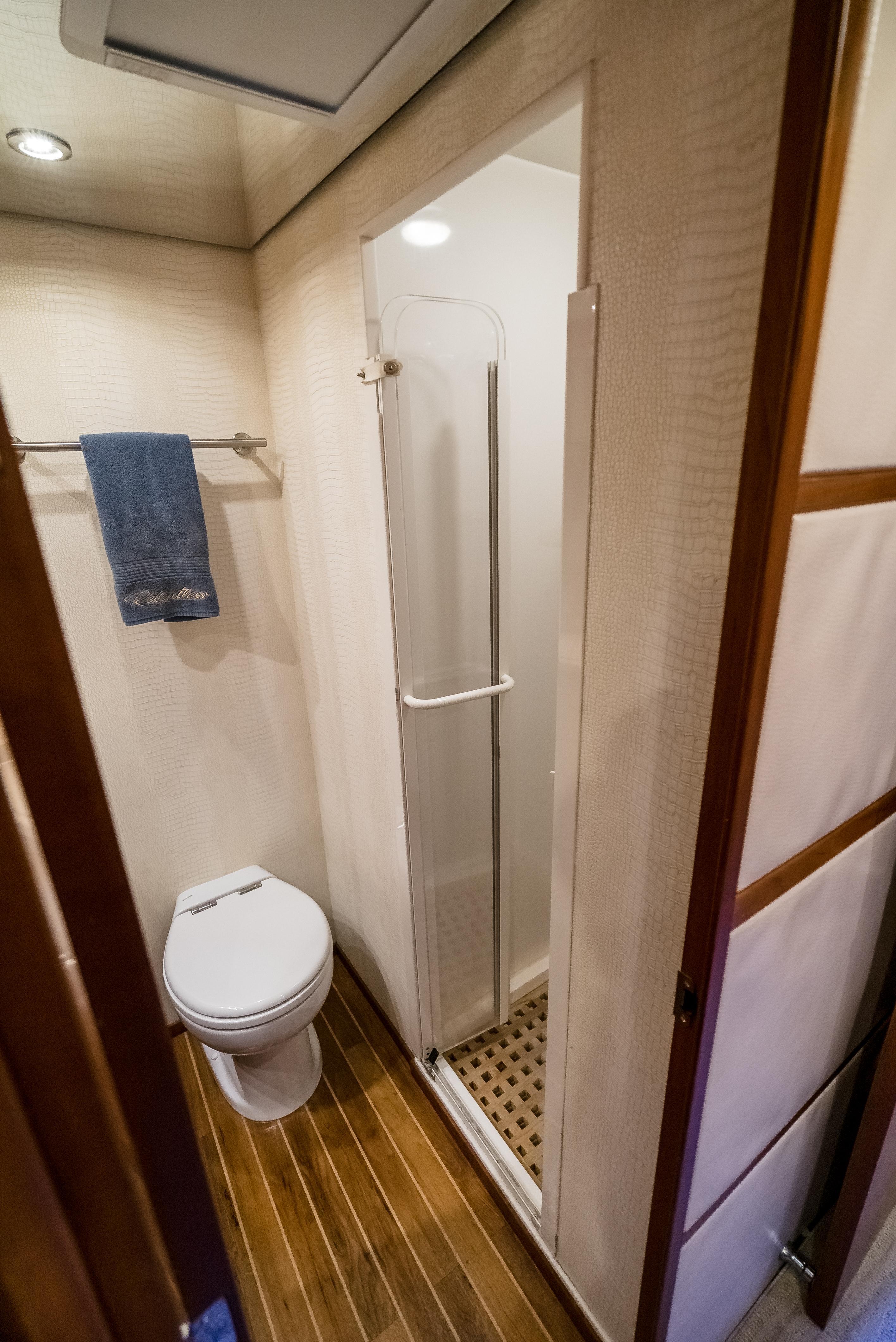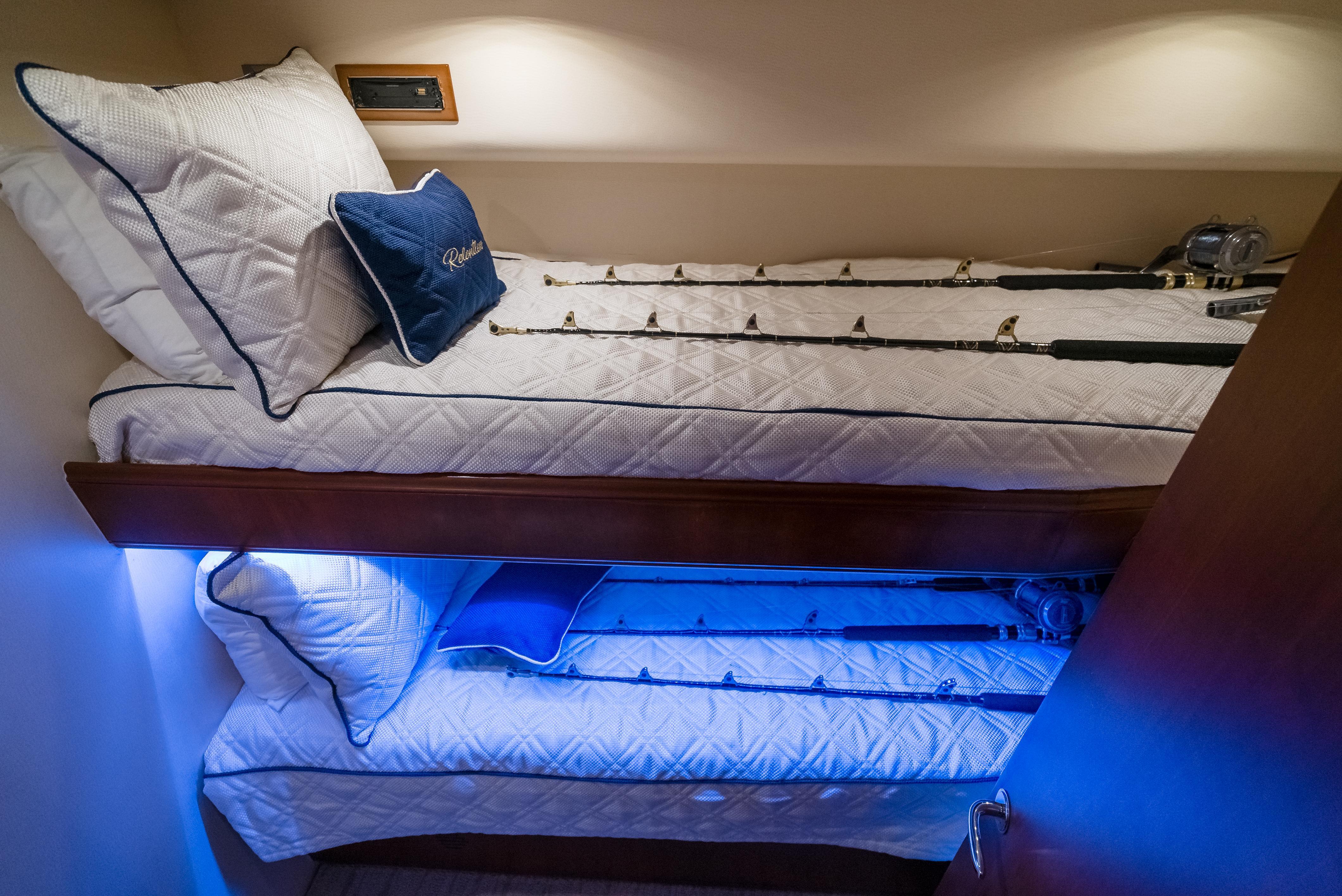 All the cushions have been done with custom stitching. To starboard is enclosed rod storage, sink and refrigerator. To port is a large hi-lo table and seating.The hardtops on both the flybridge and tower have been painted in anti-glare matte finish to match the hull color.