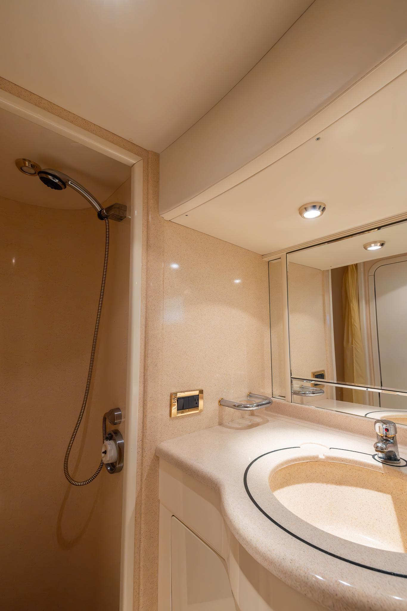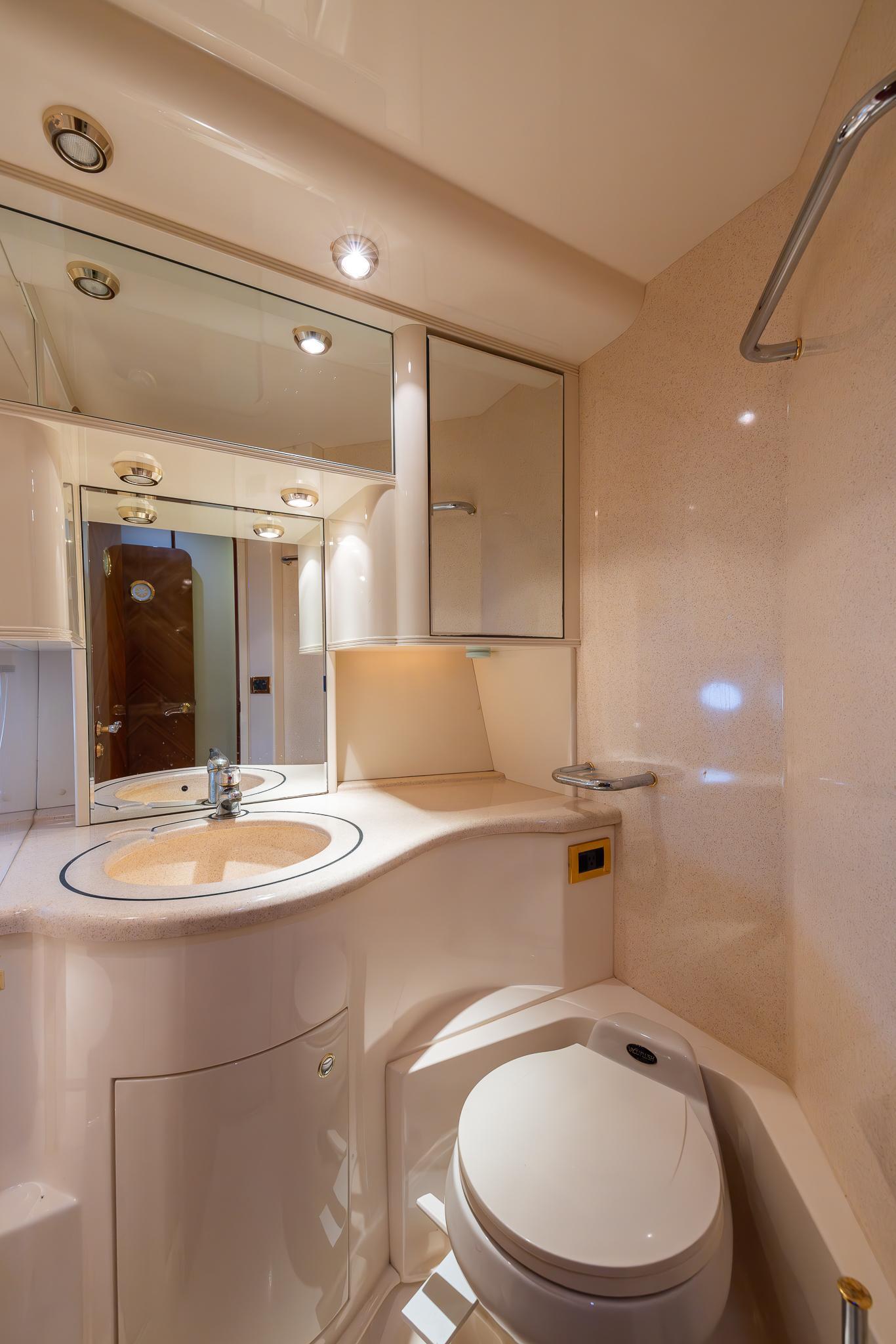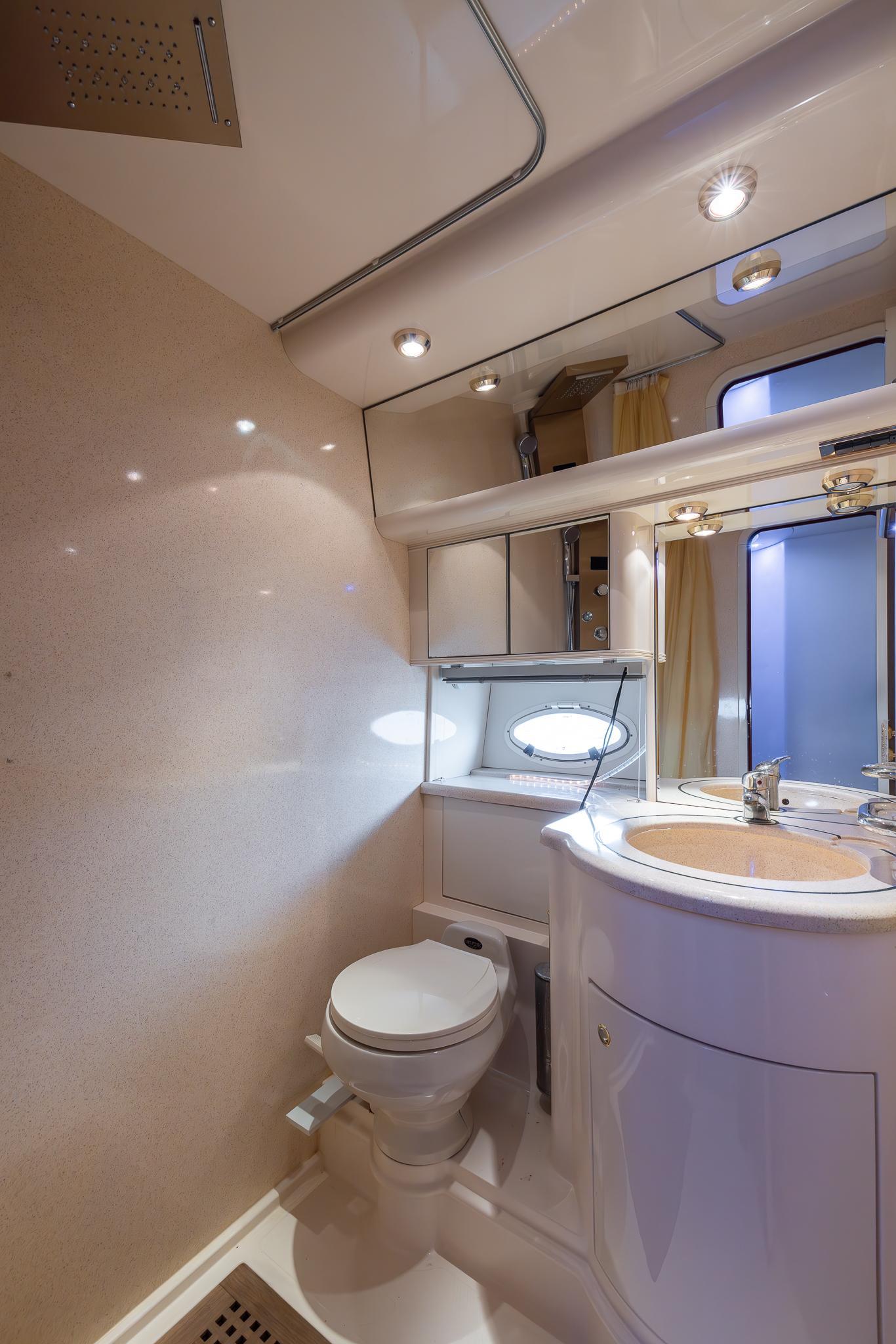 The flybridge of the Azimut 58 is equipped with a built-in sink, fridge, and barbecue - ideal for an enjoyable open air snack. The spacious saloon provides a dining table that can be converted into an extra coffee table if required. The 58 also has an ergonomic wheelhouse abaft of the saloon. The helm seat adjusts electrically to eight different positions - an exclusive feature of the 58. The owner's stateroom is elegant and roomy, with three large wardrobes and a bedside table, offering all the comforts of a large bedroom. The Azimut 58 also offers a VIP stateroom.