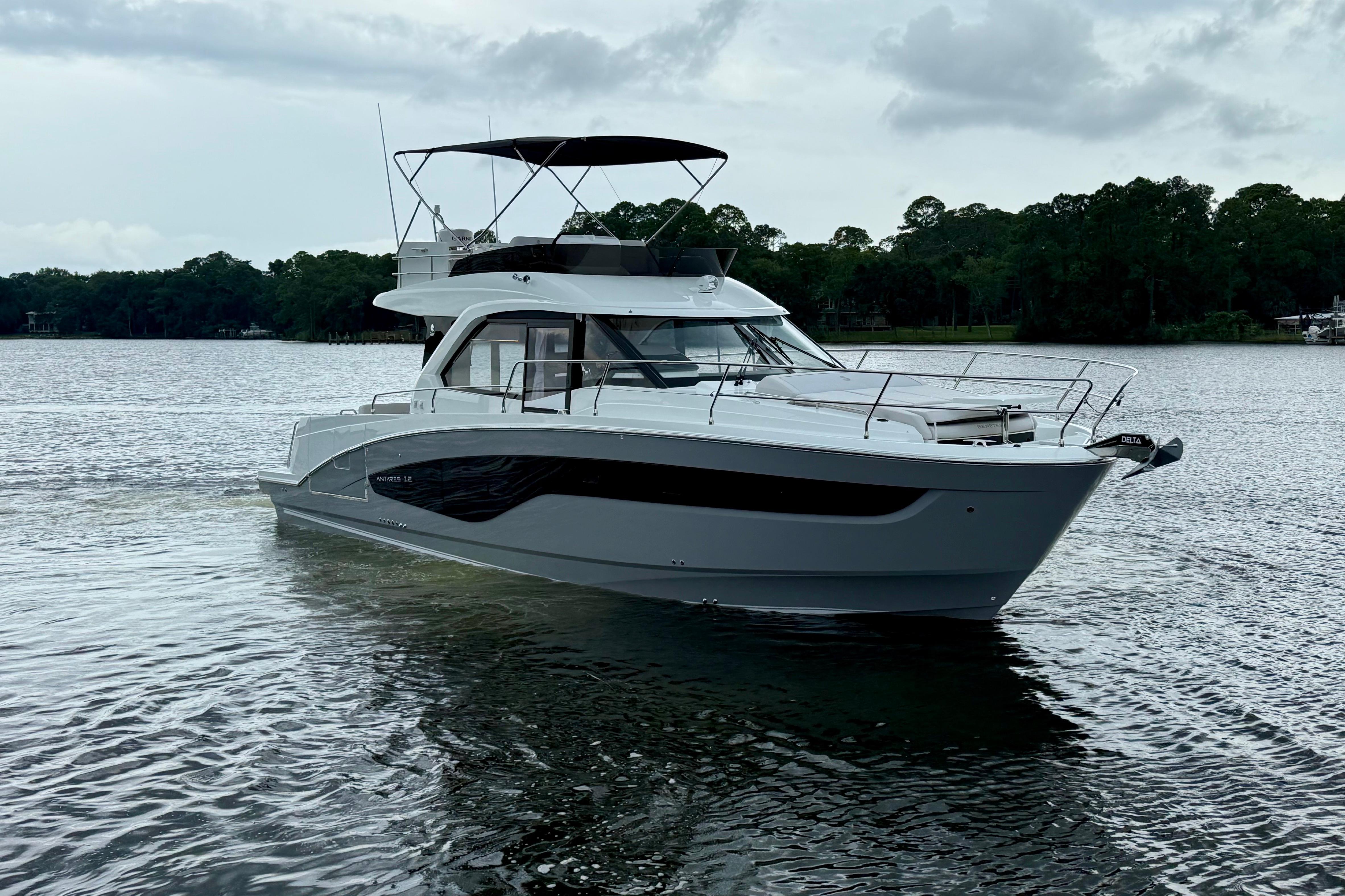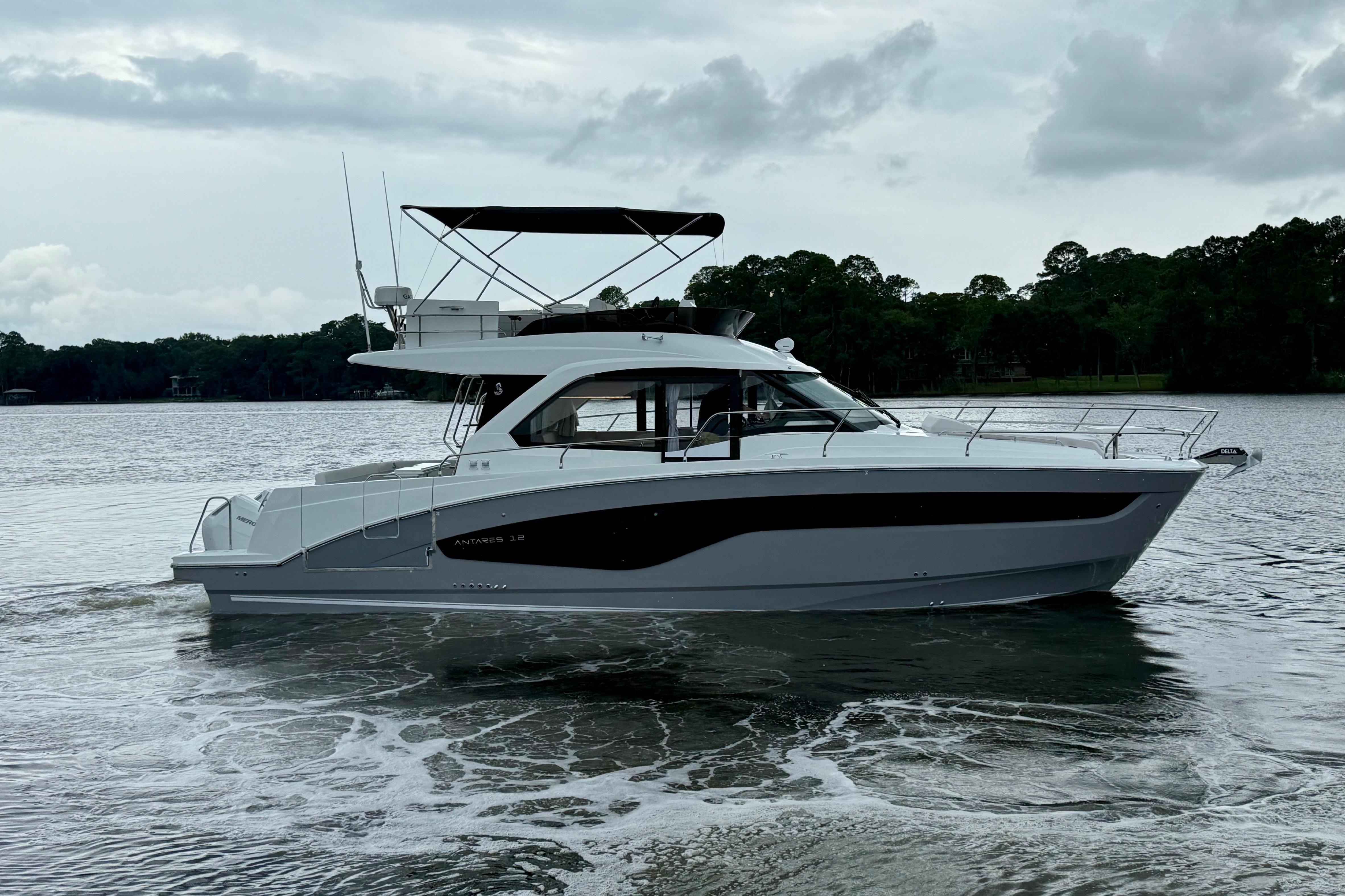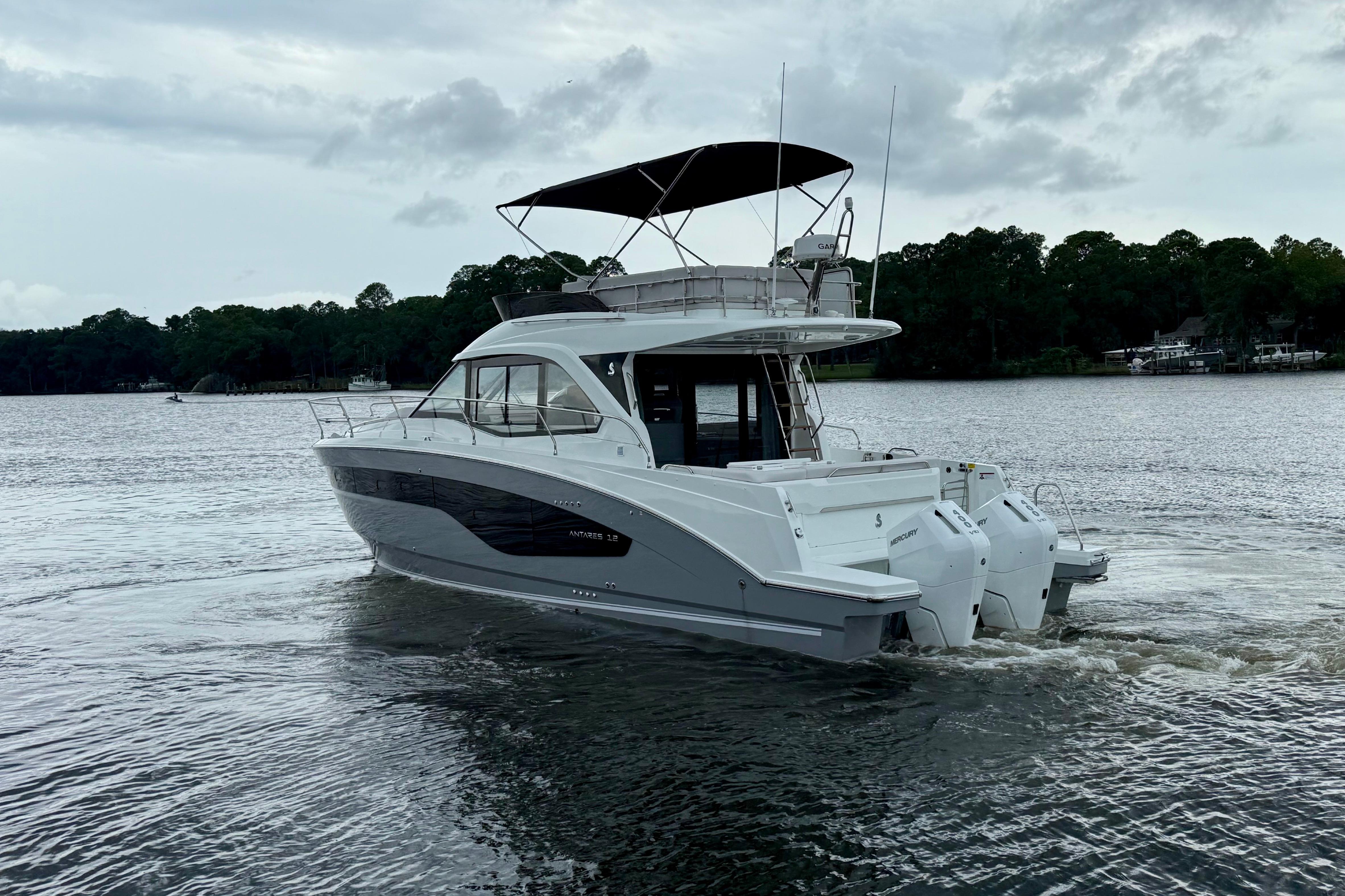 Well equipped and ready to cruise or complete America's Great Loop. We are the Beneteau outfitting professionals, we can add Starlink, Solar, Dingy Rack, Ceramic Coating, Water Maker, Window Tint and many other accessories to your new Antares 12. Our upfront pricing includes full tank of fuel, all required USCG safety equipment, basic boating gear and on-water orientation with no hidden fees. We accept trades and have competitive financing available. Give us a call today to reserve this incoming Antares 12 and beat the upcoming price increases!Options on Vessel:Twin Mercury 400hp Outboards w. Joystick PilotingUS PackageUpgraded Electronics PackageUpgraded Sound PackageMooring/Anchoring KitFiberglass Cockpit TableFiberglass Foredeck TableBow ThrusterSeaKeeperAdditional Refrigerator in 3rd Cabin (3 Refrigerators Total Onboard)MicrowaveChina Set, 6 SettingZipwake SystemPearl Grey Hull ColorTV AntennaRear Facing Garmin CameraGarmin Radar The new Antares flagship is loyal to the identity and history developed by its predecessors. The Antares 12 is a remarkable step forward in terms of equipment, comfort on board, spaciousness and elegance. Wherever you go, your family will love its versatility and widely recognized style.