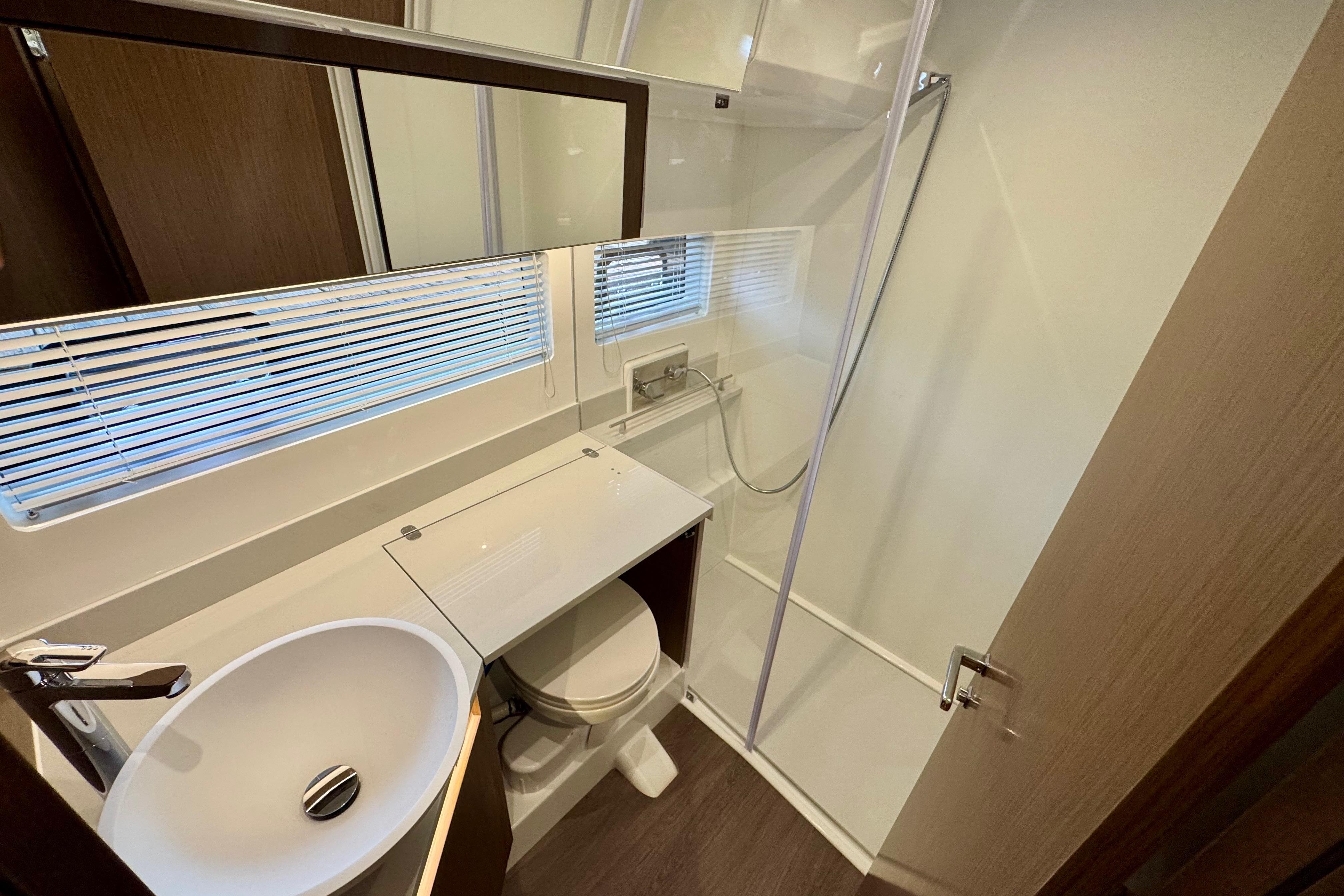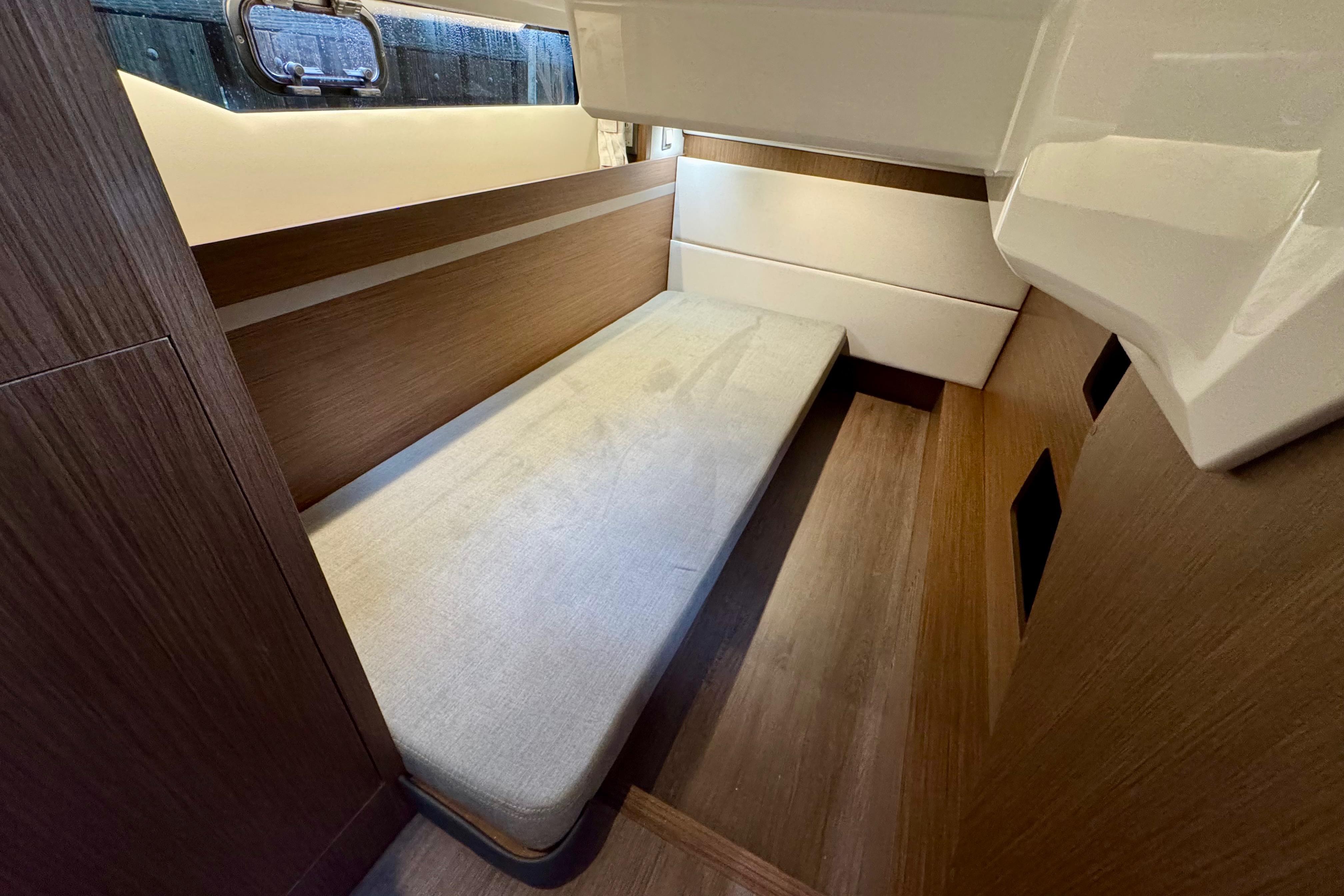The boat has three outdoor lounge areas: the cockpit, the forward sun pad and a vast flybridge with a corner sofa and a fully fitted outdoor galley cabinet. The Antares 12 stands out for the quality of its materials and trims, not to mention its stylish, generous interior spaces. The wheelhouse is a central living space with a panoramic view of the ocean. The fully fitted galley allows you to give free rein to your culinary creativity. The lounge with facing seats is a great place to enjoy good company. The indirect lighting, elegant upholstery and lacquered furniture create a peaceful atmosphere, where you can relax and contemplate the surroundings. Everyone’s privacy is maintained aboard: the owner cabin is spacious and bright, and has its own ensuite bathroom, as does the VIP guest cabin. A highly modular third cabin can be used as single or double berth, easily becoming the extra storage any owner needs.With the wheelhouse’s convertible salon, the boat can accommodate up to eight people for a pleasant night on board.
