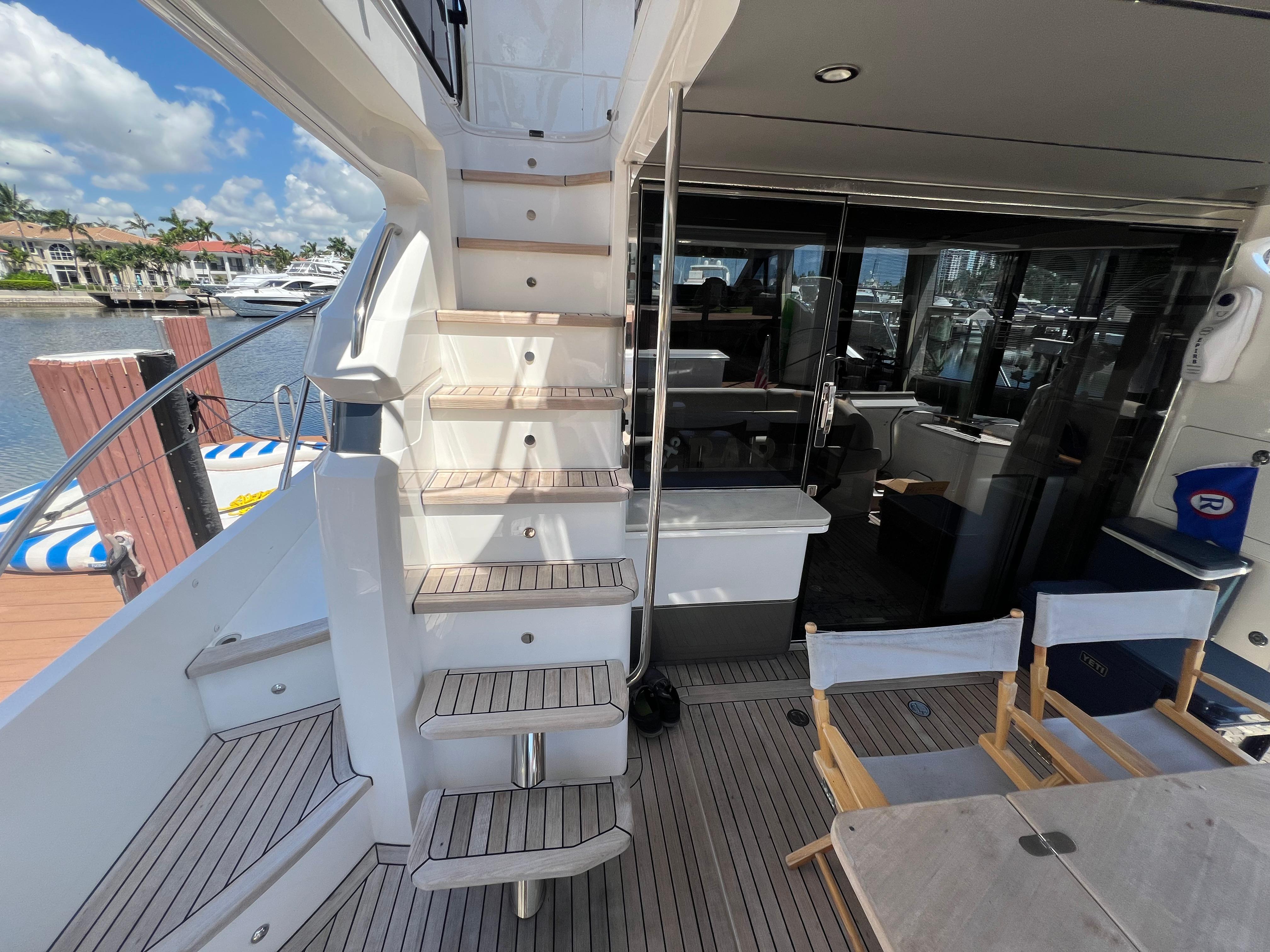 - Teak-laid transom platform, cockpit deck, flybridge stairway and steps to side deck