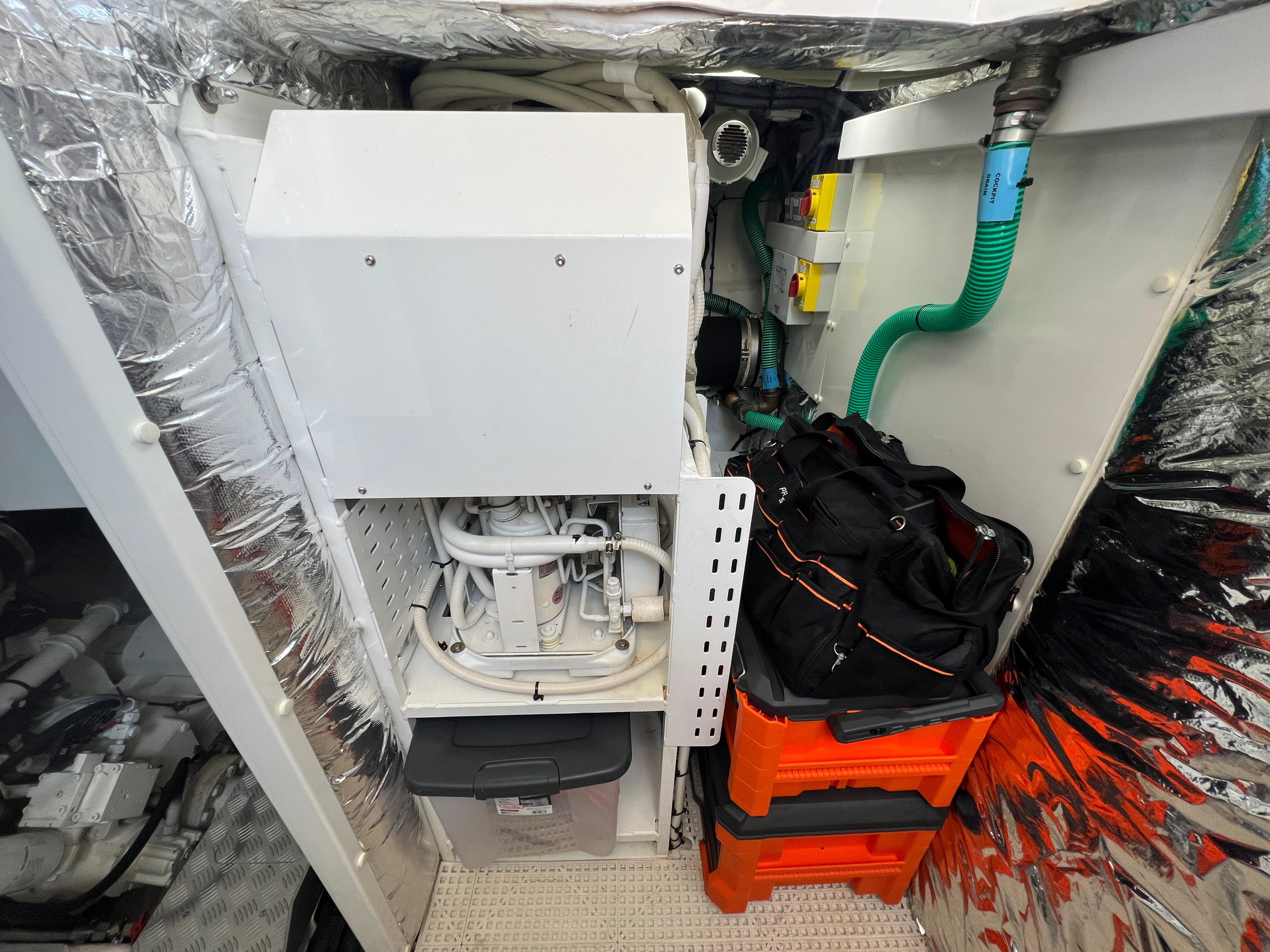 - Lockable gas strut assisted hatch to engine room, lazarette and optional crew cabin