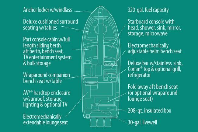 - Hardtop - AV2™ hardtop enclosure w/aluminum painted frame, electronically sliding sunroof w/screen & shade, storage net, spreader lights, down lights, storage and first aid kit compartments (2), outrigger plates, horizontal hanging rod holders (4), Clear2Sea™ side curtains (ivory) & Sureshade® retractable shade with Sunbrella® canvas (tan)