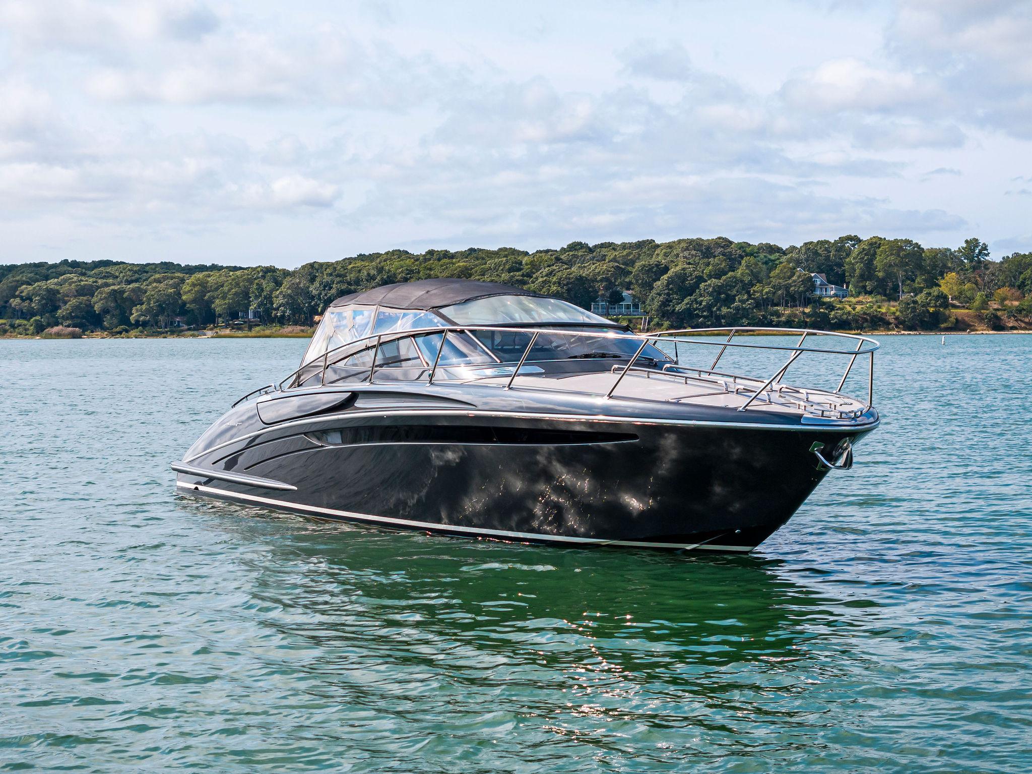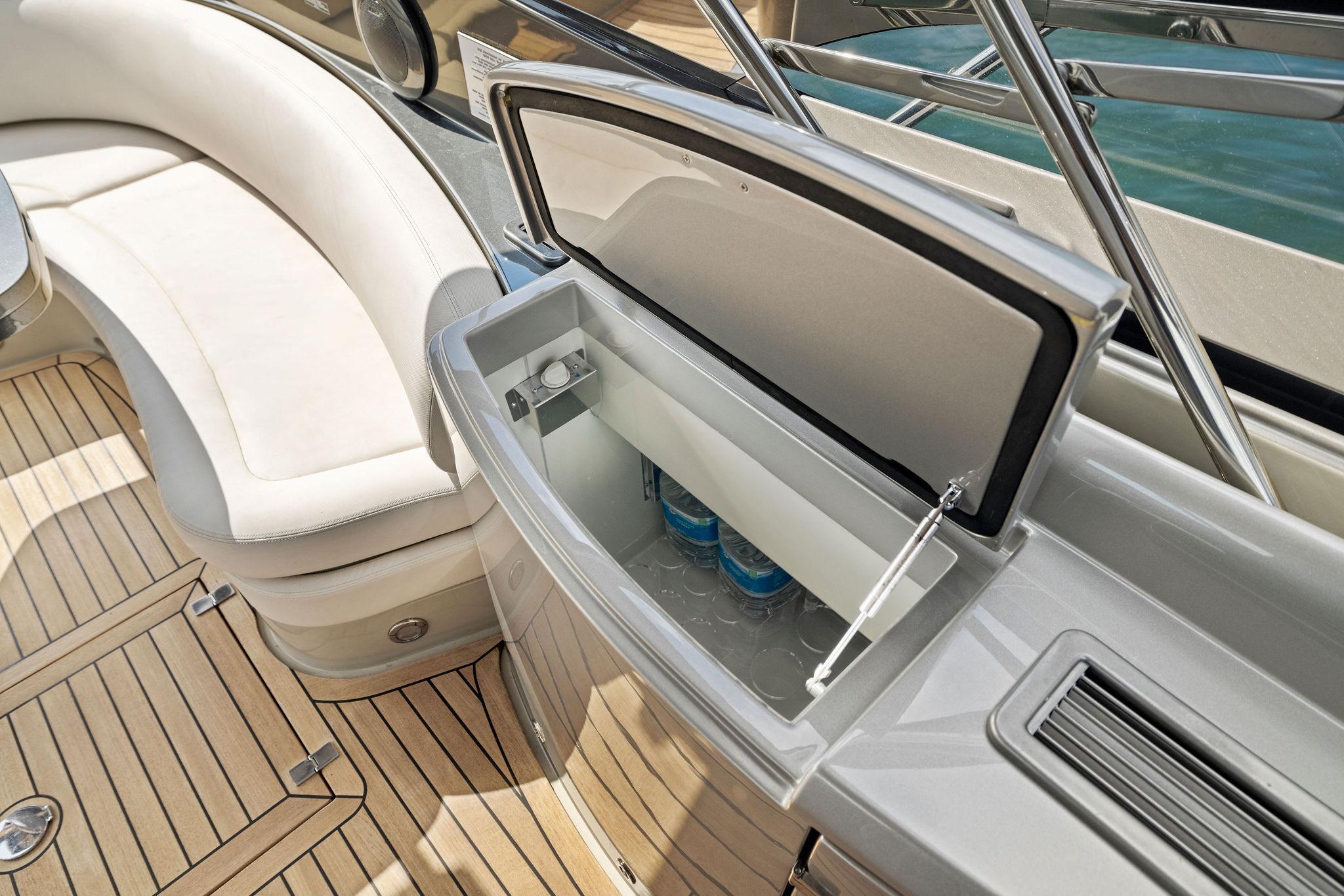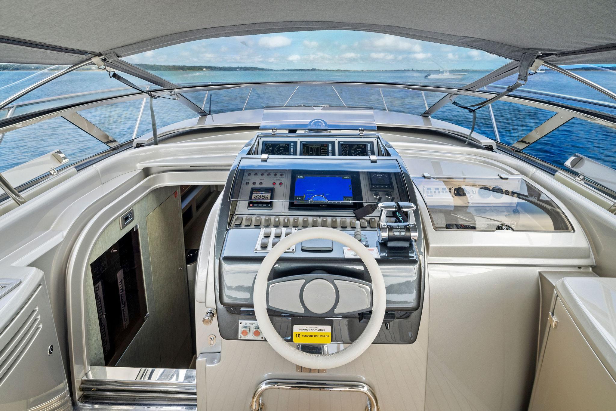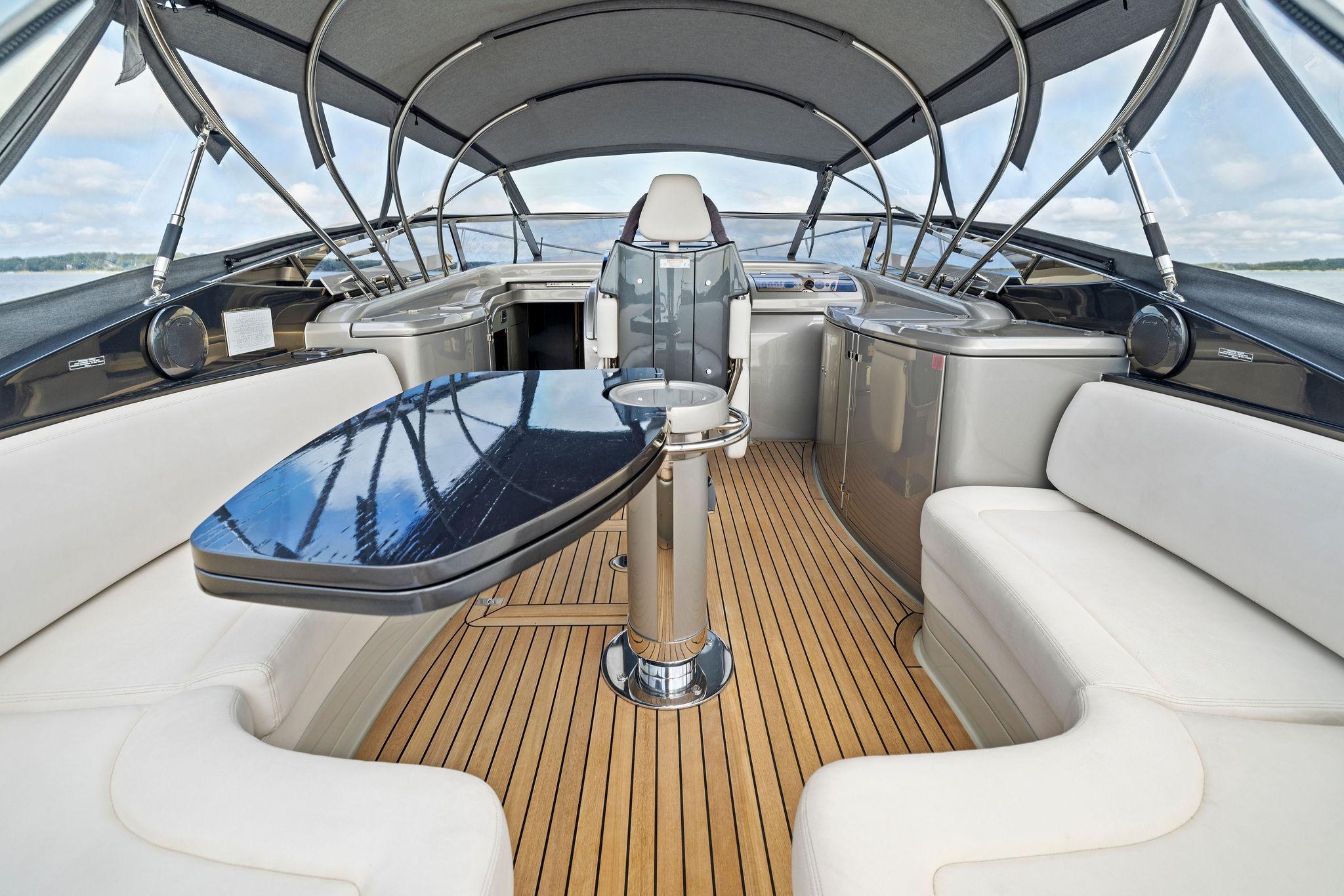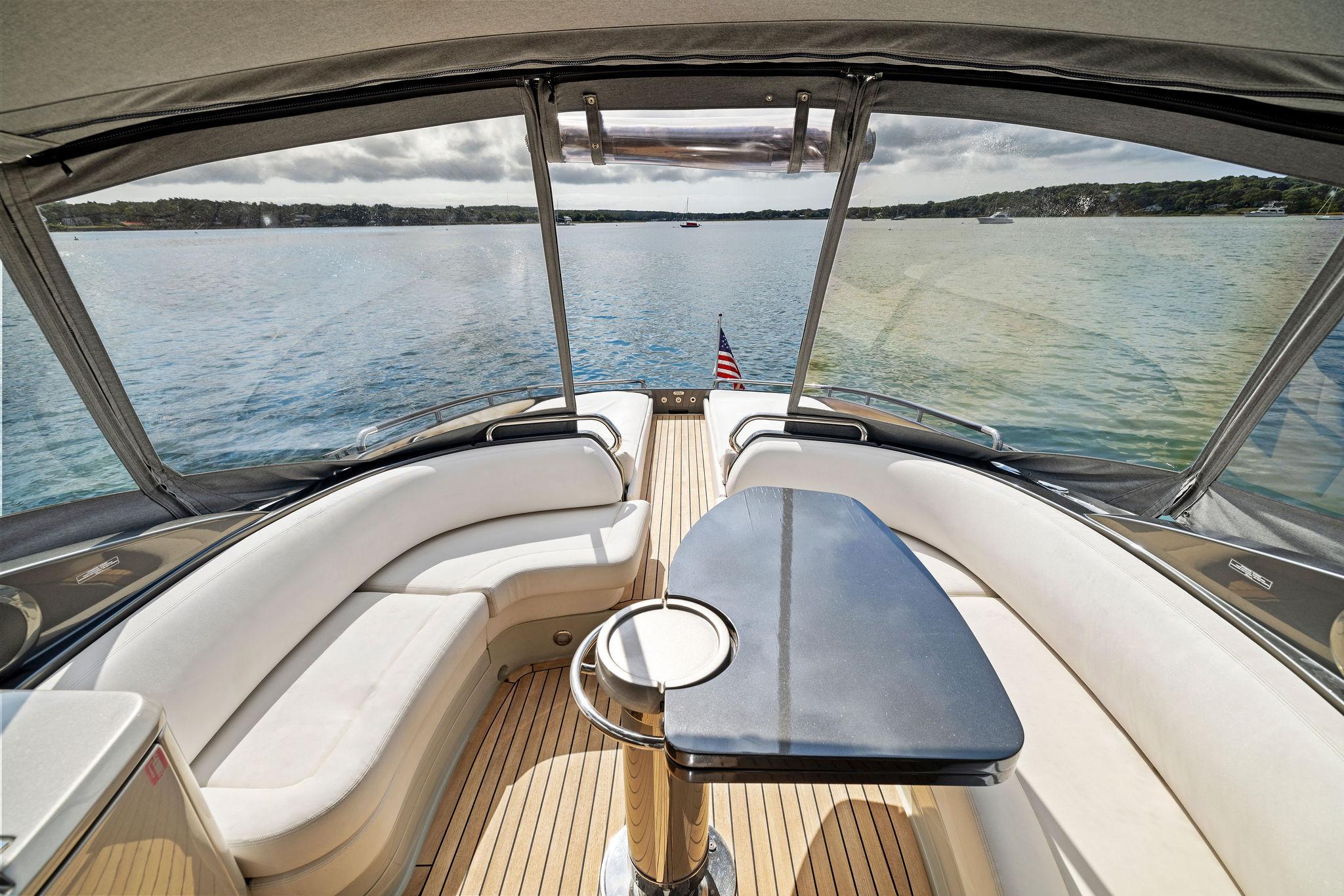 Her climate controlled cockpit area is surrounded by full 360 degree views and plenty of plush seating options. Two L-shaped sofas are to port and starboard with a folding dinette table that provide seating for 4-6 adults comfortably. Moving forward to port is a refrigerated drink box as well as an ice maker and access to the helm AC unit. On the Starboard side is access to the crew/guest quarters followed by (2) large storage areas. Centerline her helm chair transforms into seating for up to (3) adults and all of the ships electronics and controls are within arms reach. The cabin entry is forward and to port. A retractable bimini top warped in new Sunbrella is overhead and designed to collapse and recess in the down position. A wrap-around windshield is constructed of a single section braced in a oversized frame providing unobstructed visibility and efficiently deflecting wind from the cockpit.