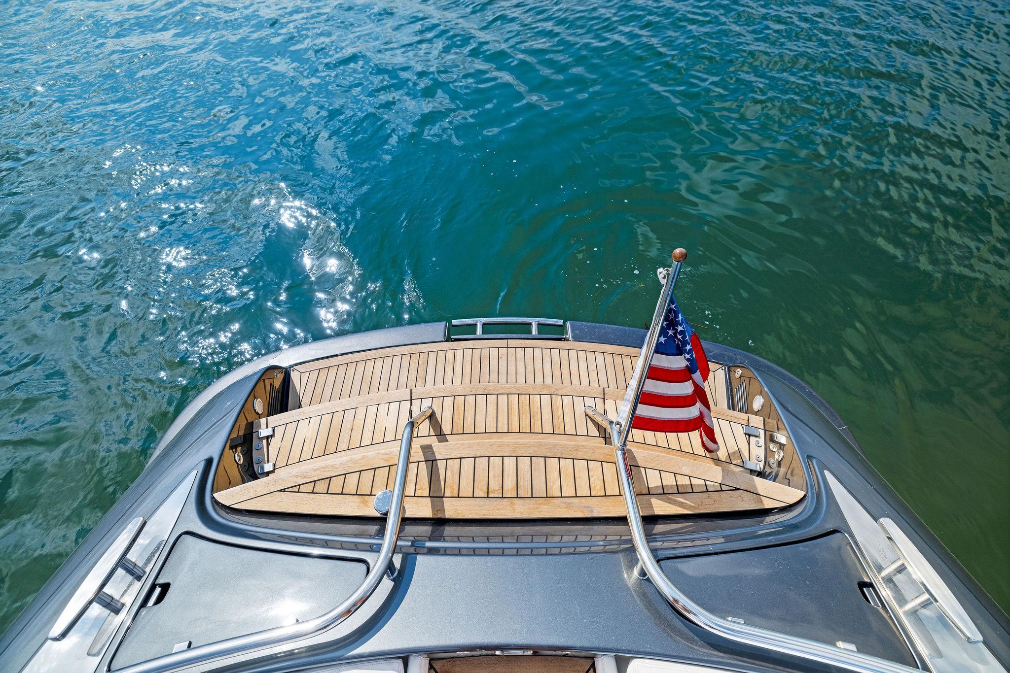 The teak veneer was removed from the bow and replaced with custom made fiberglass panels and coated with a matching non-skid finish. Stainless handrails were added to make the transition from the cockpit to the bow much safer and stable. On the aft deck are matching sunpads that raise on electric actuators to access the engine room and mechanical area. On the transom you will find a freshwater hot/cold shower, Shore power hook up and line storage. Hidden centerline is a retractable passerelle controlled at the helm. Just below on the water line is where the hydraulic actuated swim ladder is located. All the way forward you will find the ships ground tackle and anchor locker.