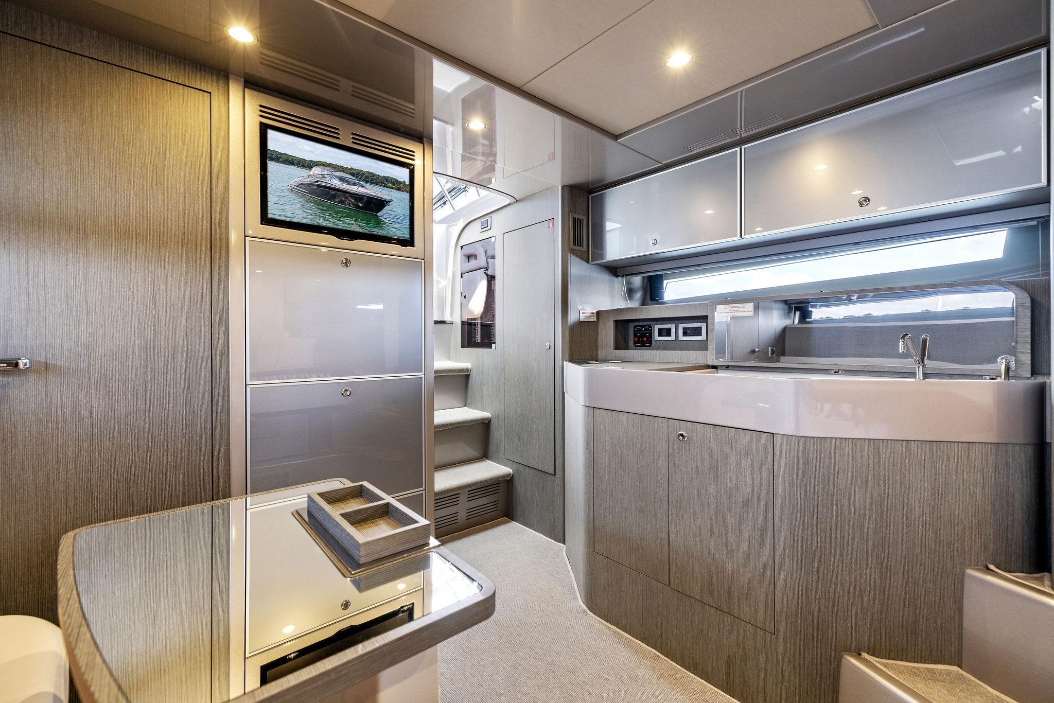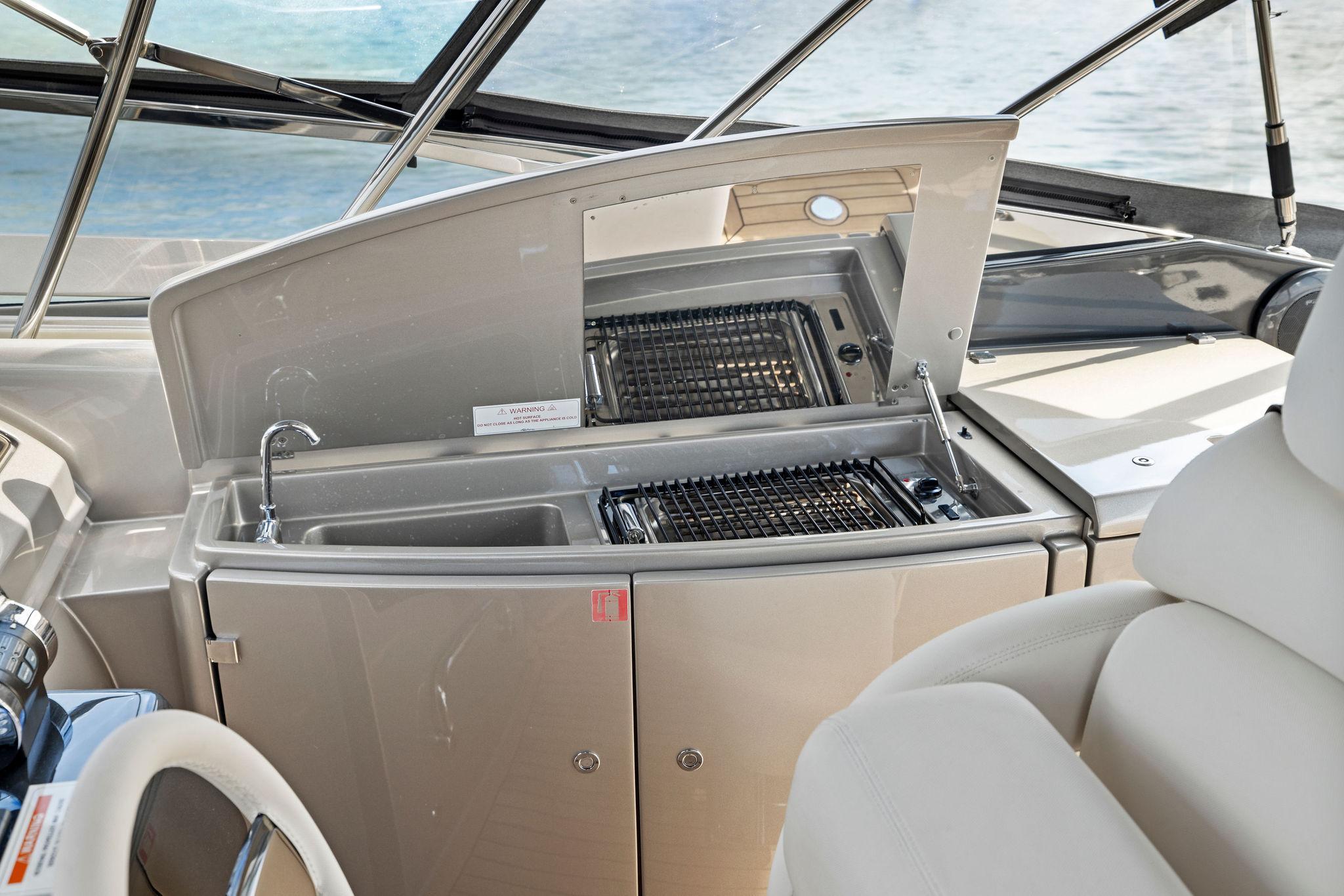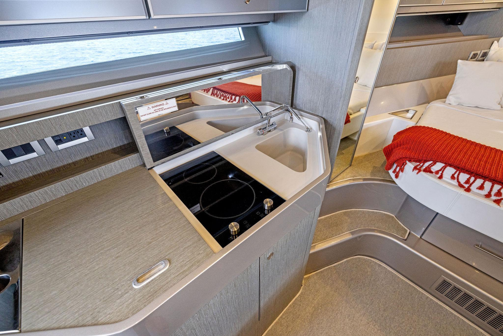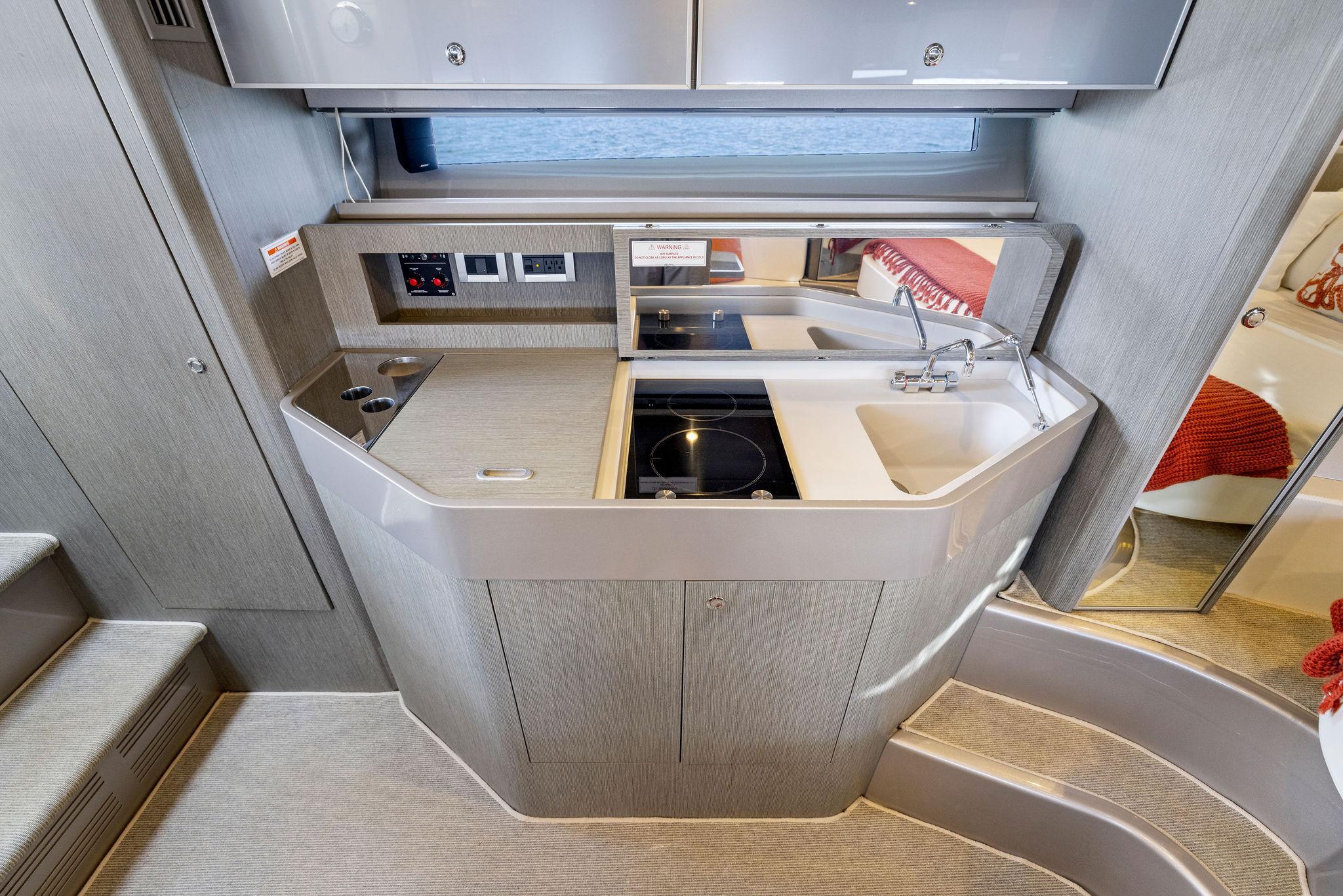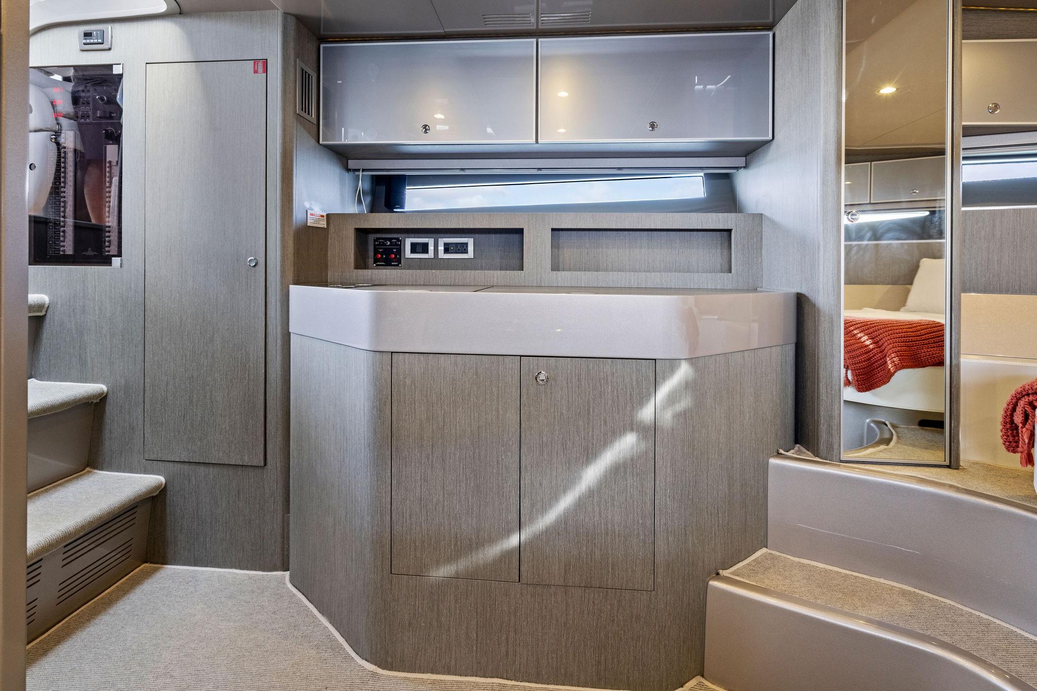 As you first enter into the main cabin to port you will immediately come to the ships AC/DC breaker panel followed by a large hanging locker and the ships galley. Luxurious amenities surround the space and include the following:
