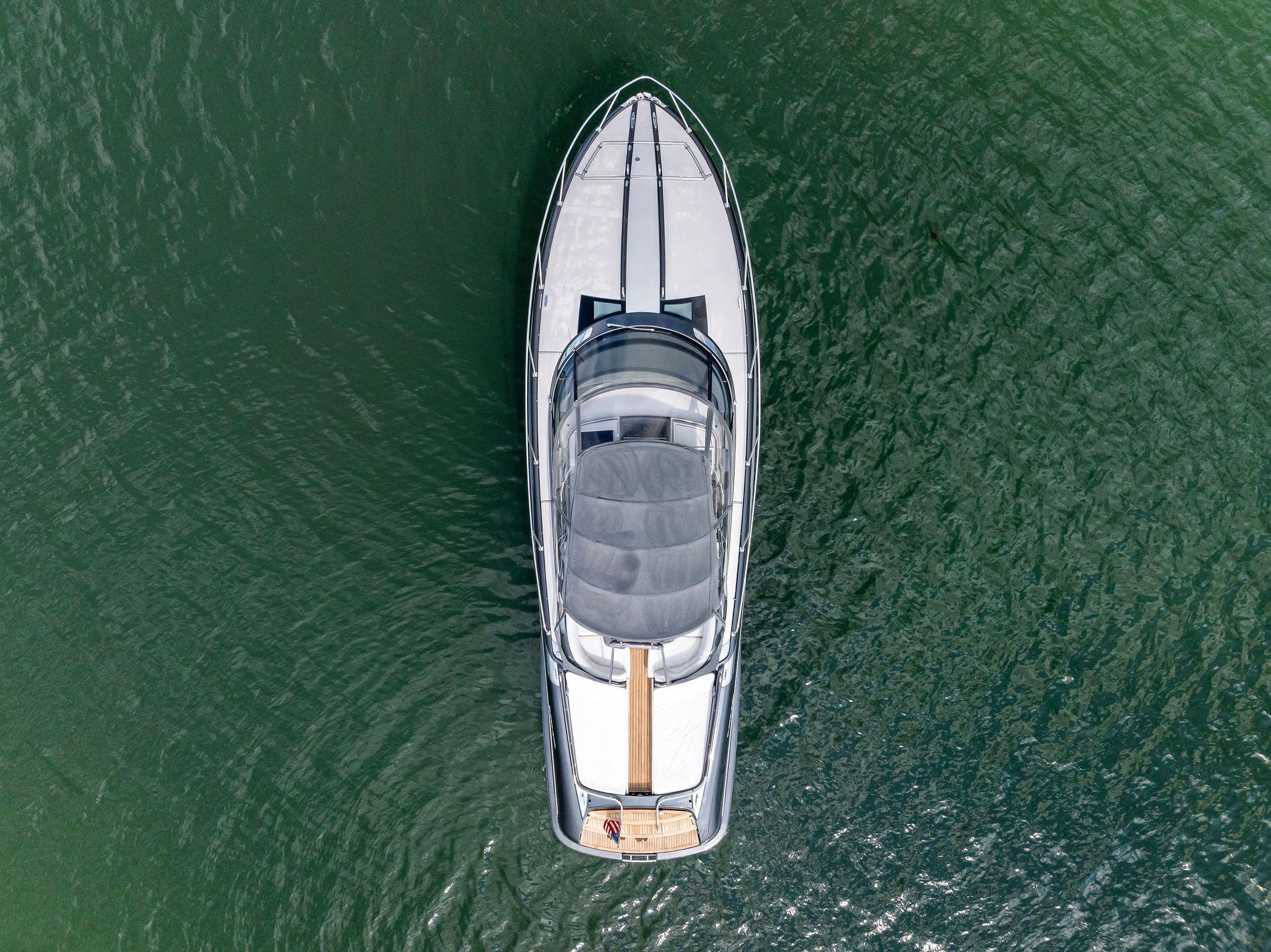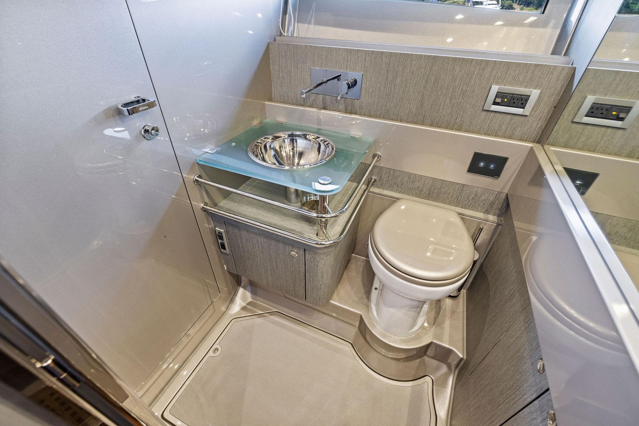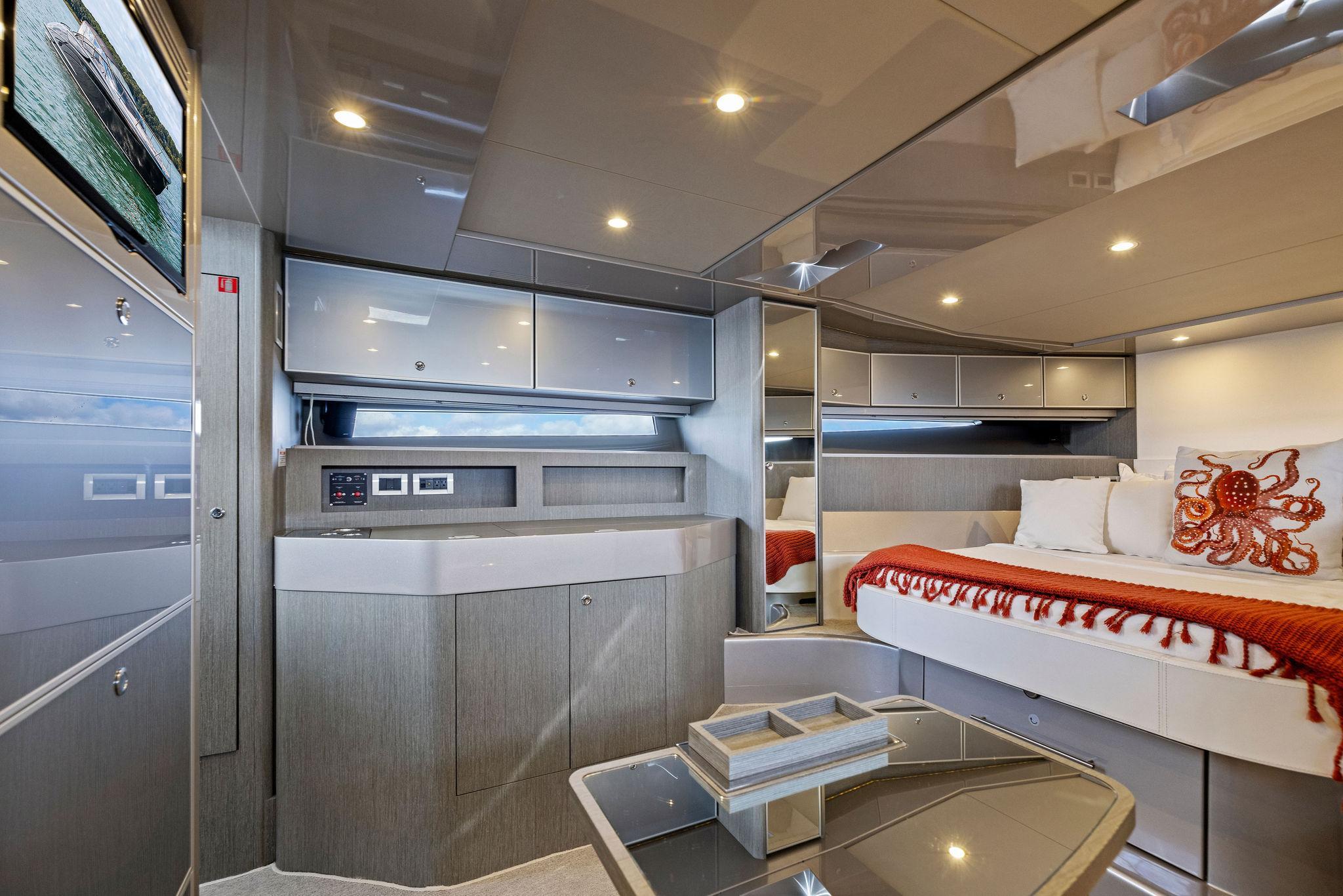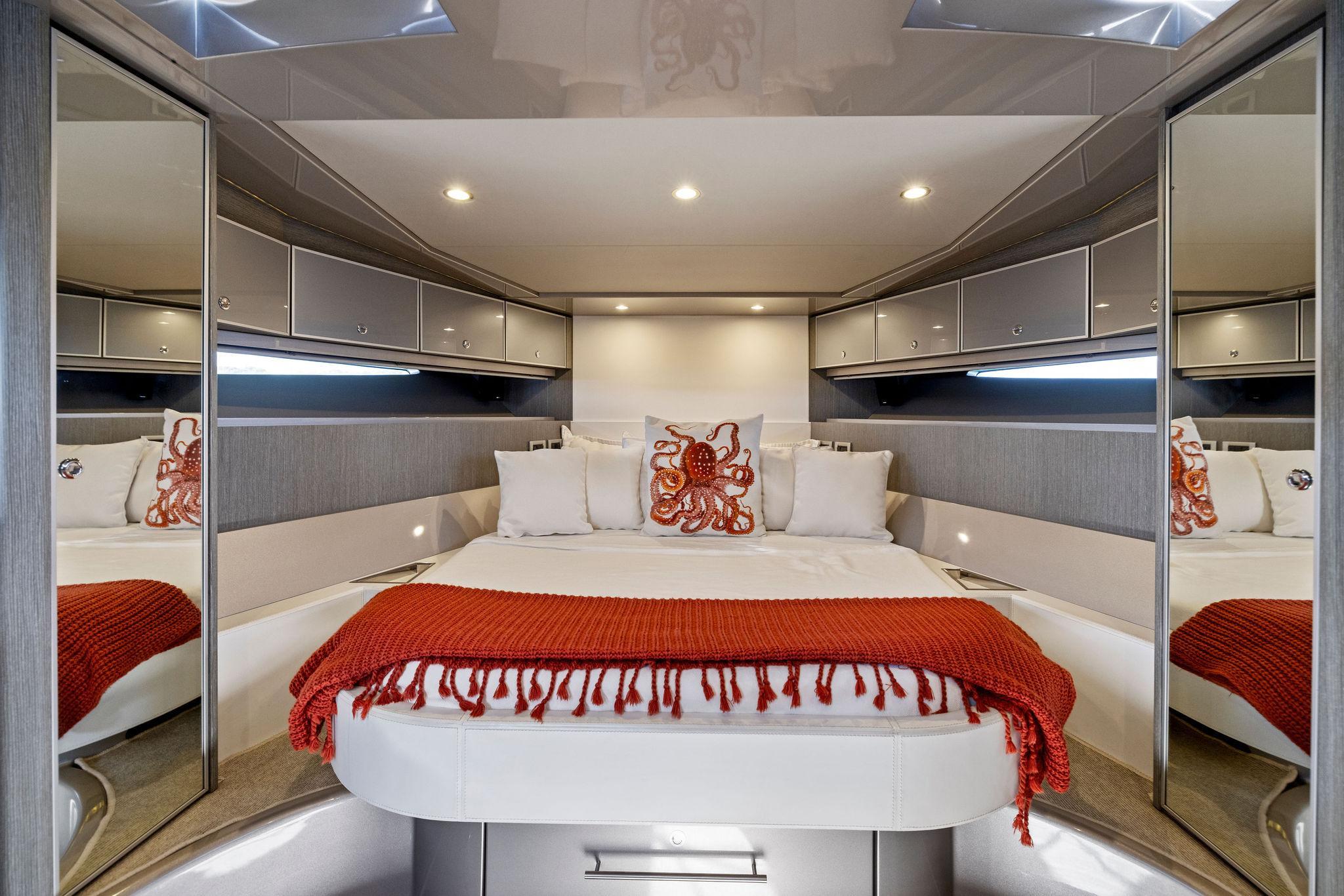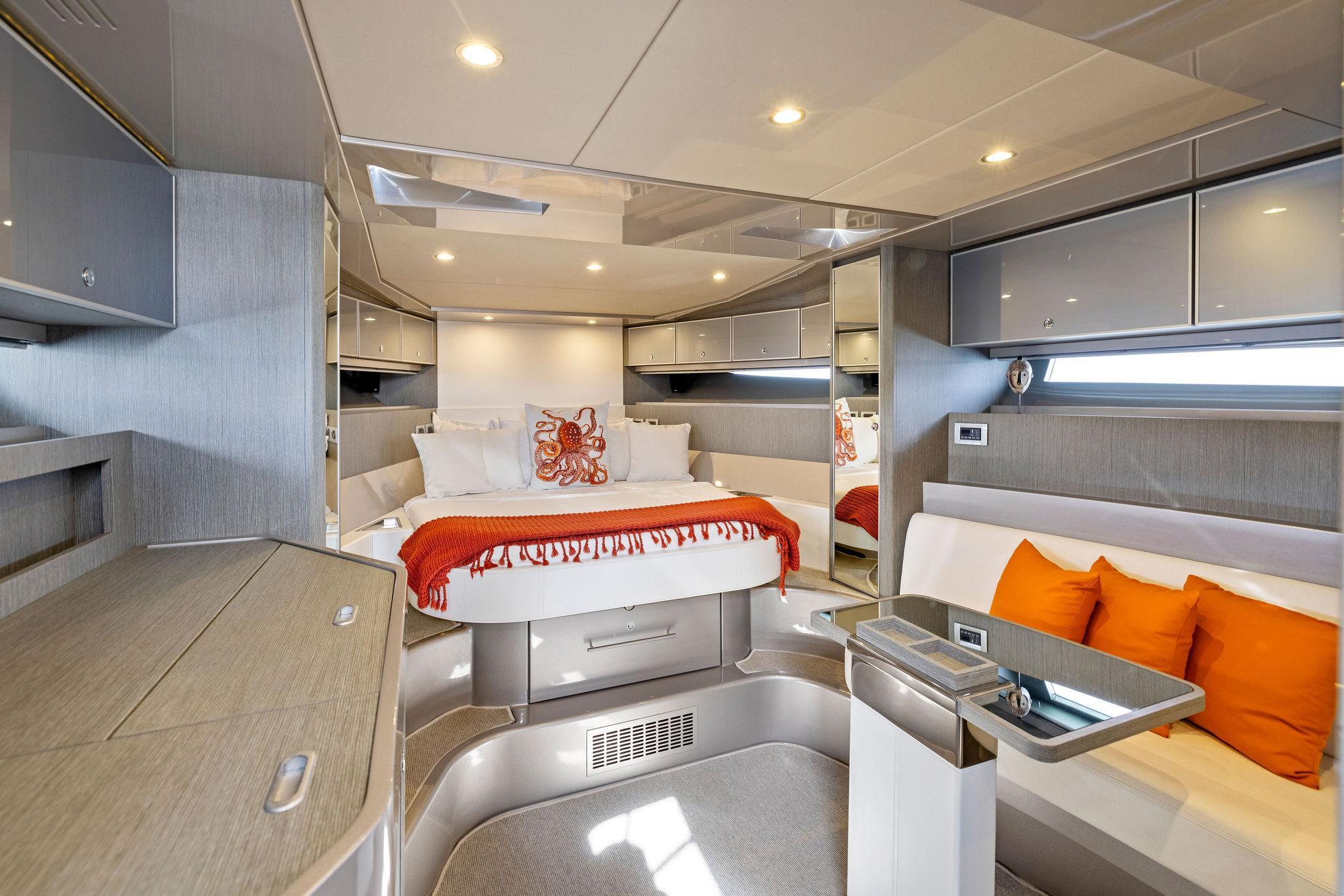 Located on the starboard side adjacent to the galley is the ships salon area. Setting the stakes high standard on all 44 Rivarama's are a wine chiller, four place settings of Richard Ginori porcelain china, Riva silver-plated cutlery, glasses for 12 and two sets of monogrammed linens. The cutlery is lined in an upholstered drawer and the china and stemware are stowed in separate custom cabinet areas. Access to the "night area" and the cabins main head are accessed through the salon area. A full AV package is included featuring a Bose surround sound stereo and sound docking station. Her 6'2" headroom leaves plenty of headroom and create a sense of more space. Her interior is cooled by 23,000 btu's of air-conditioning. Her Walnut interior is filled with Ample storage and the perfect lighting reminding guest and owners of the quality and fit and finish the Rivarama exudes. Aft you will find the ship's main head and shower. Designed with a large separate stall style shower her style is eclectic. Mirrors line the walls and a glass countertop with recessed sink finish the area. Forward in the "Night Area" features an island queen walk around berth and plenty of stowage. Below the berth is where you will find a large slide out drawer where the ships luggage can be stowed in her custom embroidered suitcase (included). Port and starboard are hanging lockers and (8) overhead storage cabinets providing plenty of space for personal belongings and linens.