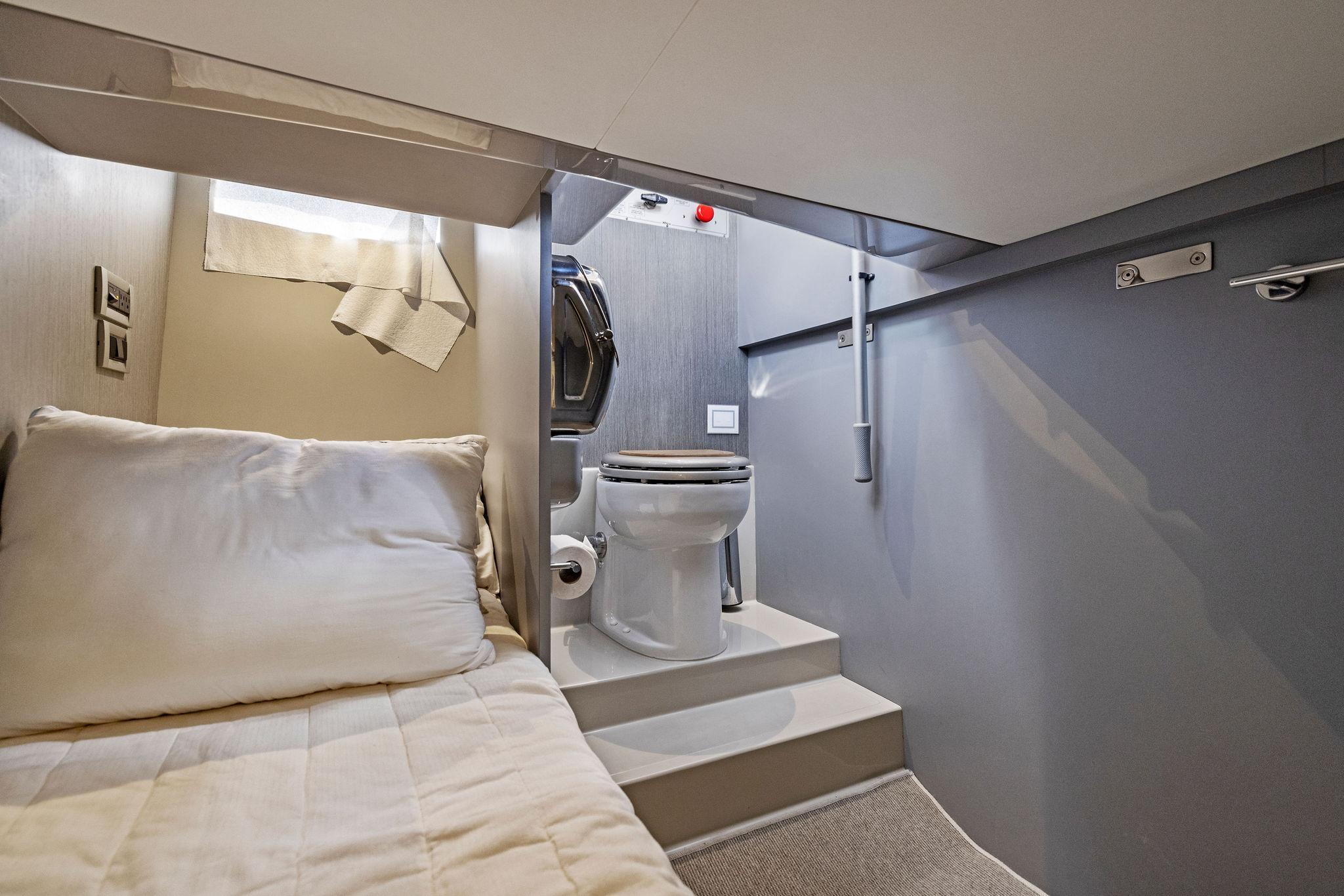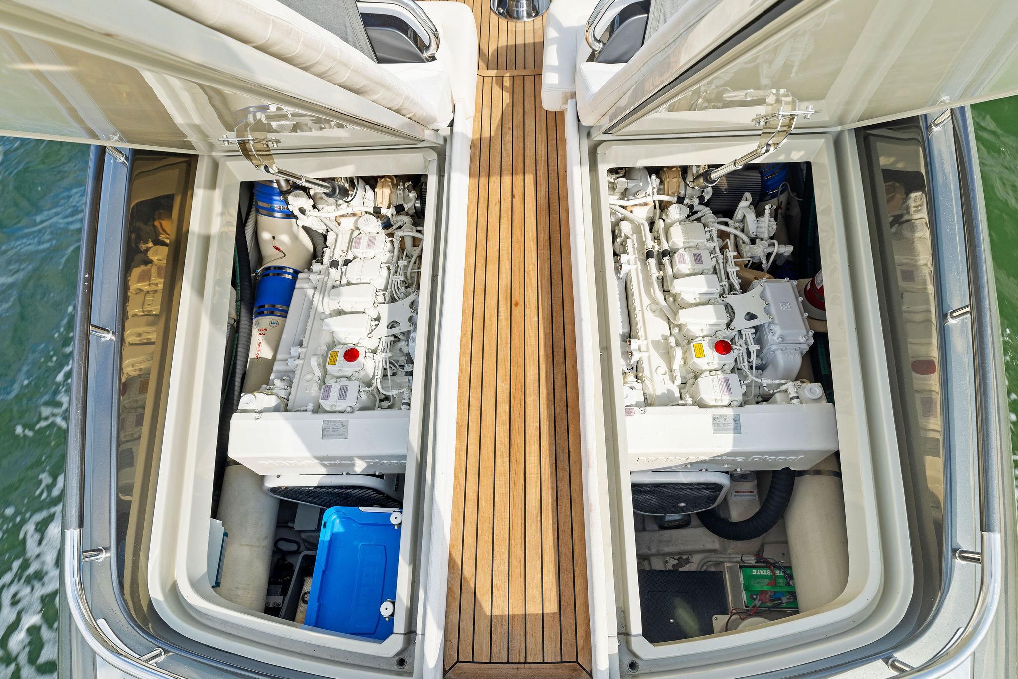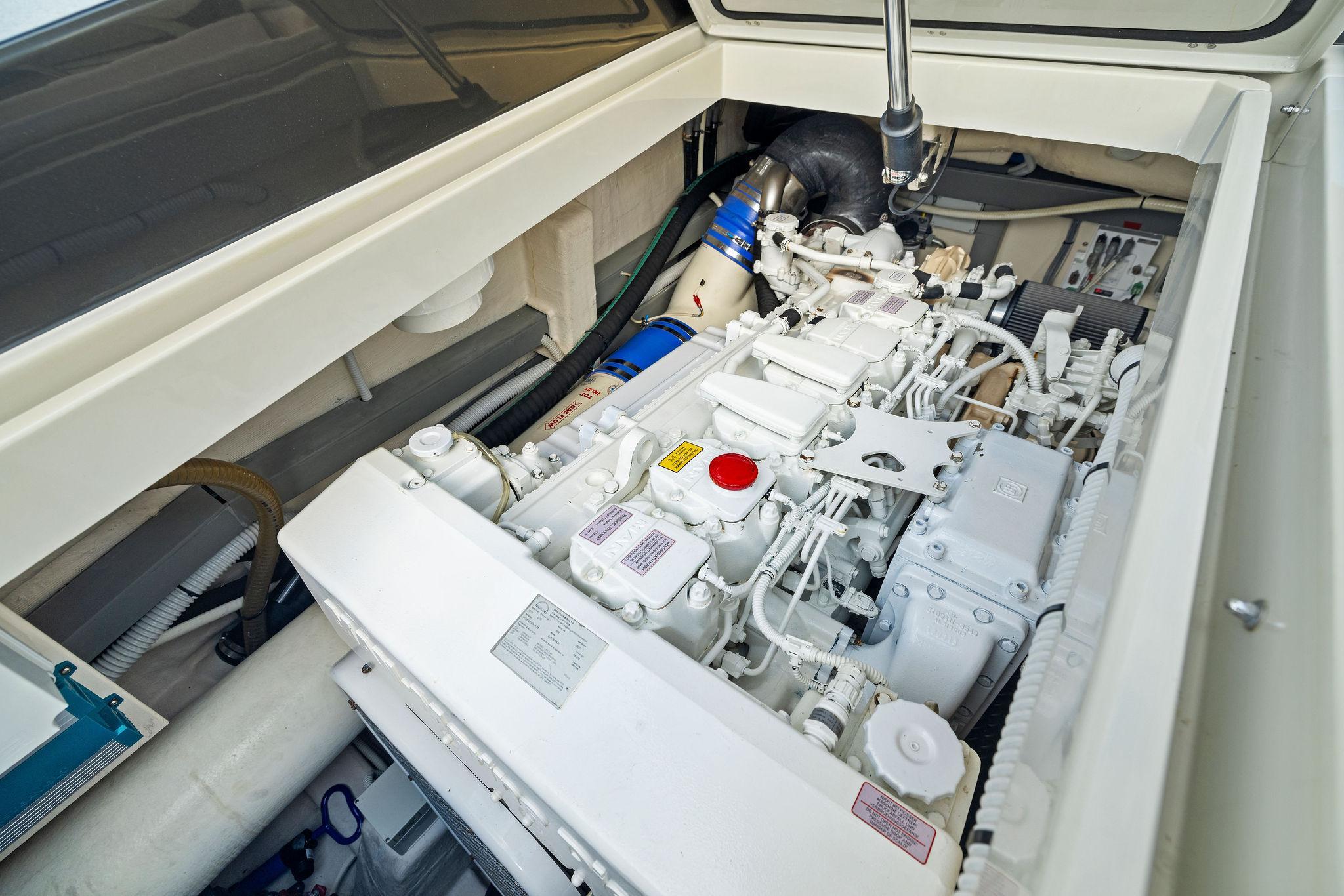"St. Peter" is powered by her reliable twin MAN 800hp common rail engines paired with two-speed ZF transmissions. The engine room is accessed below her two electric actuated sunpads in the aft cockpit. All of her current service requirements are up to date and service logs are available for inspection. The ships power comes from a Kohler 8.5KW 60 hertz (U.S. Spec) generator.