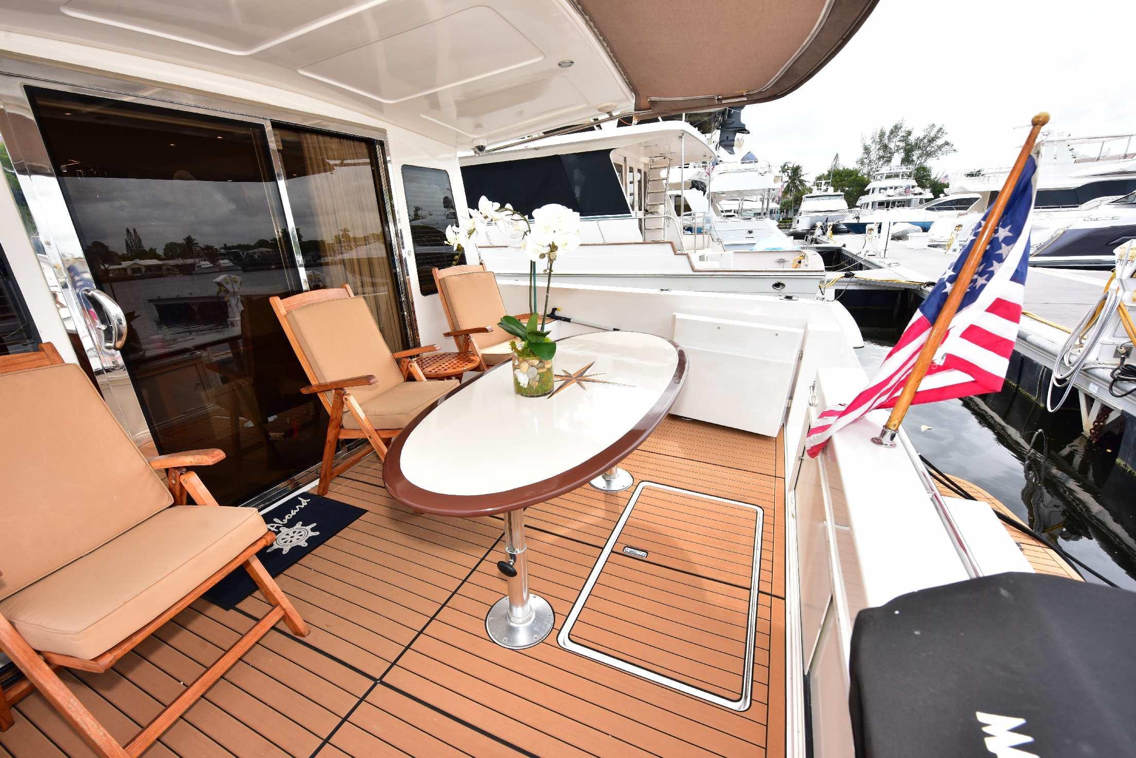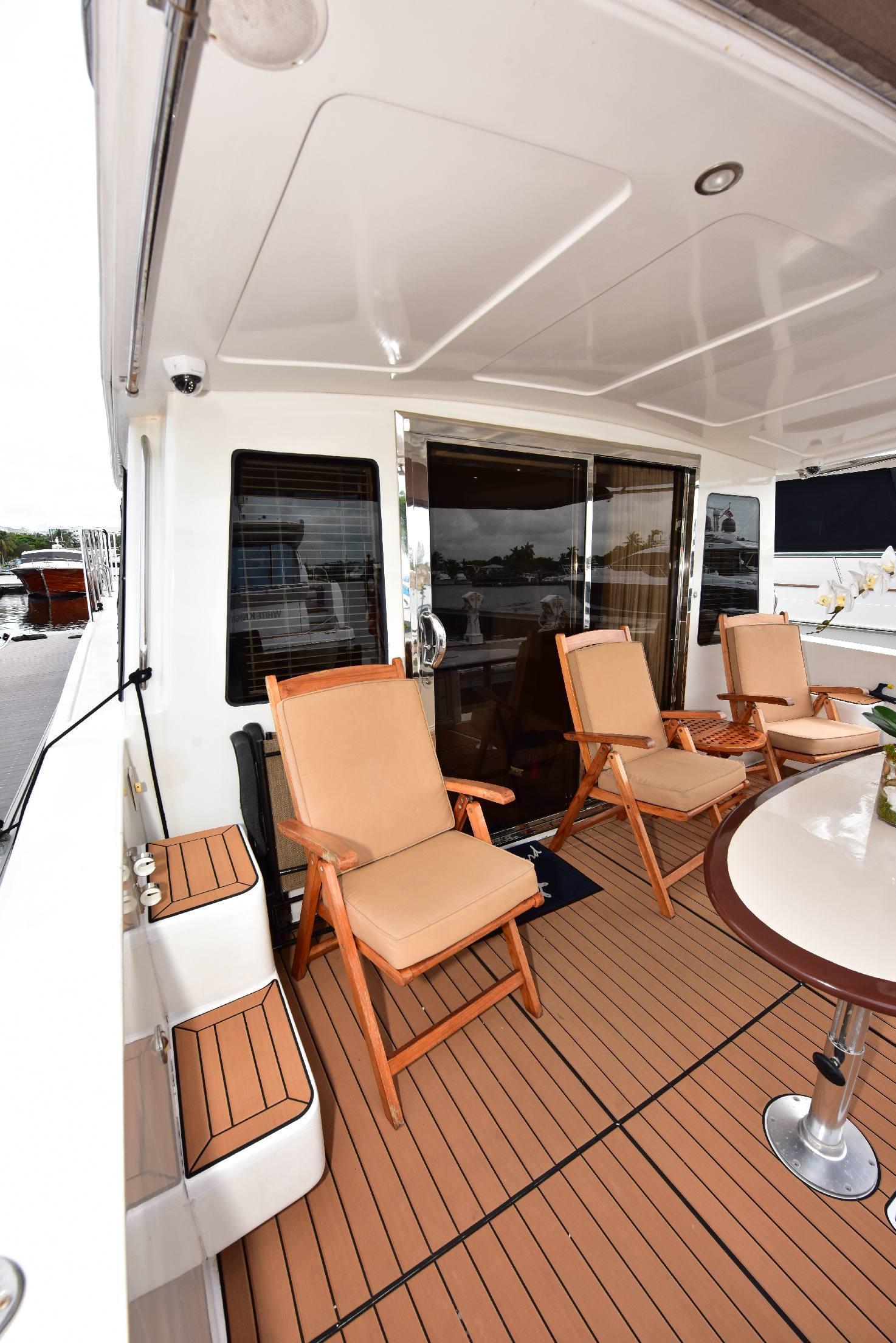 The aft deck is about 100 square feet and has new MARINE DEX synthetic teak that was installed in 2023 in the cockpit and on the integrated swim platform. The varnished table with hand made custom inlay has 4 deck chairs with custom cushions that match the lower and upper deck sunshades and Bimini top Two Amcrest IP4M-1028 cameras which can record, are mounted to each side of the stainless-steel sliding door frame. There is a very large deck access hatch to the engine room.