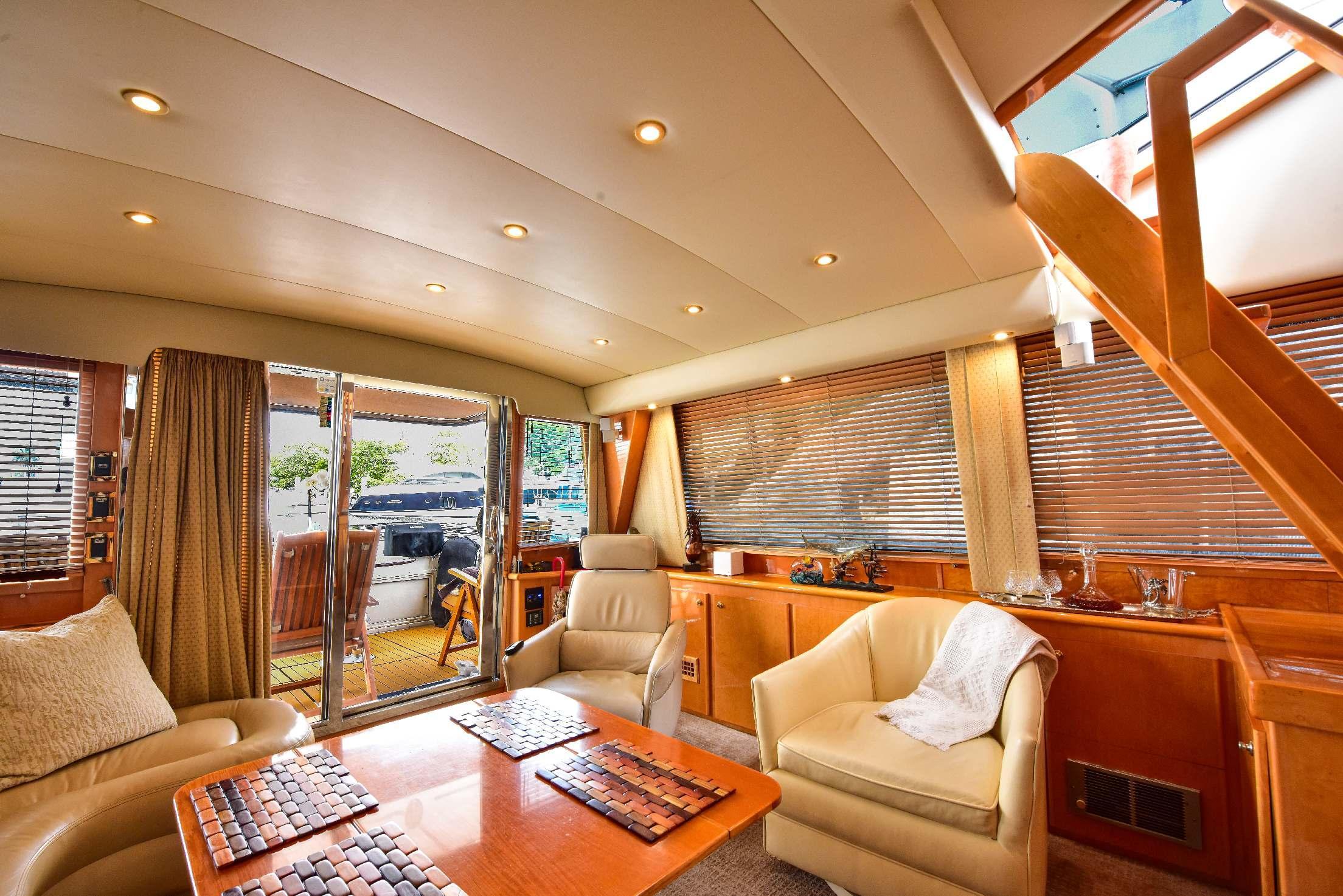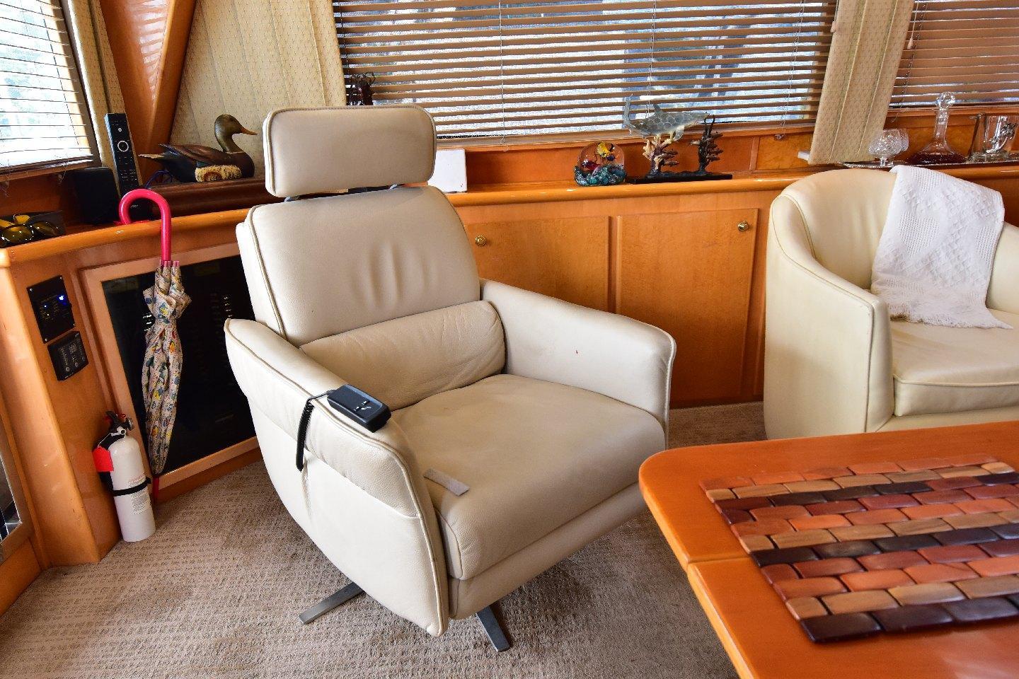 Entering the main saloon from the cockpit, one steps through double stainless steel doors into a bright expansive main saloon with large windows to port and starboard and large windows facing out into the cockpit. The windows have custom treatments and complement the new carpet, new recliner and built in settee that is located on the starboard side of the saloon. The windows were set low into the hull so as to allow great visibility while seated in the main saloon. The settee and matching barrel chair are covered with a luxurious material in warm cream tones.