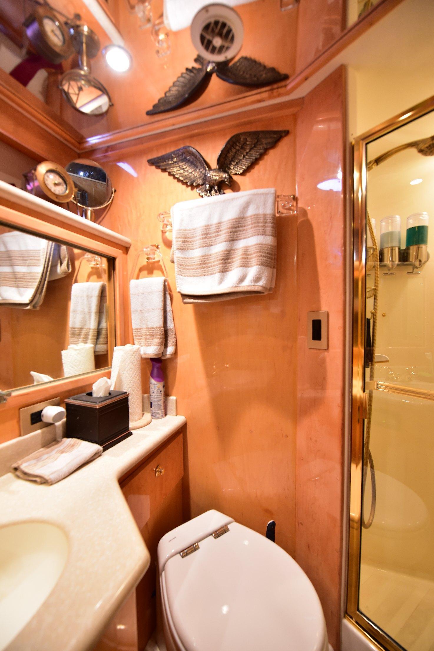 Looking forward and to starboard while standing in the main saloon one will find a very private entrance down into the master ensuite which is located amidship, giving one a very stable quiet place of refuge. Entering the master ensuite there is a well placed vanity/desk area complete with storage, beautiful custom LED light fixture and seat. The offset island Queen berth(full walk around) sports all new custom bedding and below berth storage. 2 good sized hanging lockers will accommodate your complete wardrobe. There are several large and small storage lockers also to be found in the master stateroom.