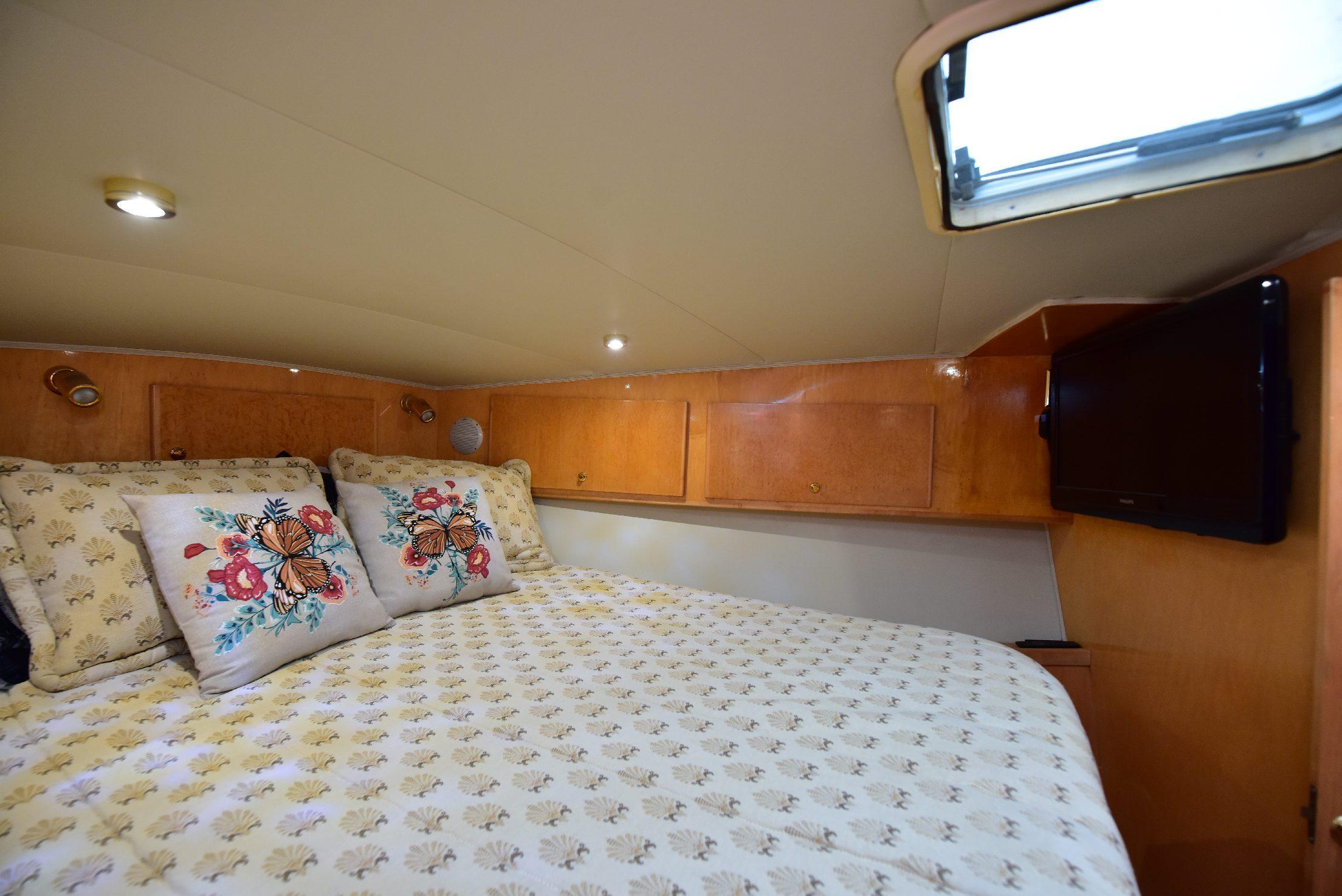 Heading down the stairs, one finds the guest staterooms and laundry areas of the NEXT CHAPTER. The stacked washer dryer is located to midship when you enter he hallway. Further ahead and to port is the guest bunk room with over/under berths. Even these berths have completely new custom bedding. All the way forward is the VIP stateroom. This stateroom is bright and cheerful with an island walk around queen berth with new custom bedding. There is an overhead deck hatch. The good sized hanging locker, abundant storage, a flat screen TV. along with private climate controls makes this a quiet retreat.