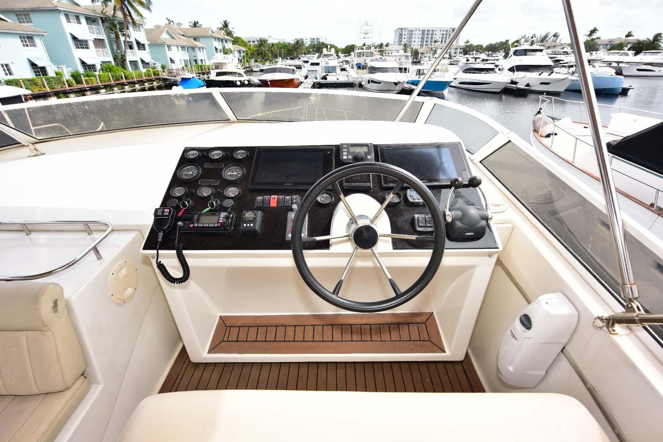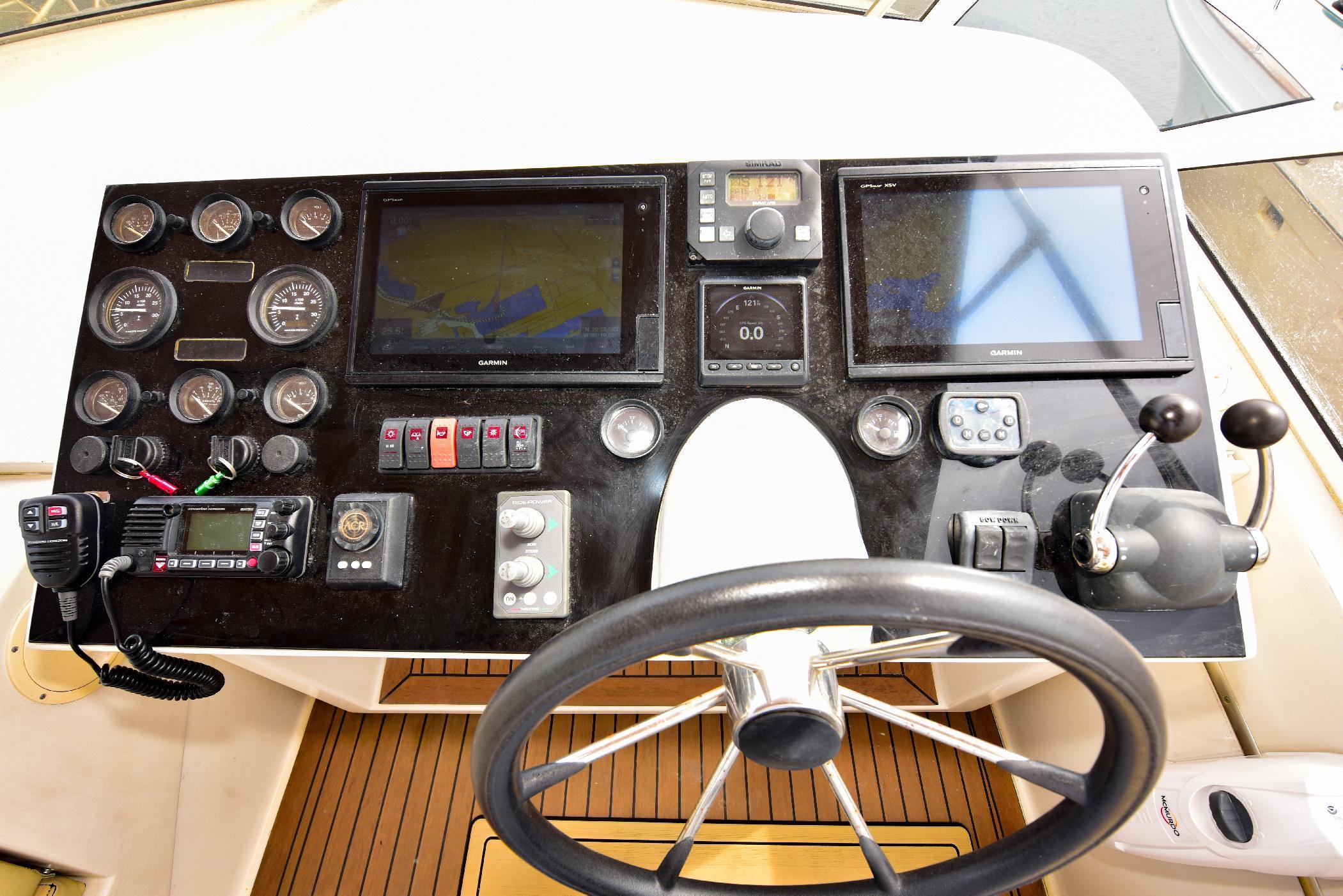 Electronics include: Garmin 1242 Multi-Function Display chart plotter, depth, autopilot, engine gauges, bow and stern thruster controls, windlass control, VHF and more.