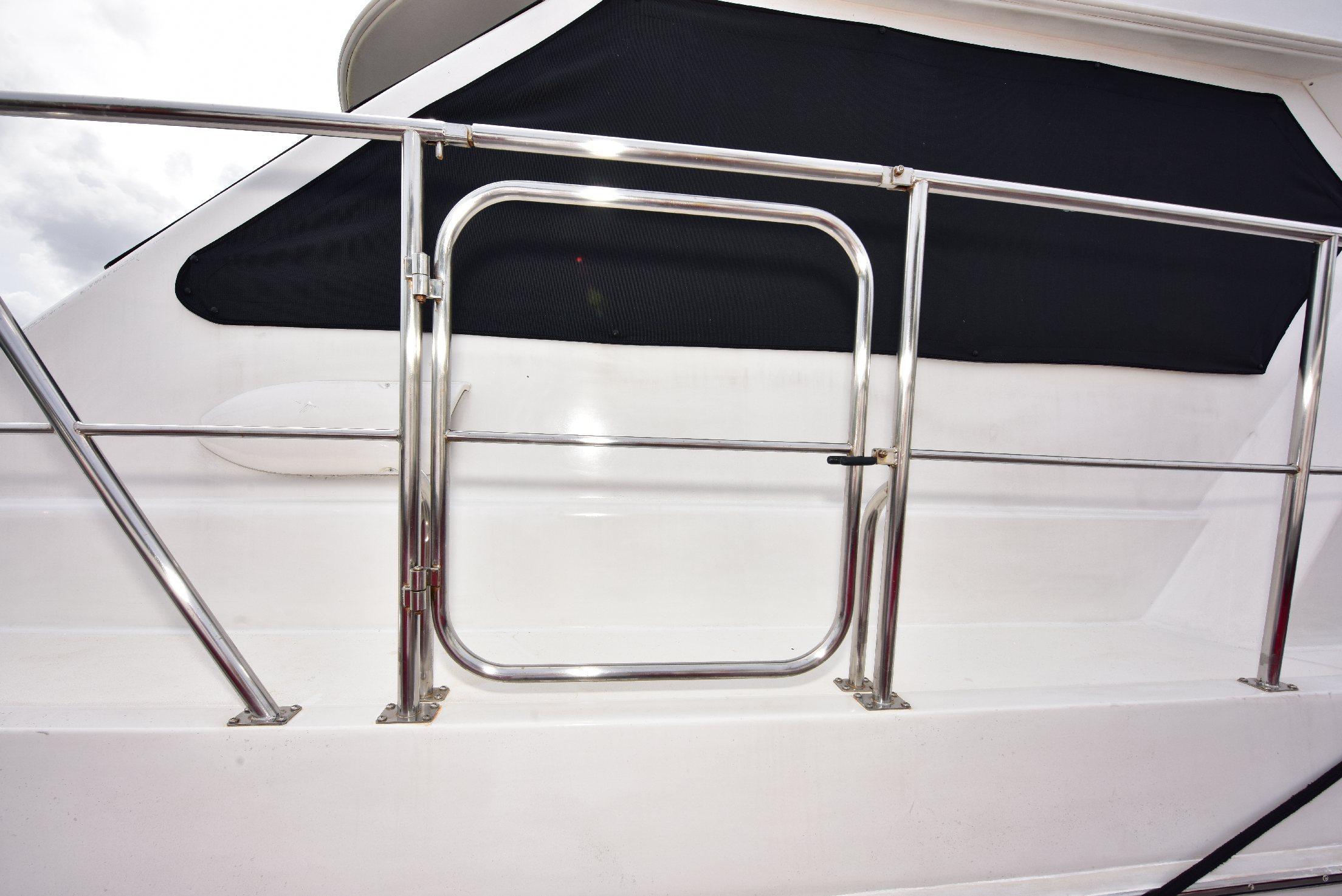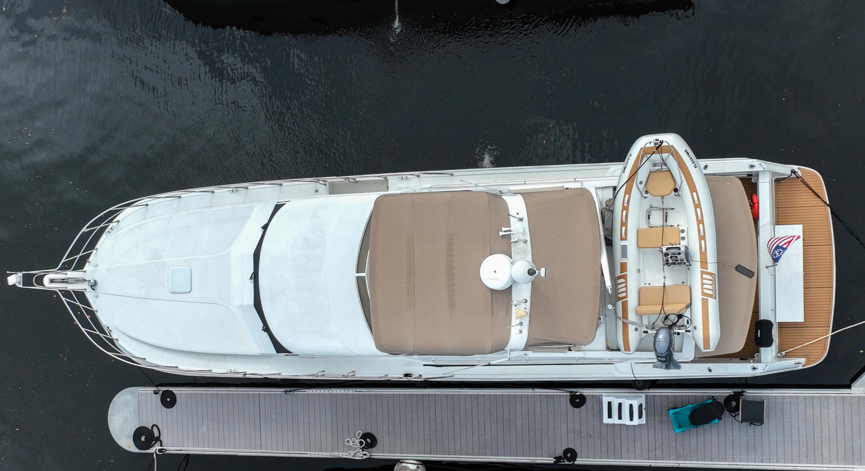 An interior wooden staircase leads up to a well-designed FLY BRIDGE perfect for enjoying the beauty of Mother Ocean or while at rest, gazing at the setting sun.The Bimini top extends from the forward windshield to the radar arch and a secondary sun shade extends from the radar arch aft providing good sun protection for those seated at the helm or on either of the 2 settees that are located to port and starboard. New bridge speakers are on their own dedicated circuit providing quiet back ground music or dance music for those lovely full moon evenings. Family and guests are all able to take advantage of the incredible views from the fly bridge while under way. Aft of the seating area there is the completely rebuilt from the fiberglass hull up, 13’5” Novurania with fully serviced 50 HP Yamaha outboard. The tender while being completely rebuilt also had a custom larger 14-gallon fuel tank installed and upgraded electronics. The tender is launched using the rebuilt and completely serviced BROWER 800 lb capacity davit. The entire bridge deck has beautiful NUTEAK synthetic teak decking which is so easy to maintain and comfortable under foot. The helm, which is off set to starboard, looks like it should be in the cockpit of a Lear jet. At one's fingertips you wll find a complete array of electronics, bow and stern thruster controls, windlass controls, etc. The helm has thoughtful dual seating so that should you wish to join your captain, you may do so. Off to port of the dual helm seat is another companion set facing aft. This fly bridge was definitely designed for the maxim amount of fun and lounging while cruising or just goofing off.
