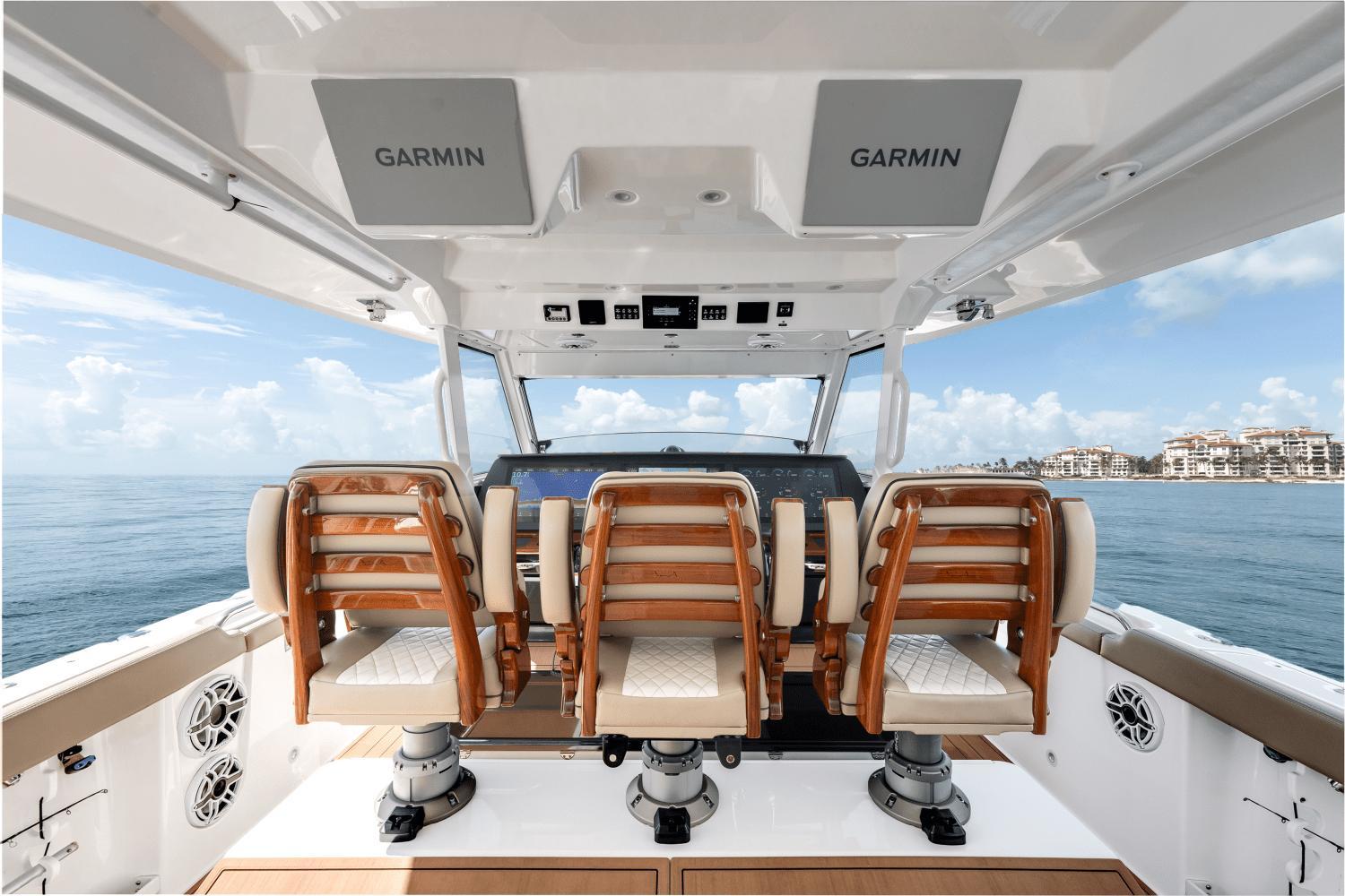 (3) Release Marine teak ladder back helm seats with armrests mounted on SHOX seat bases