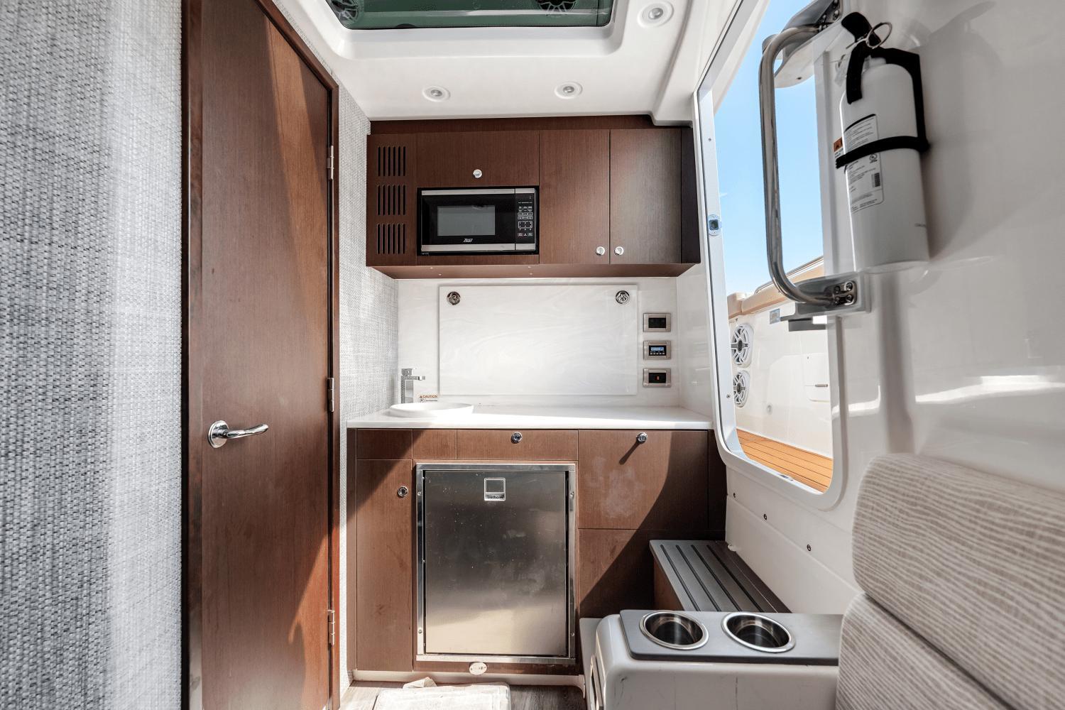 Galley starboard w/ storage cabinets, solid surface top, glass bowl sink, microwave, refrigerator/freezer, storage drawers and access to electronics