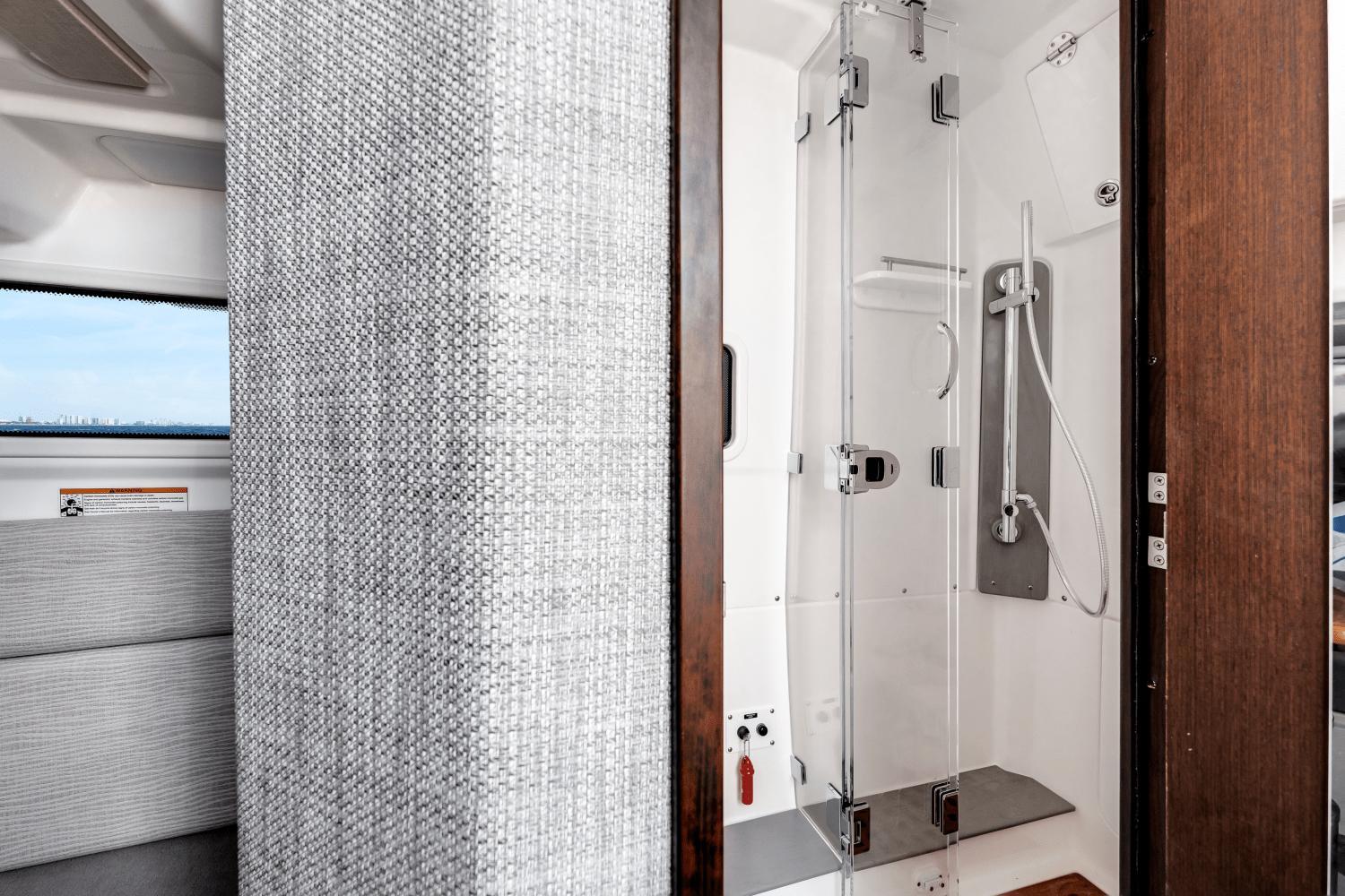 Enclosed shower w/ a SS shower head and teak shower grate floor