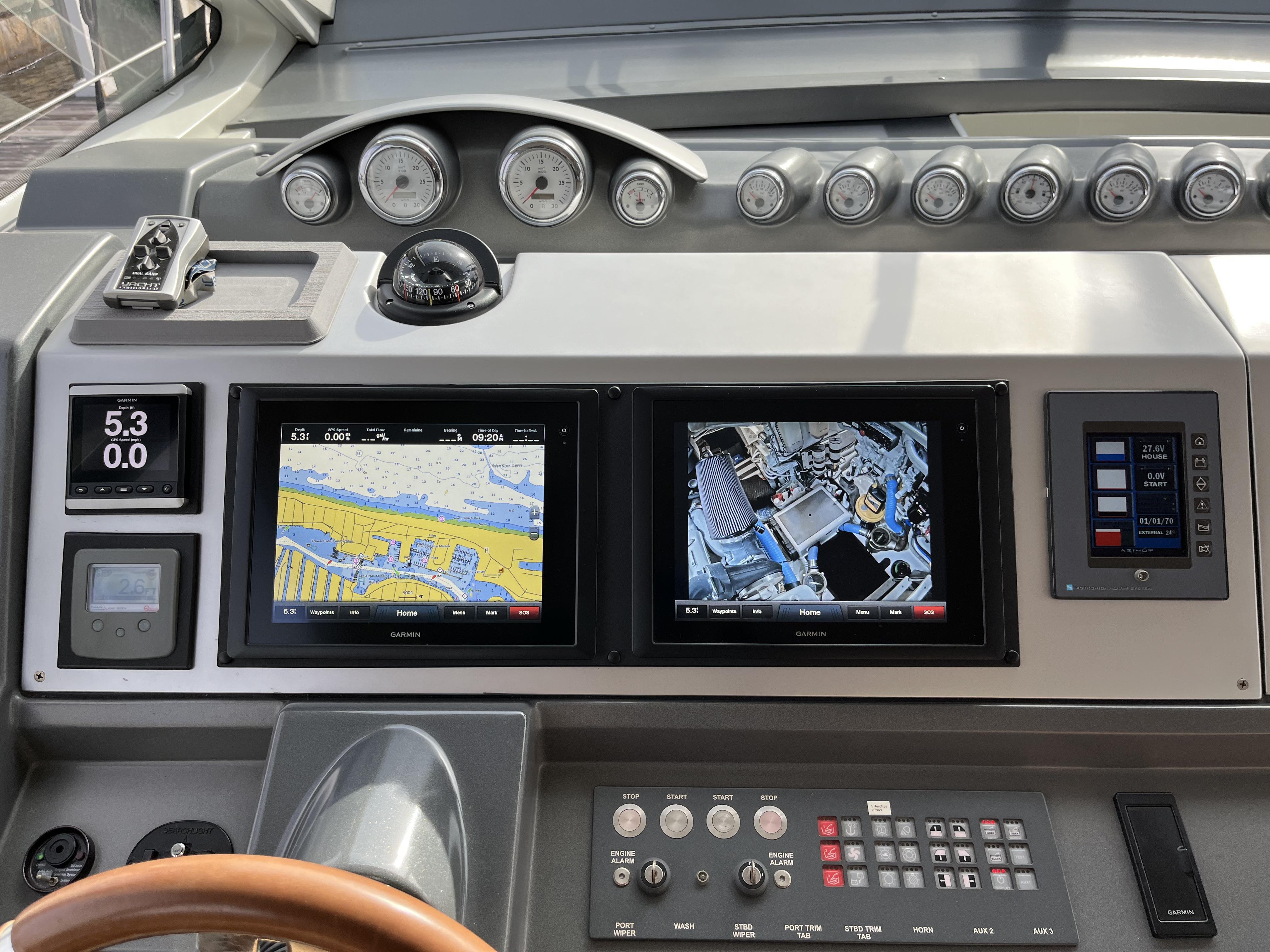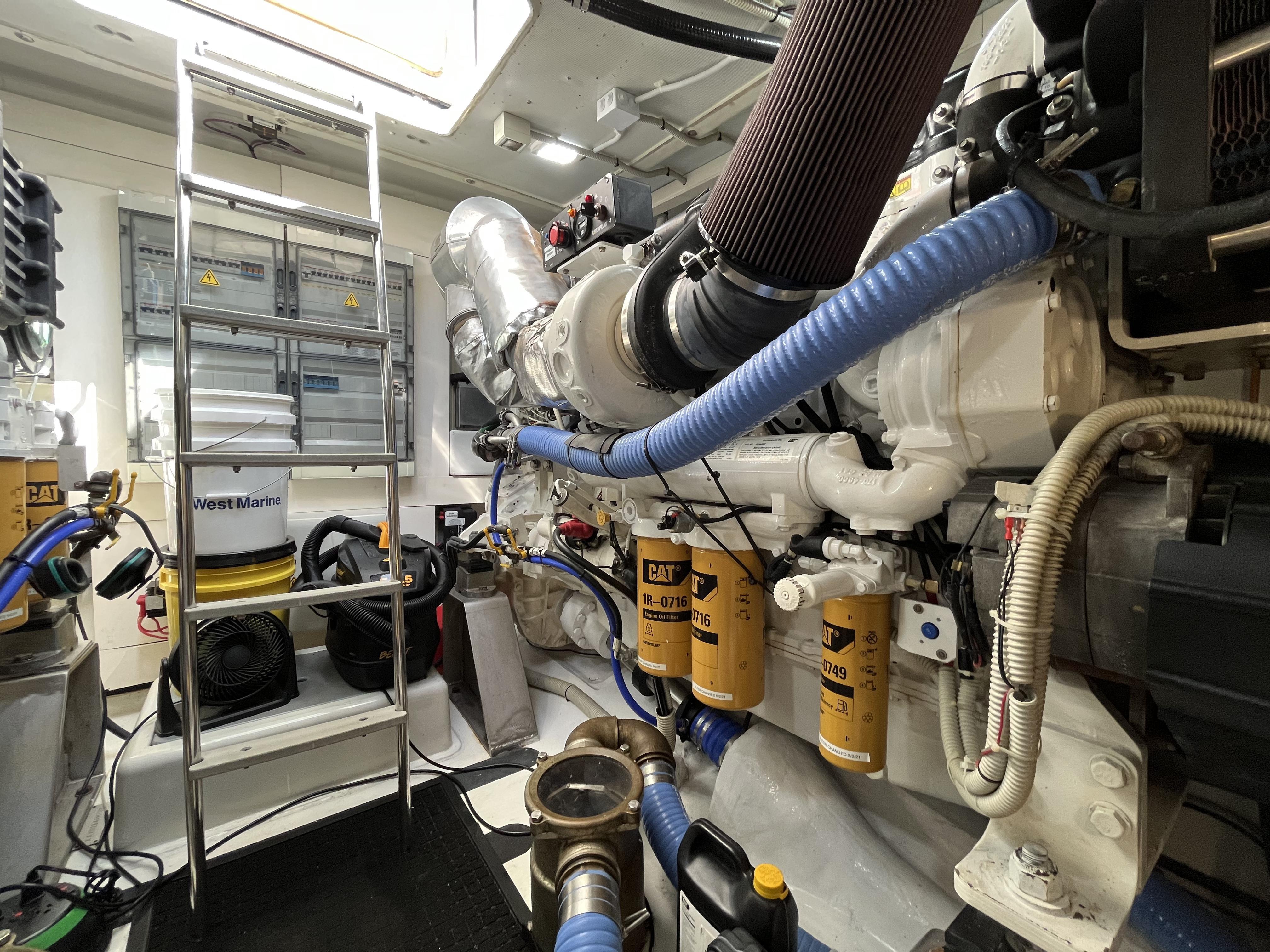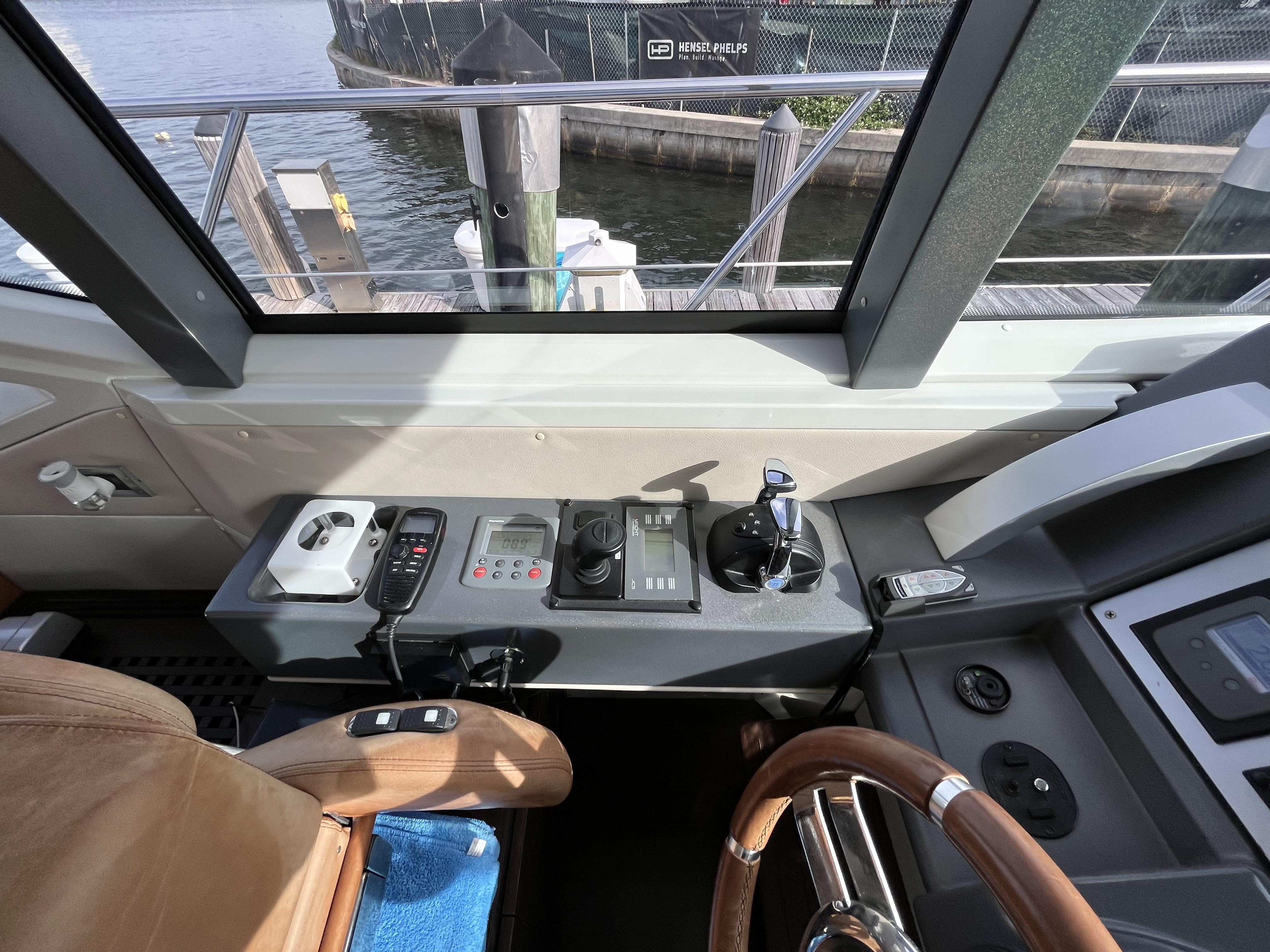 "Powered by twin CAT C18 engines and equipped with both bow and stern thrusters, docking is effortless with a YachtControllerRemote or intuitive joystick control, making it perfect for owner operation.
