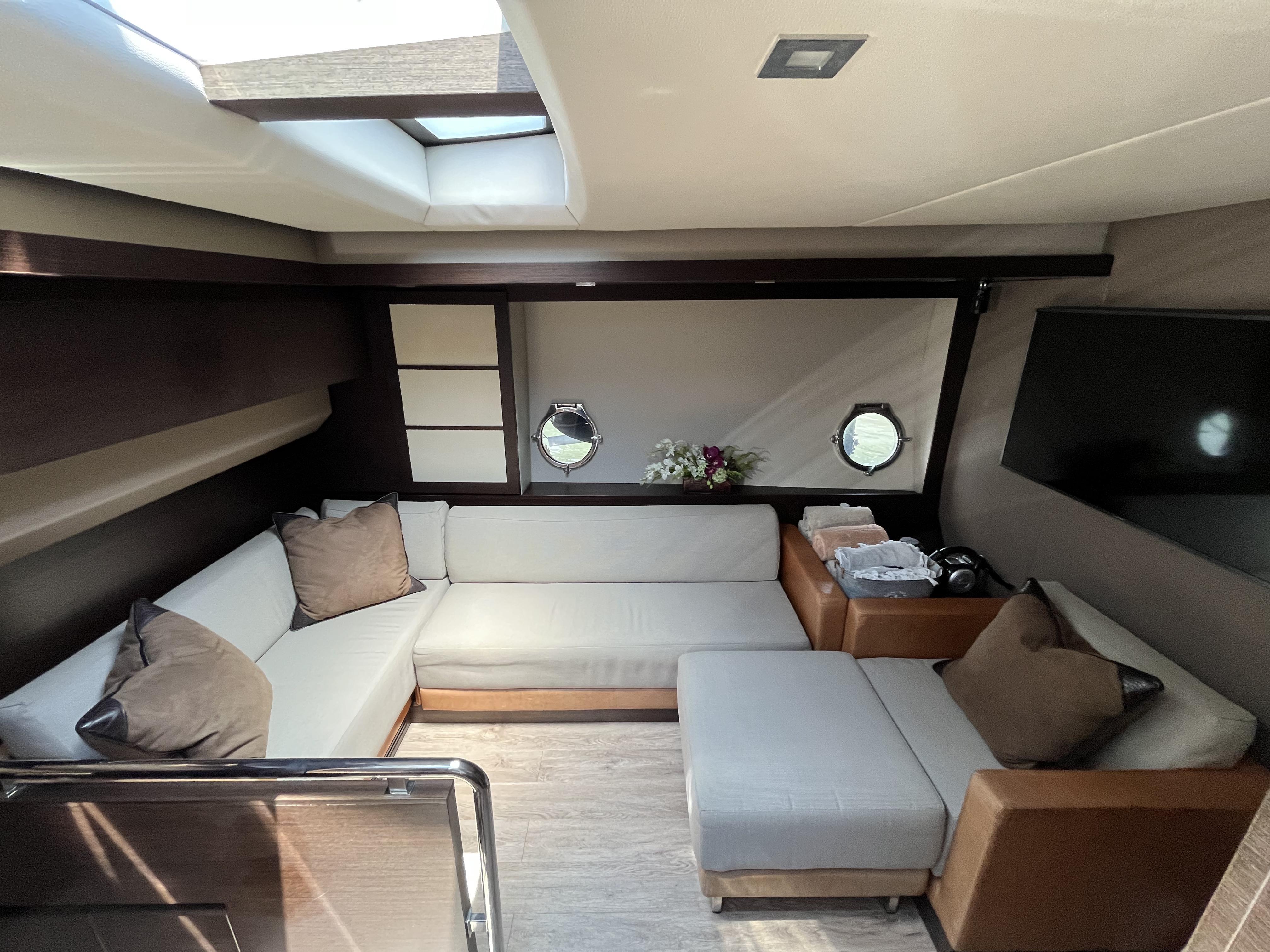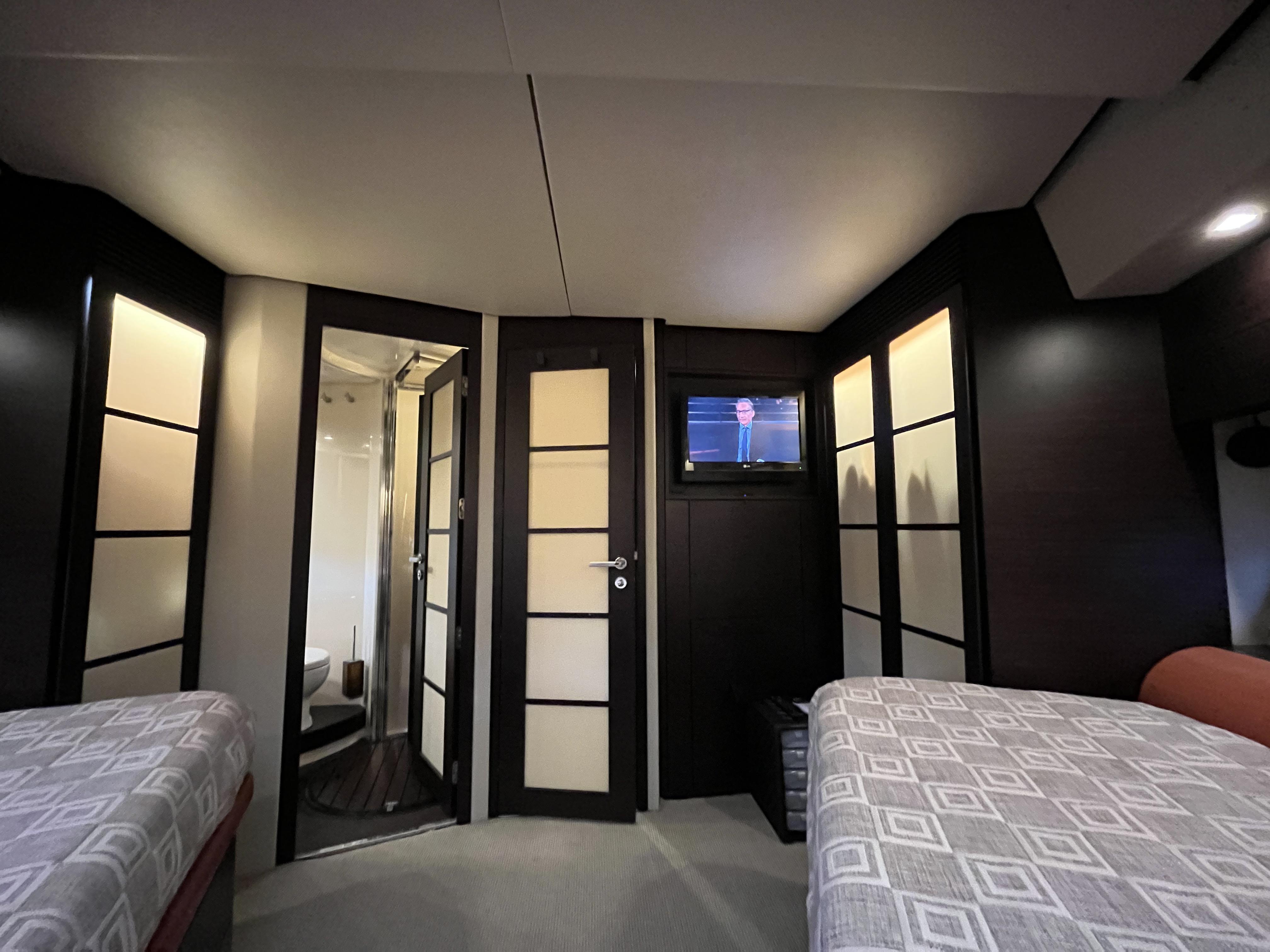 This Azimut 62S features a desirable two-stateroom layout, complemented by a media lounge adjacent to the galley. The U-shaped seating provides ample space for relaxation, while a large flat screen TV is mounted on the forward bulkhead for entertainment. The lounge area can also be converted into a berth for one, adding versatility to the space.