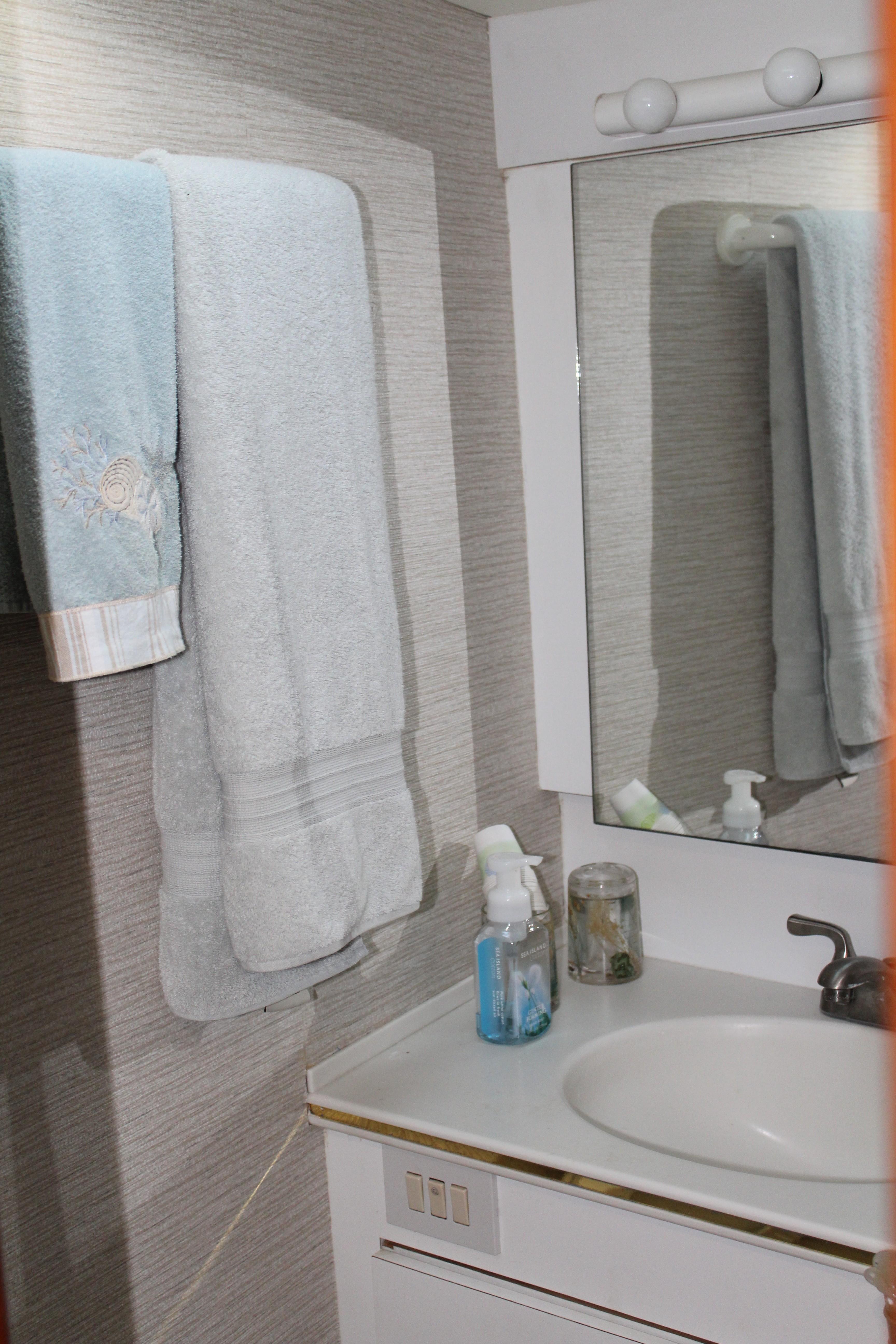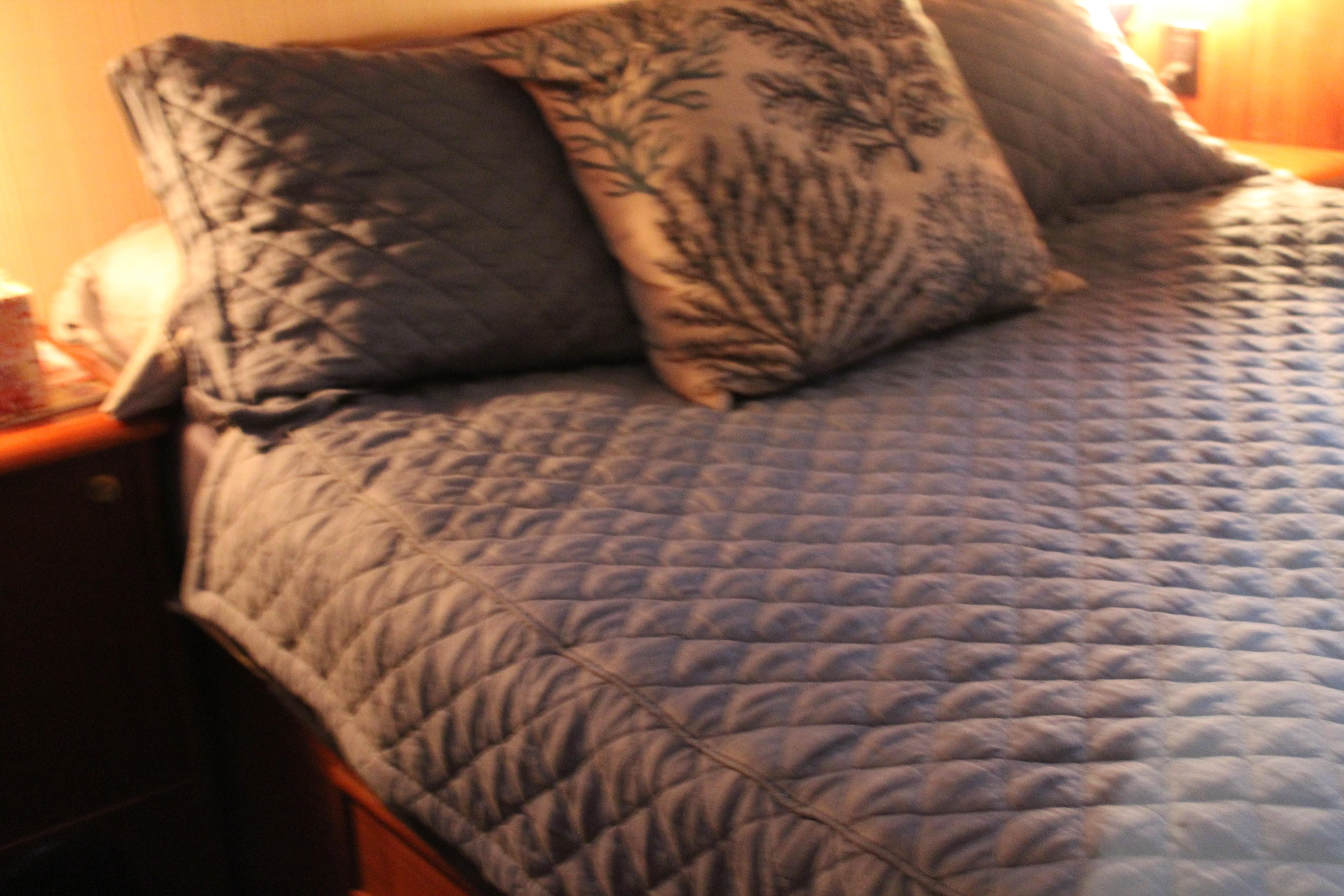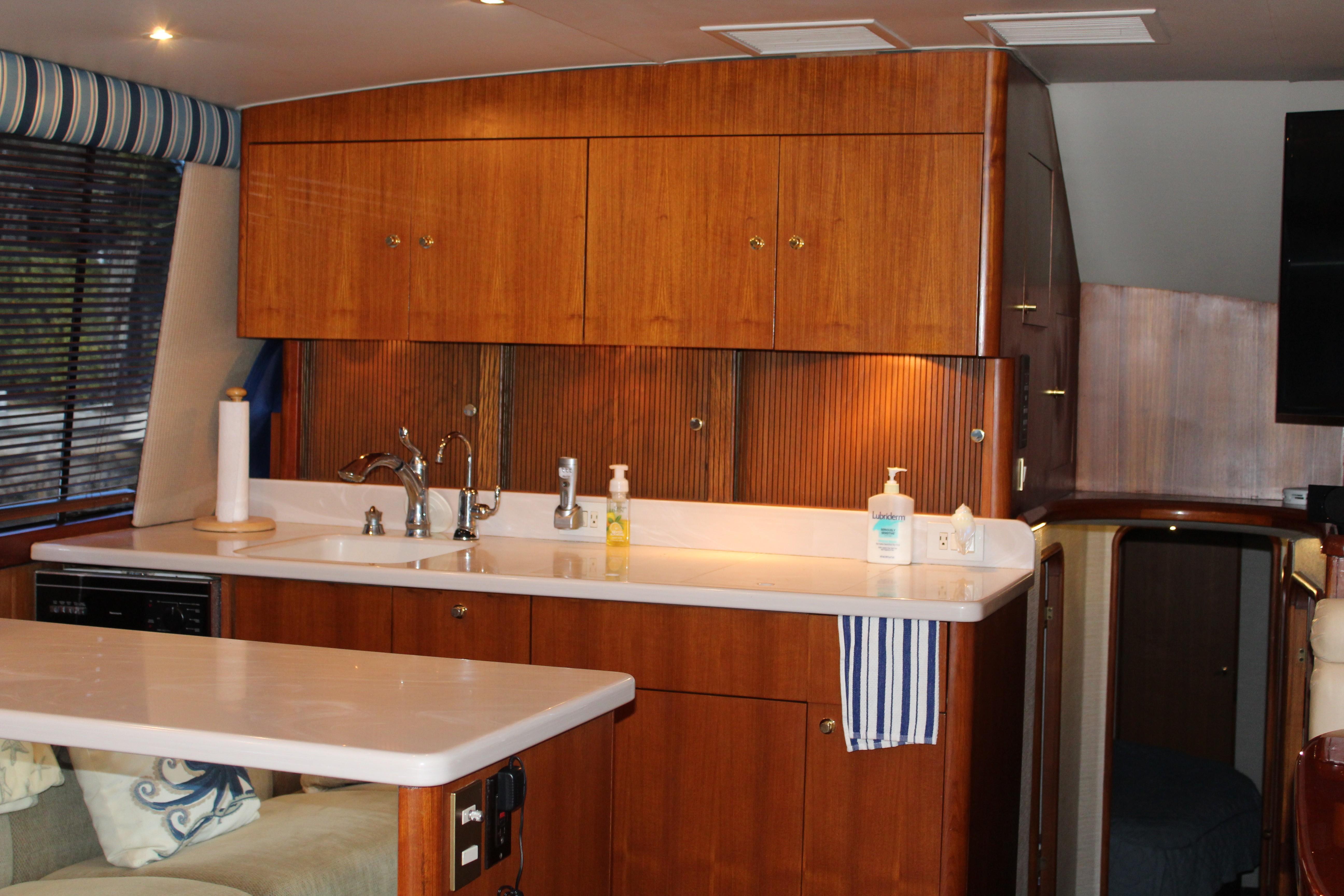Entry to the Salon is from the Starboard sliding door. The main electrical distribution panel is directly adjacent to the doorway. The L shaped settee is port side with under cushion storage. The Hi-LO coffee table can double as additional dining table if needed. The salon sole is wooden flooring. It features area Blue Carpeting with White Stars. The carpeting is bound on all sides.There is a barrel chair starboard. The window treatments Head rail and Lambekins are new. Privacy is achieved by wooden blinds. Located next to the chair is a U line ice Maker recessed in cabinetry and bar sink and faucet. The dinette is on the starboard side directly across from the port side Galley. The Hi gloss table and L shaped seating, additionally the Samsung Flat screen T V is located in the cabinetry, with audio/visual equipment . Cruise-air digital control thermostat is located in the companionway. The very functional Galley is framed by an Island counter top with Under counter Sub Zero refrigeration, both freezer and Refrigeration. Coran counter tops and Recessed sink, with Chrome faucets. A recessed princess stove under a removal Coran top.There is also a concealed microwave oven behind a sliding cabinet door.additional storage. Flagler Yachts Disclaimer