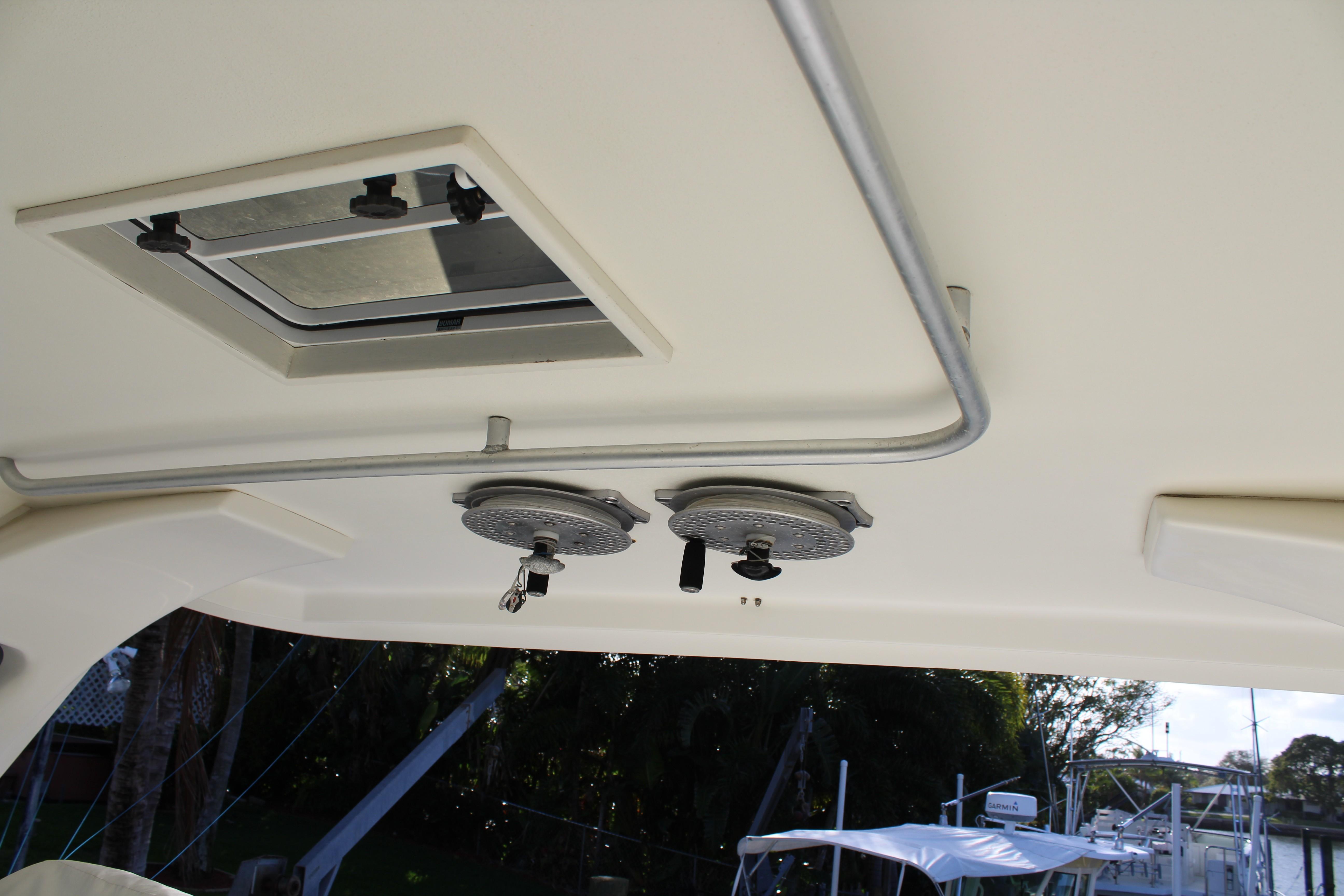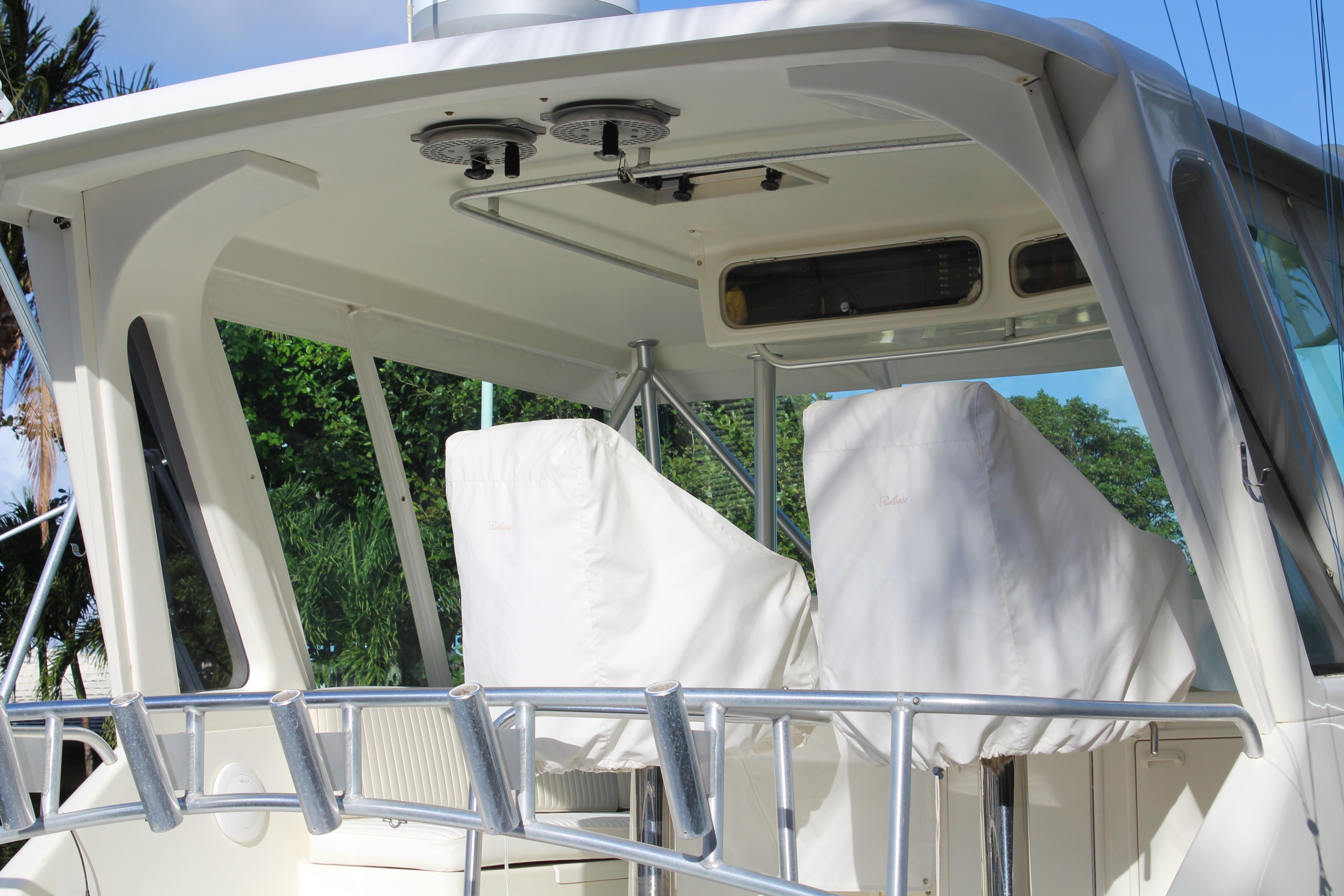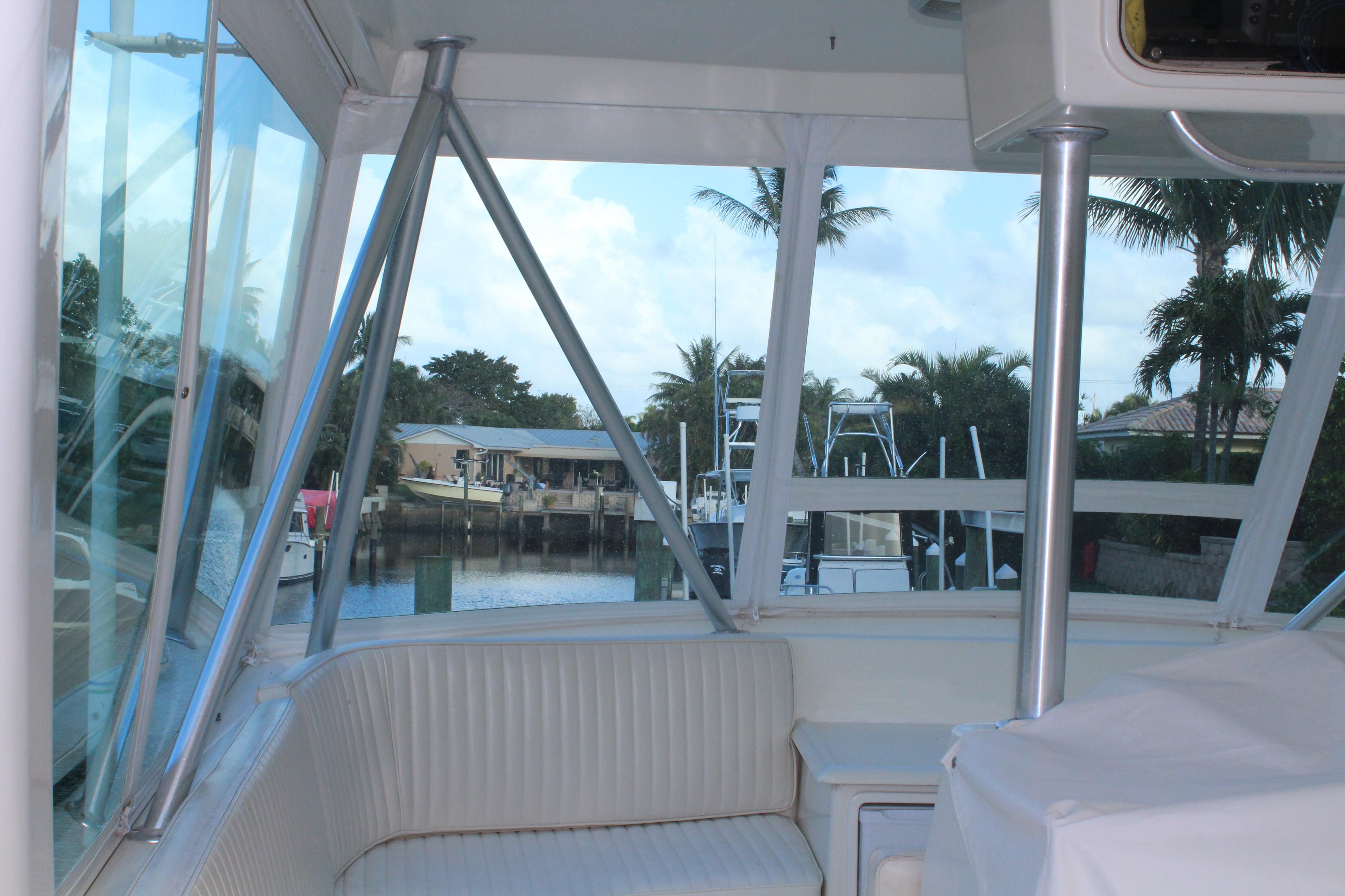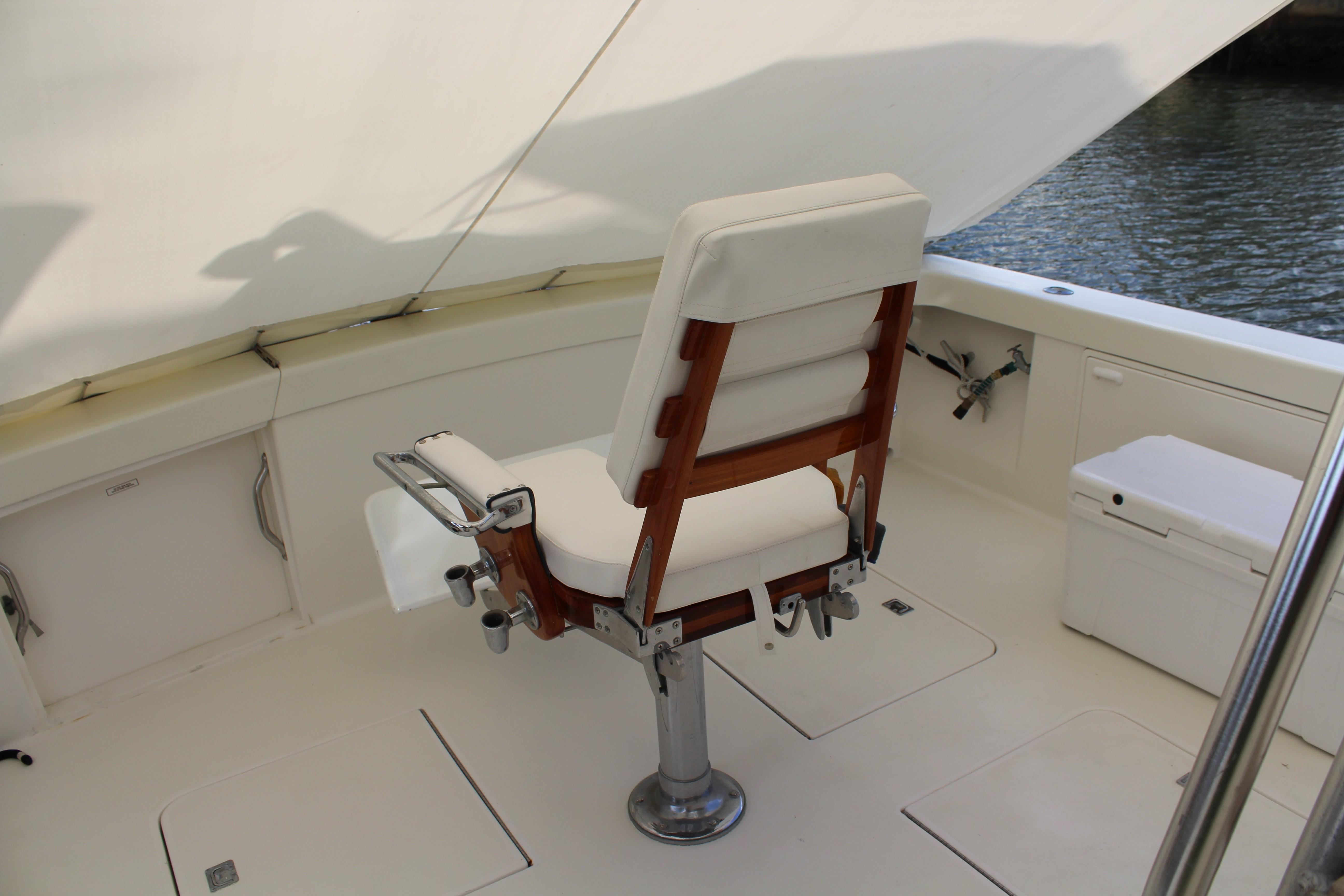 The large aft deck cockpit with a non skid fiberglass sole. The fighting chair is center line. The recessed fish boxes and aft hatches to the Lazzerette. The engine room access is directly underneath the ladder, There is a Freezer and tackle station located in the same bulkhead. The boat has under water lights, and two sets of spreader lights, and a cockpit cover. There is a second station of controls in the starboard side locker. Fighting Chair and 36' Rupp Outriggers with stand offs and lay downs.. Cockpit cover, Fresh and raw water Washdown. Fish boxes and live well. Fiberglass cockpit sole. Helm