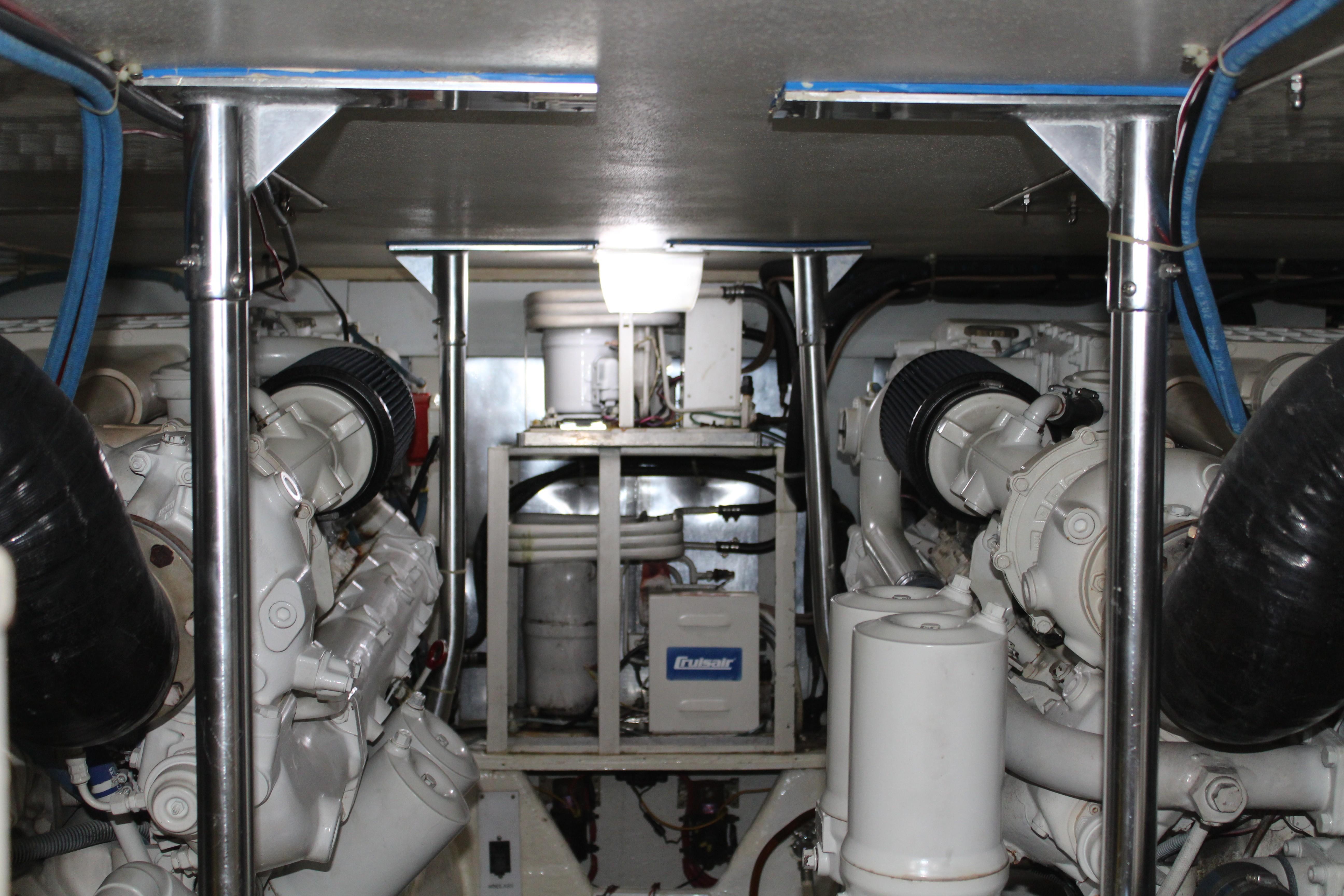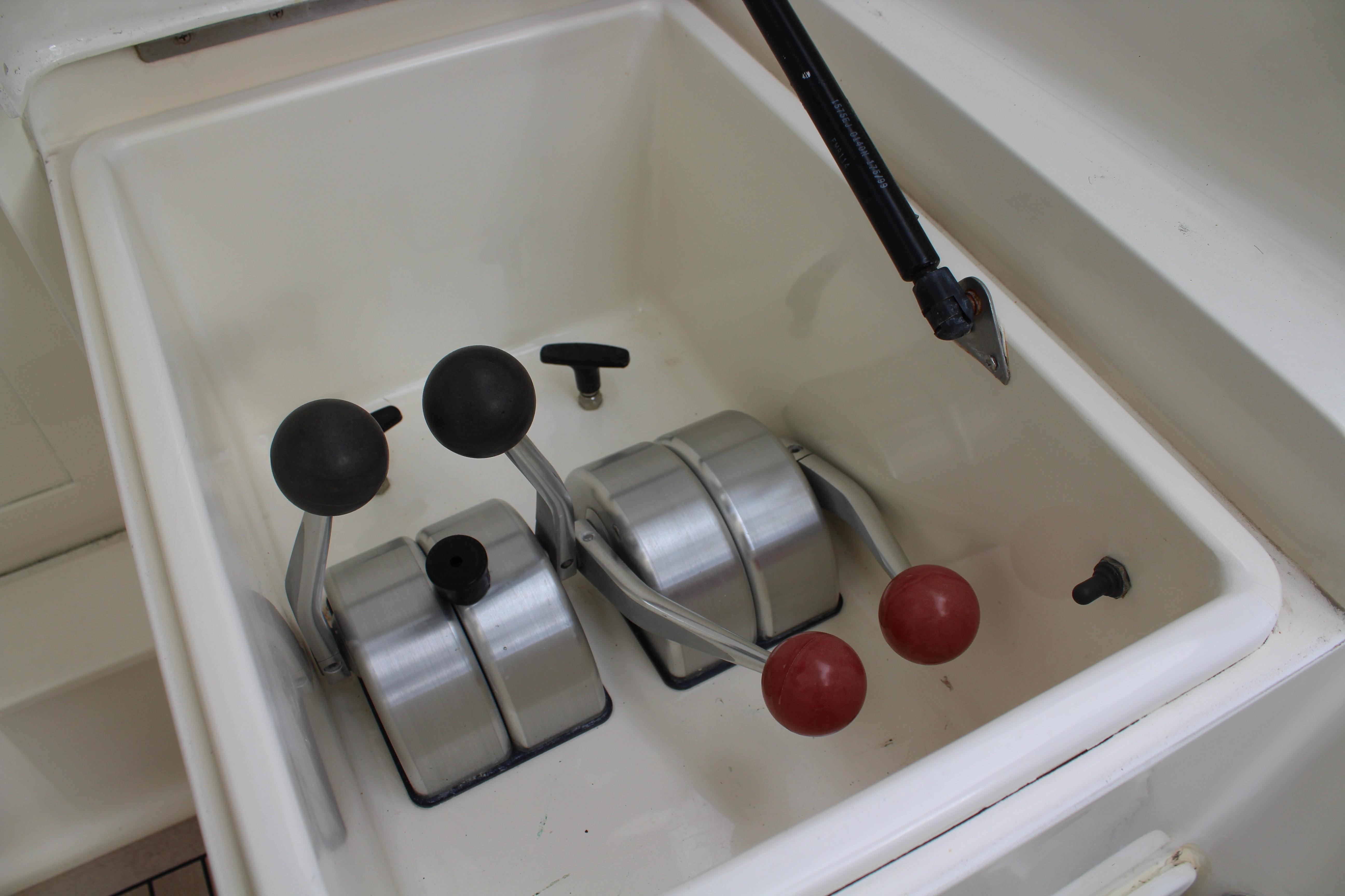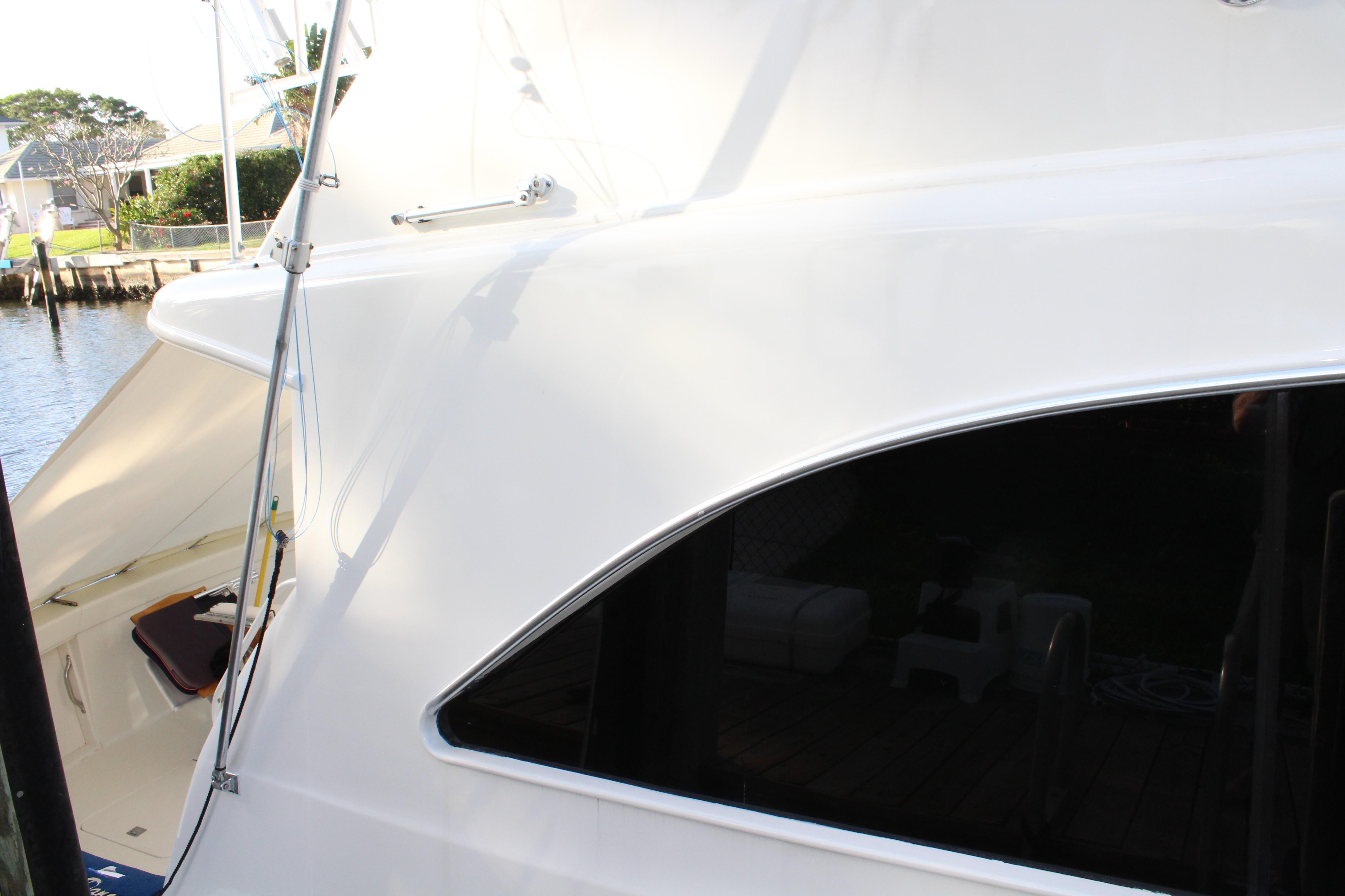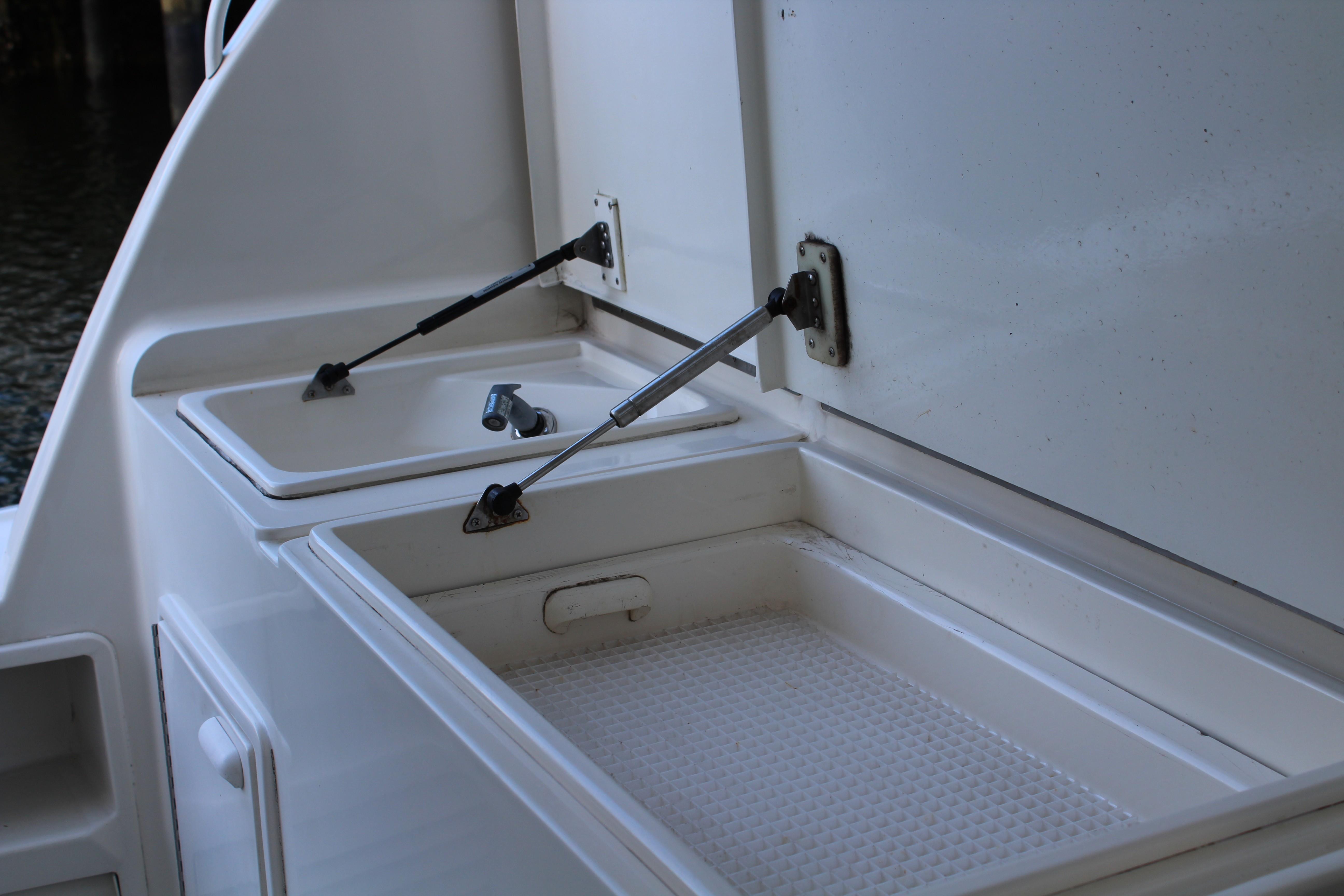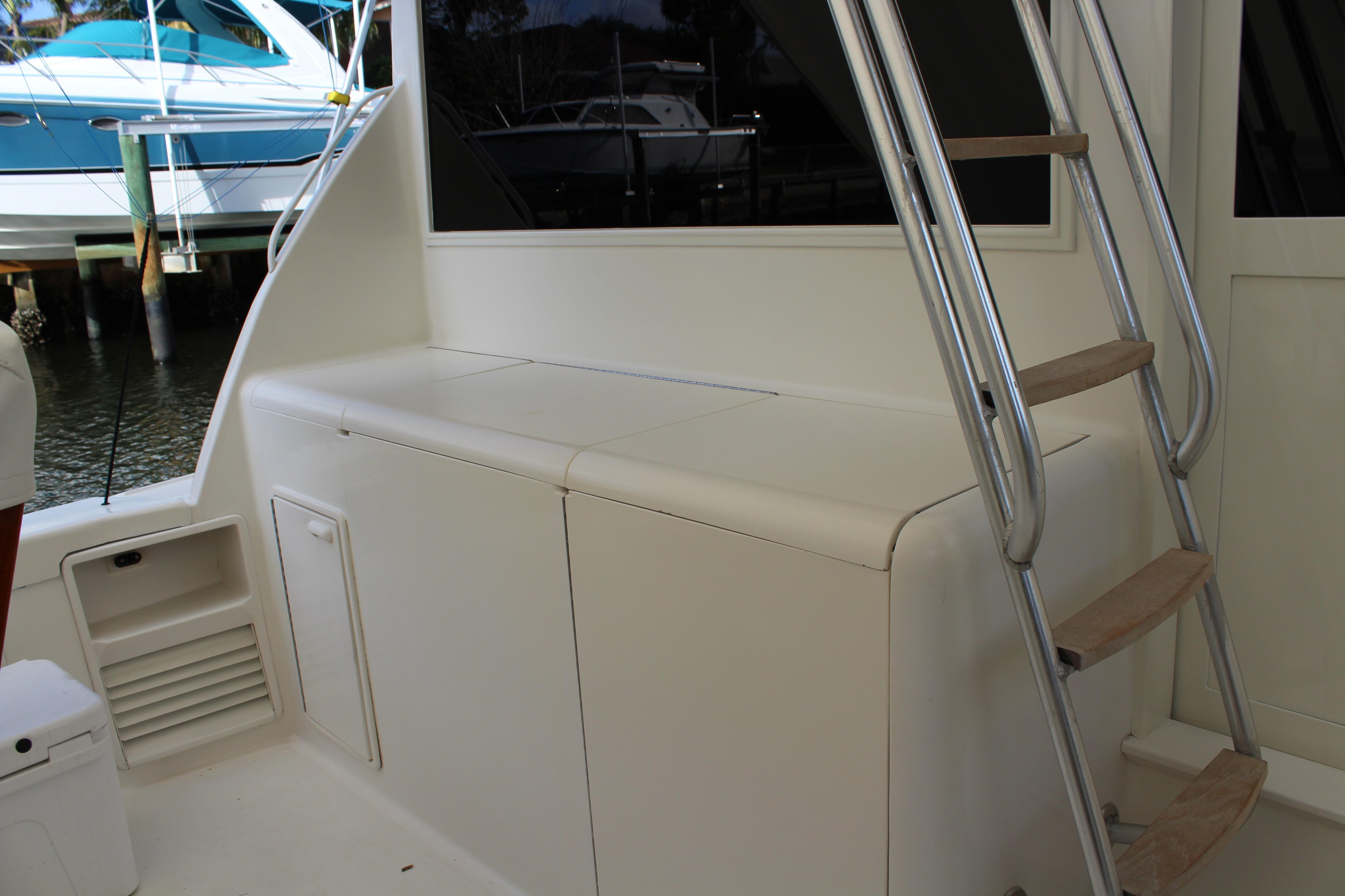 The large aft deck cockpit with a non skid fiberglass sole. The fighting chair is center line. The recessed fish boxes and aft hatches to the Lazzerette. The engine room access is directly underneath the ladder, There is a Freezer and tackle station located in the same bulkhead. The boat has under water lights, and two sets of spreader lights, and a cockpit cover. There is a second station of controls in the starboard side locker. Fighting Chair and 36' Rupp Outriggers with stand offs and lay downs.. Cockpit cover, Fresh and raw water Washdown. Fish boxes and live well. Fiberglass cockpit sole. Helm