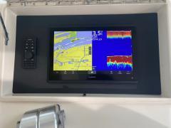 The helm deck is accessed from an awthartship ladder located adjacent to the salon door. The Lexan hatch door adds a level of safety and sound reduction while under way. Twin ladder back helm chairs with generous padded seat cushions for the captain and crews comfort . Additional bench seating is port side and forward of the console. Creating plenty of seating for guest. Storage under the settee's and a refrigerator on deck, wrapped in three sided new EZ2CY enclosure,enhances the functional deck. The console is center lined from the starboard side. Hydraulic steering . Twin binnacle controls, Engine Gauges, Electronics are all housed in easy sight and reach of the Captain. Teaser reels over head and access to the outriggers, rod holders on the rail aft, and a good sight line to the cockpit . This all adds ups to a serious cruising or fishing machine. Simard Auto Pilot AP22 Auto helm Tri-Data Digital Sounder and speed URC-100 Spotlight Remote control Richie Compass Furuno Radar GaAs Furuno Sounder FCV-292 Northstar 951 GPS Icom VHF Raytheon VHF KVH Satellite Receiver Dual Spreader lights Analog Gauges Dual Binnacle controls Aft deck Second set of Binnacle Controls Ceiling mounted Aluminium Teaser Reels Bennett Trim controls Lexan Helm Deck Hatch Stereo Speakers Overhead safety Handrails Bomar hatch Fiberglass radio box Salon and Galley