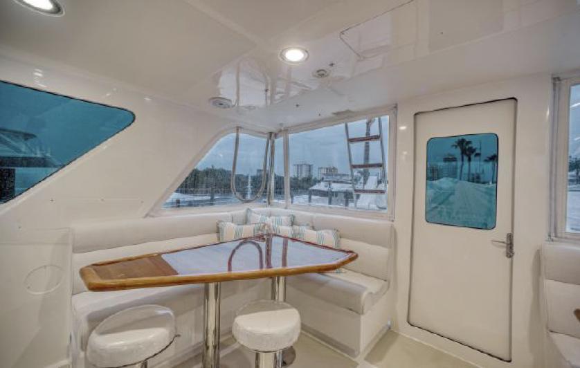 Three steps forward and up you enter the large galley, with a full size household appliances. Forward and to port is a raised U Shaped dinette for meals with excellent visibility while dining.