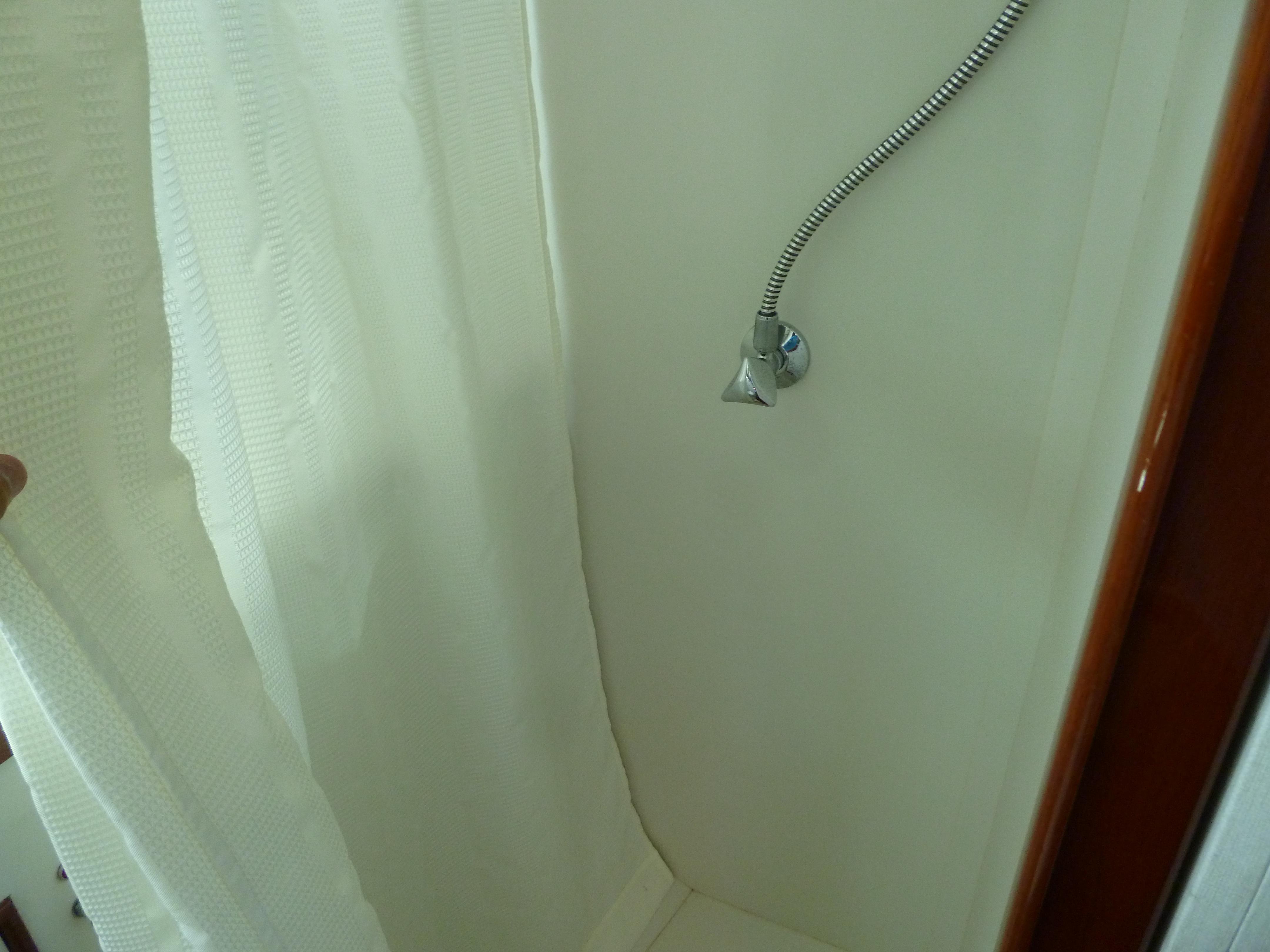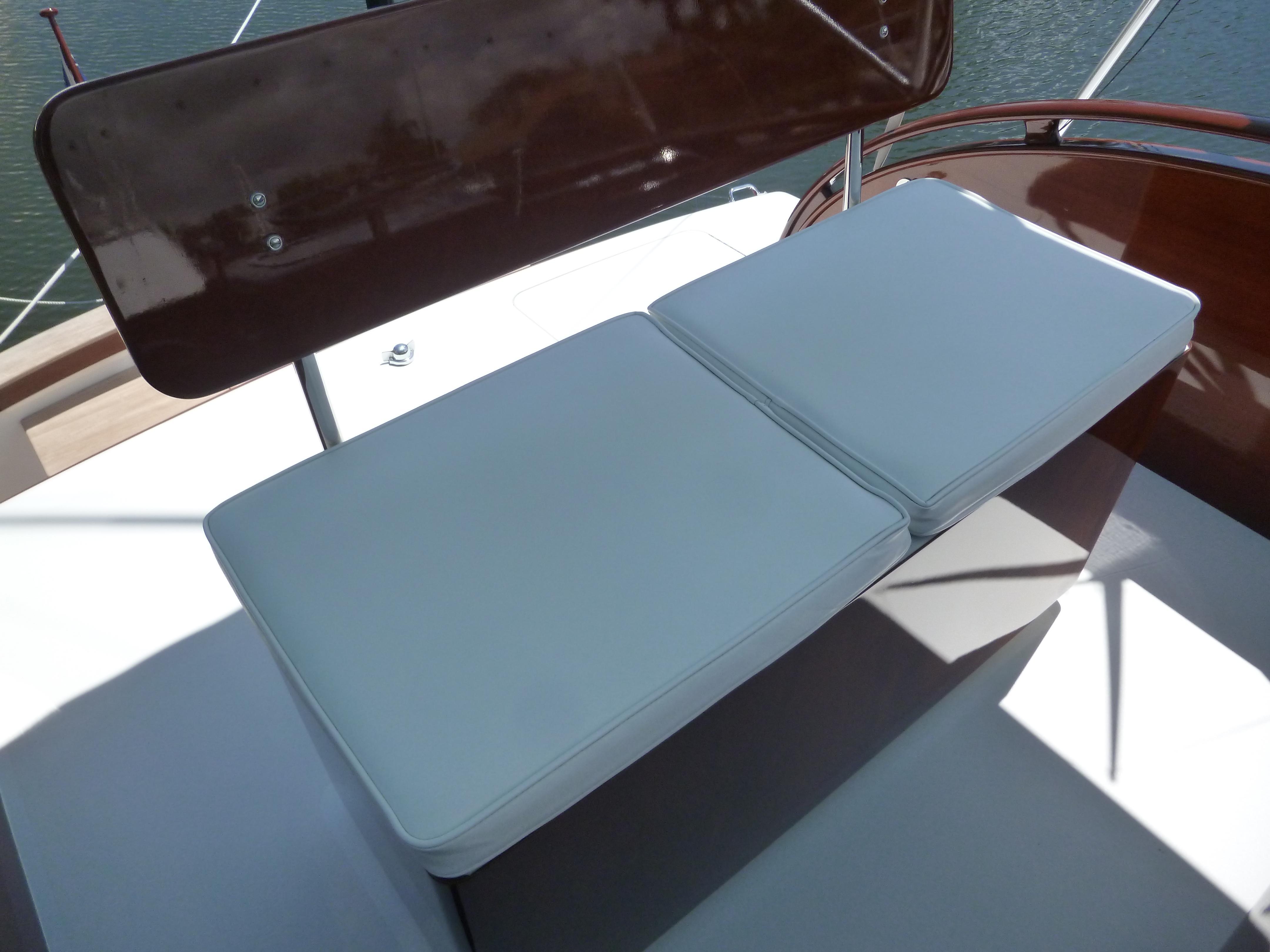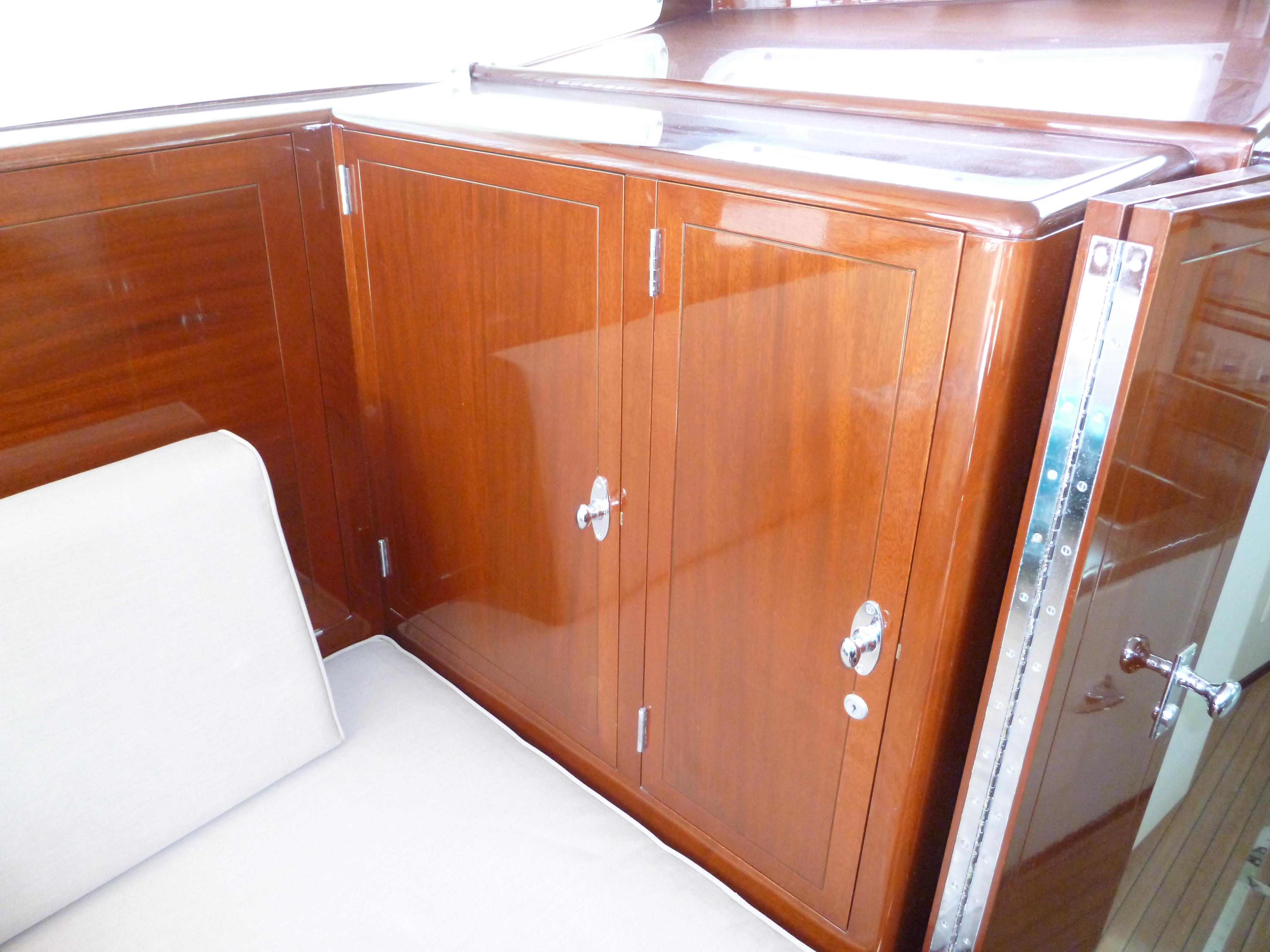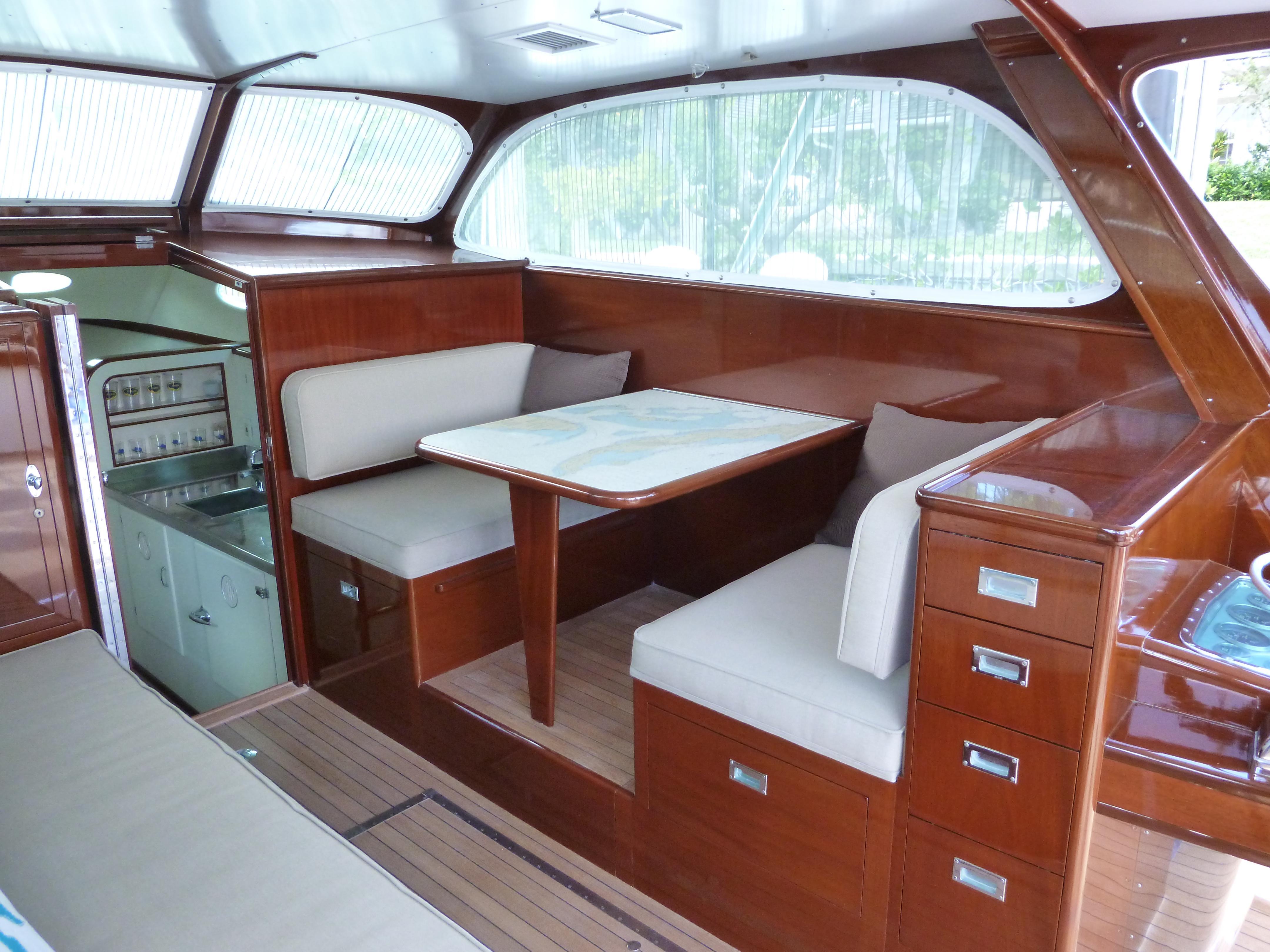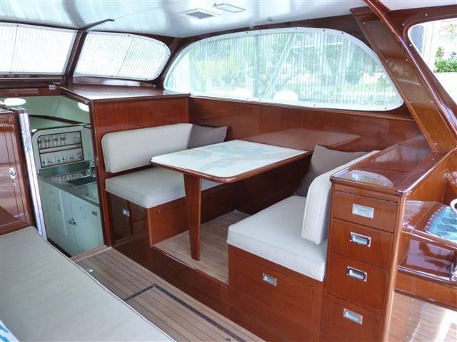Walking from the cockpit into the deck house, which is finished in Honduran Mahogany, there is a rod locker and bench seating to port. The dinette is to starboard and converts to a berth. Walking forward and down the steps of the companion way the galley is to starboard. The head, shower stall and hanging locker are to port and V-berth forward.