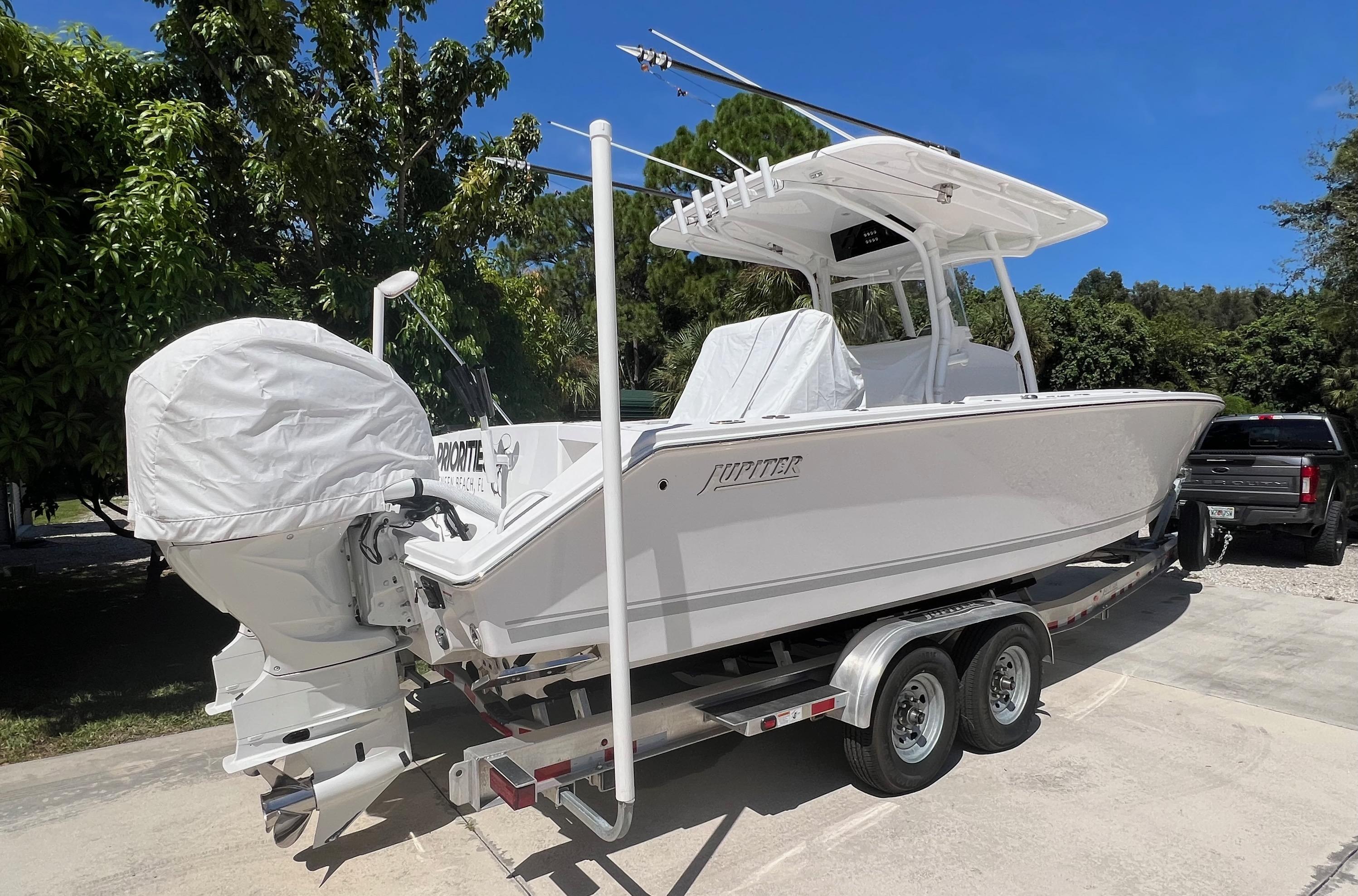 PRIORITIES is an especially clean 2023 Jupiter 30 HFS with an AmeraTrail trailer being made available for immediate delivery as the seller's boating plans have changed. She is well equipped and lightly used, with only 63 hours.