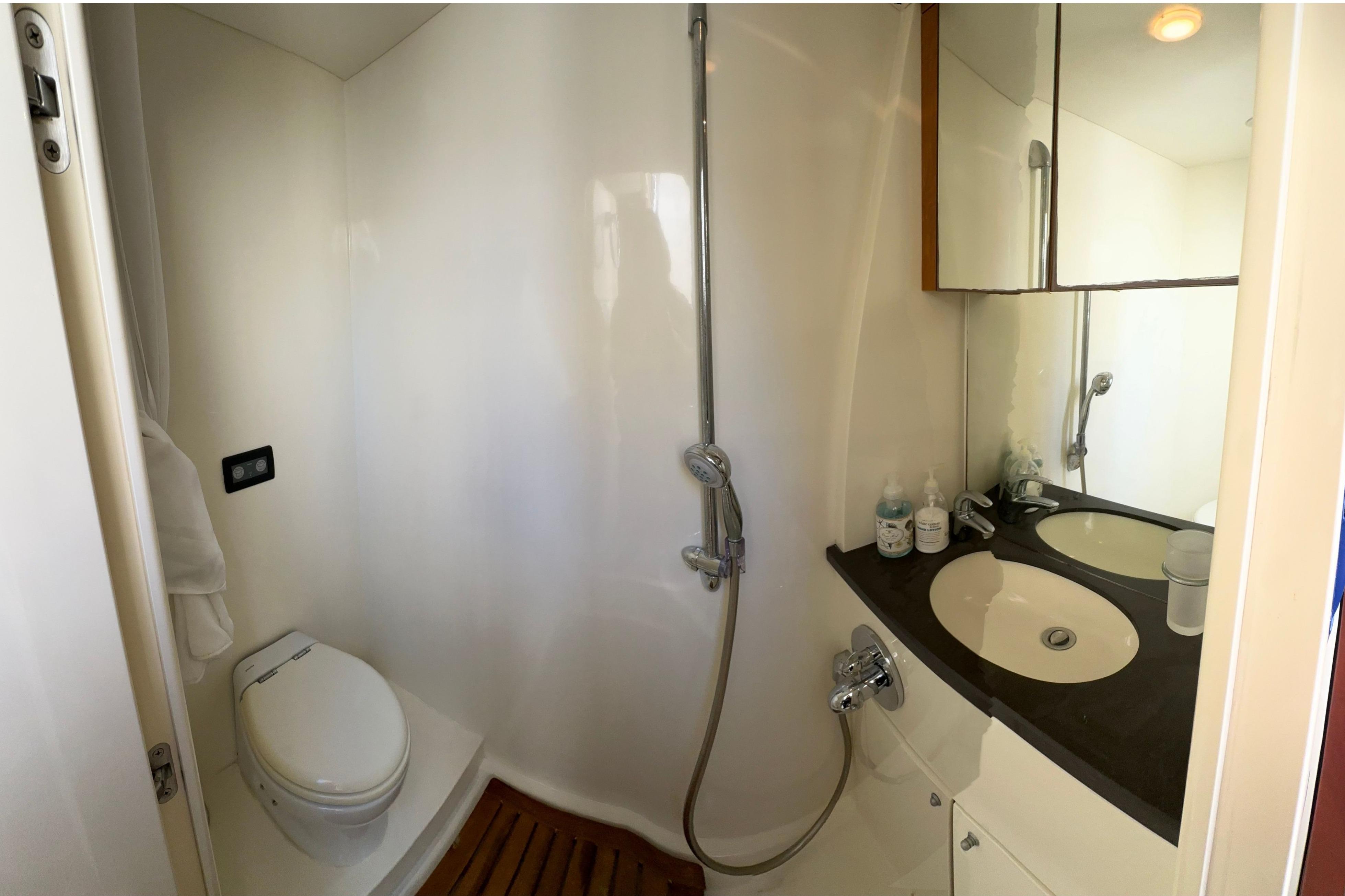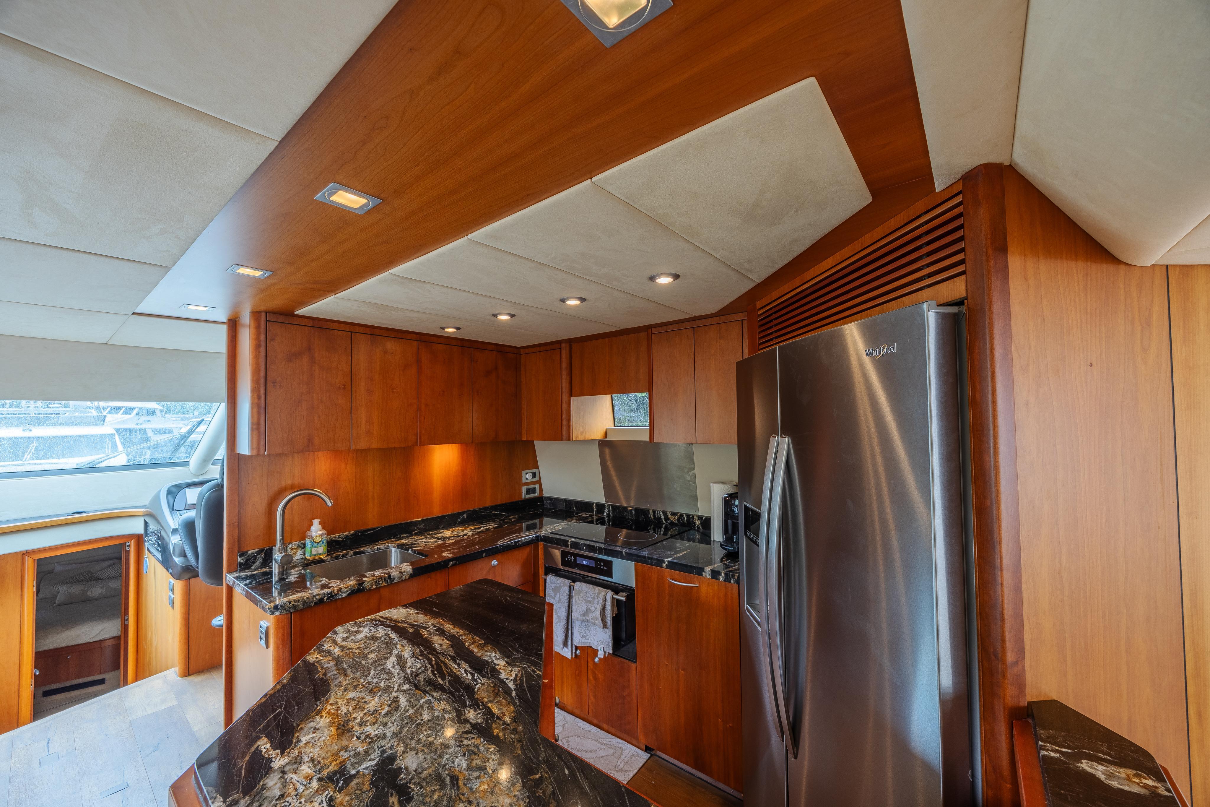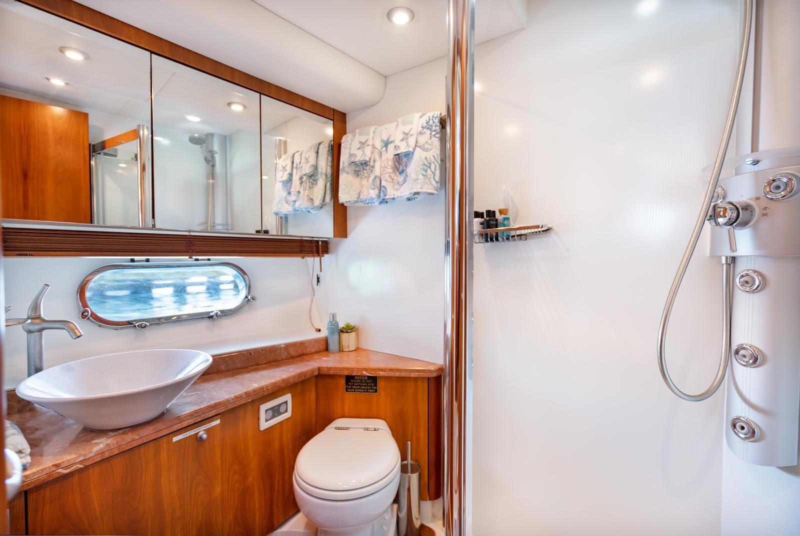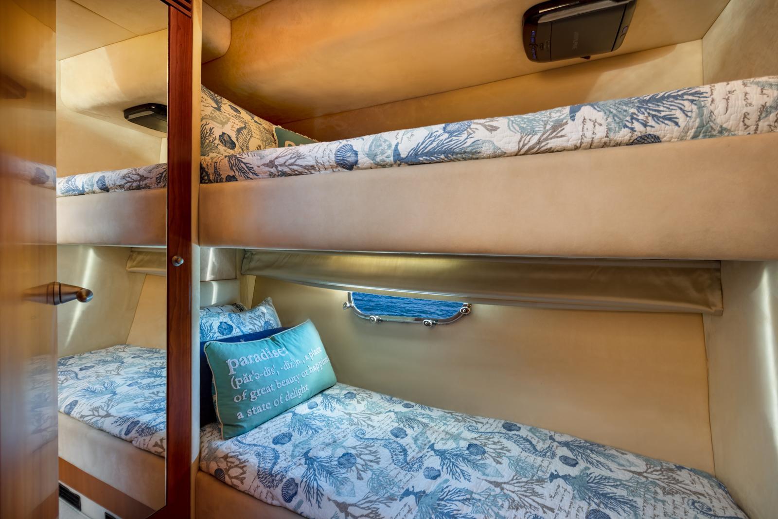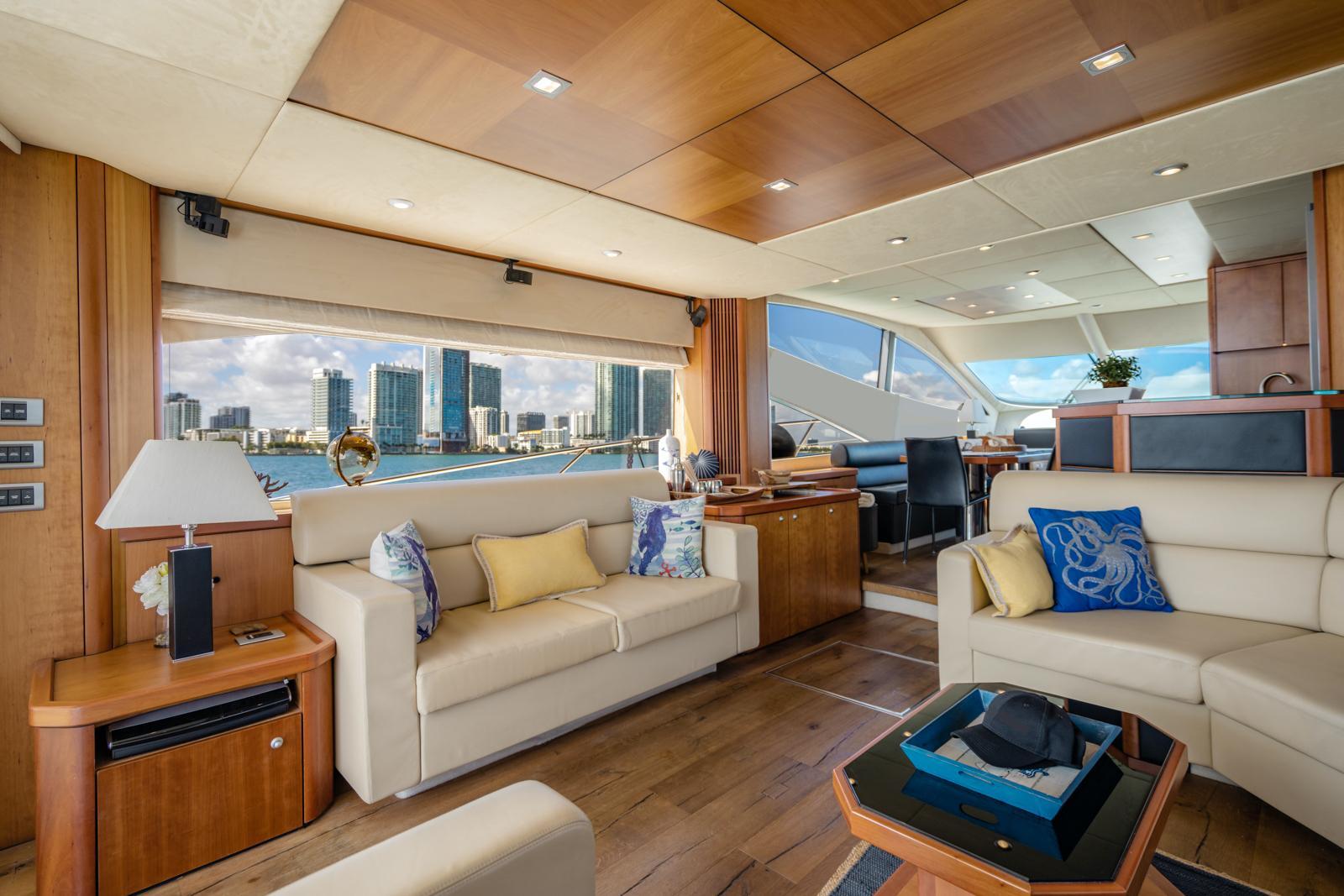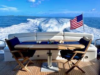 Enter the interior through full width sliding companionway doors to the full panoramic view salon. Forward is the dinette to port and fully equipped galley to starboard. Forward is the helm station to starboard with full arrays of engine monitoring gauges and electronic navigation equipment. Forward and down are the guest staterooms with ensuite head/showers. Master stateroom and ensuite head/shower is aft. Indirect and courtesy lighting throughout the interior and exterior. Vessel is air conditioned through-out. She also has DirecTV satellite in all staterooms, DVR in the salon & master with KVH at Sea dish antenna system.