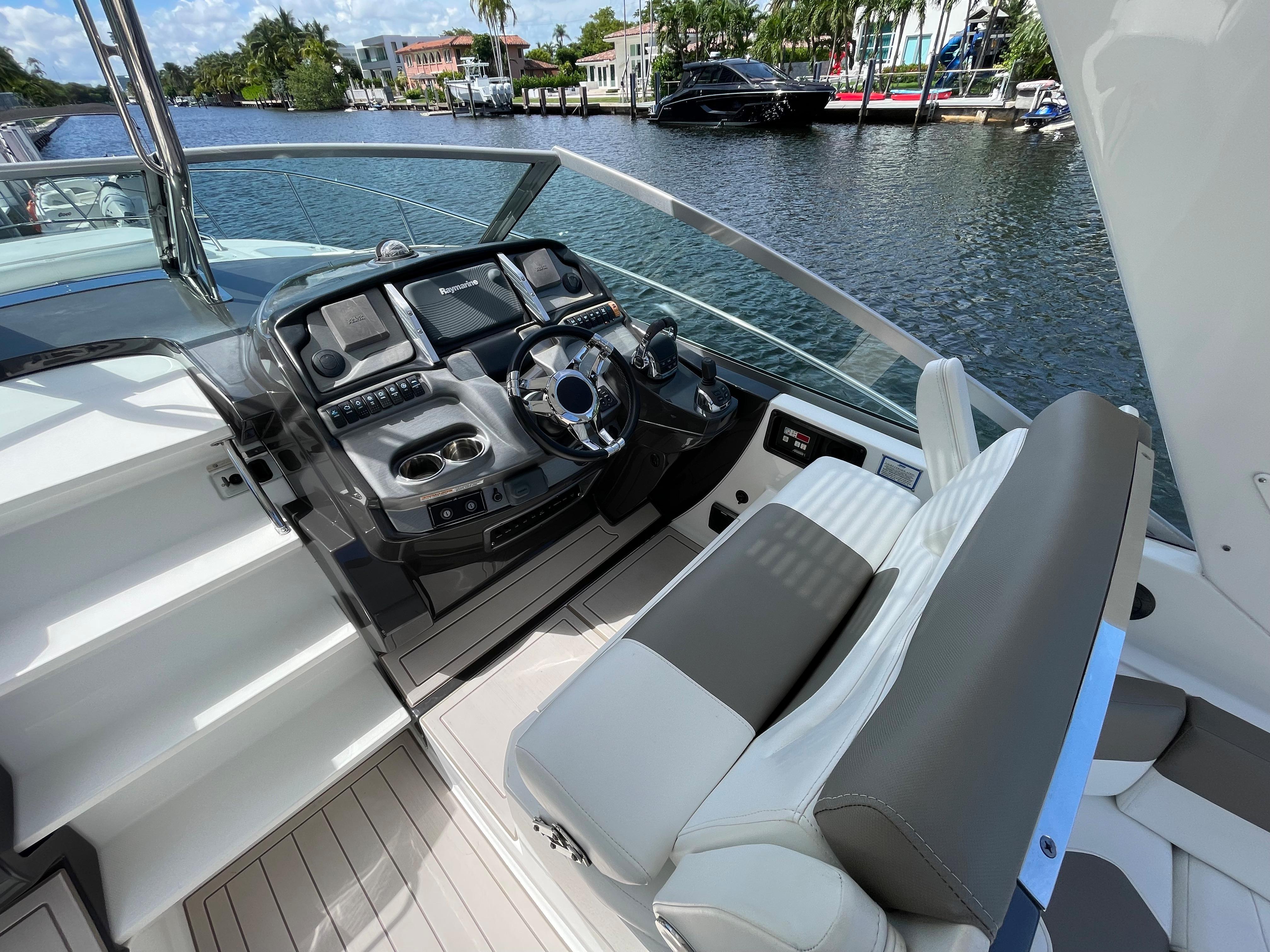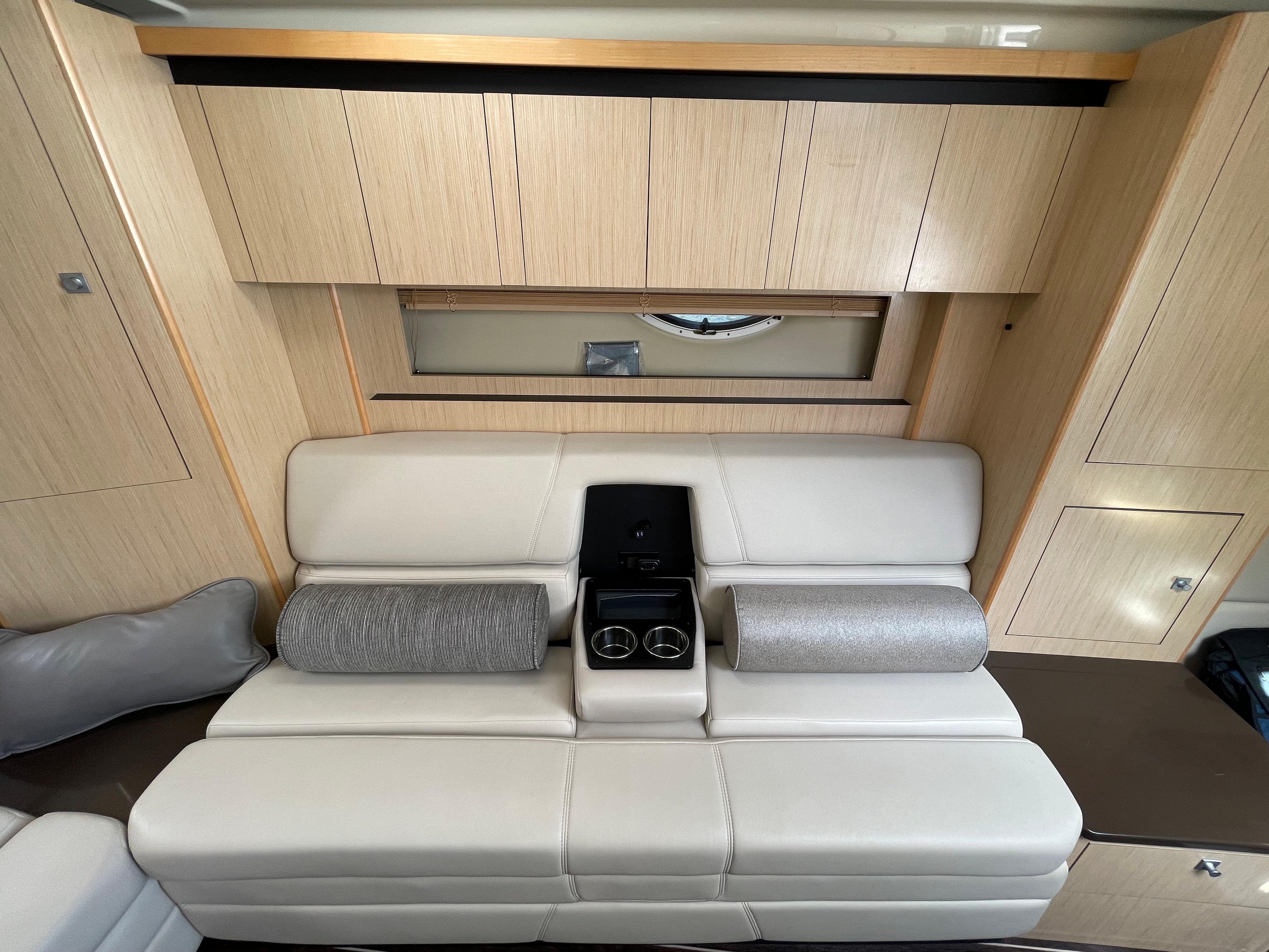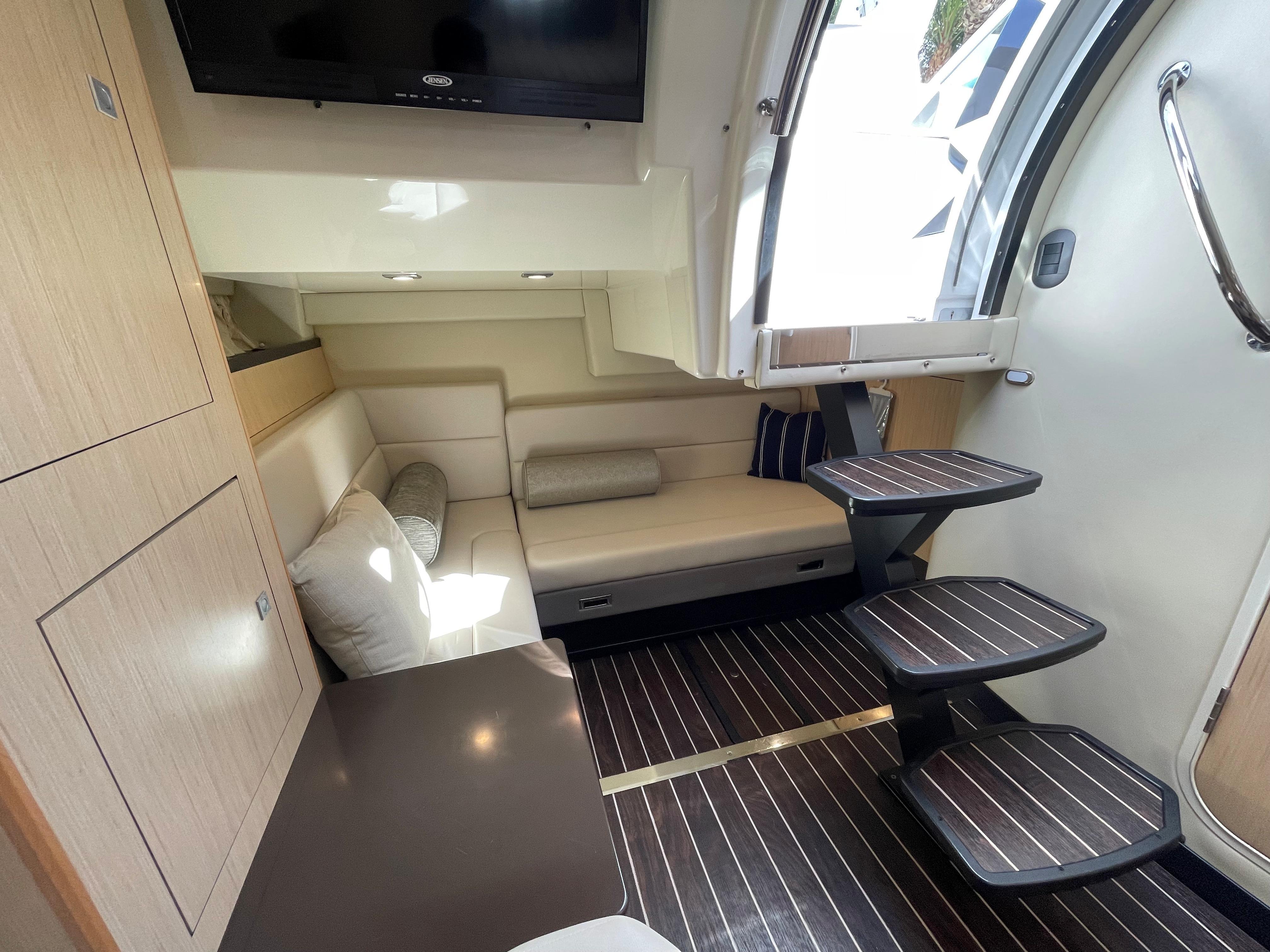 Leave the turmoil of civilization behind aboard the 335 Sport Yacht. It is a perfect getaway because it is equipped with many of the features of his larger sister. The helm on this boat is unique, featuring twin forward-facing helm seats and chart storage on the power side. Built-in steps in the cabin door allow safe access to the bow, where a large sun pad awaits.