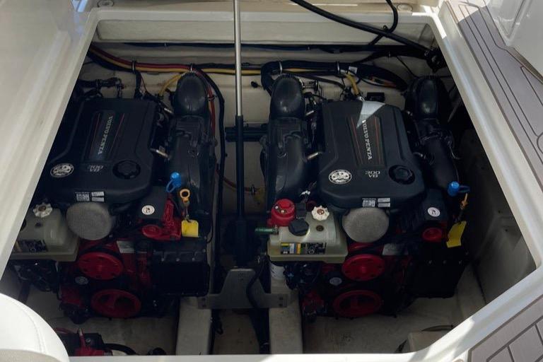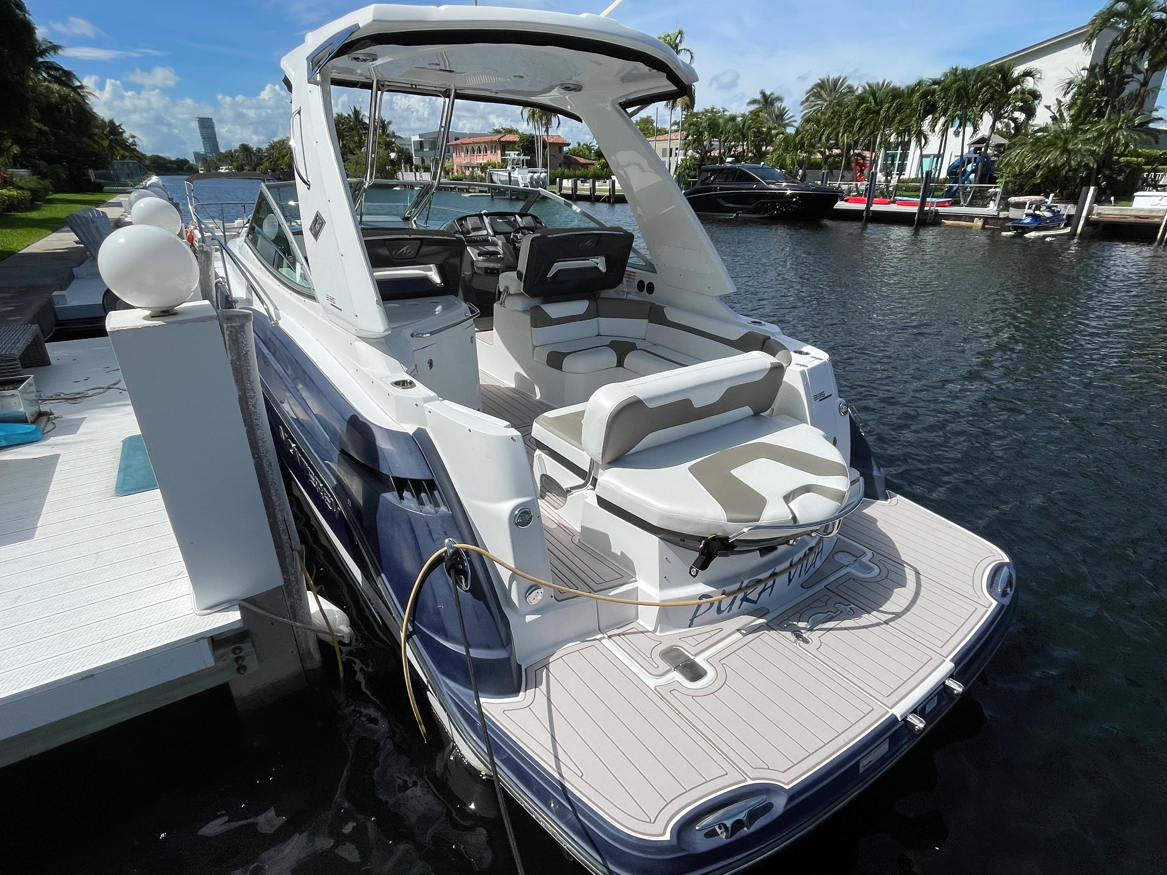 The Monterey 335 Sport Yacht is a roomy sterndrive cruiser with a balanced blend of comfort and performance. Monterey's are generally good values compared with the competition. Construction is first-rate, the styling is cutting-edge, and the list of standard equipment is impressive. The layout of this 2016 Monterey 335 includes a roomy cockpit with wraparound lounge seating and a convertible aft sun pad. A walk-thru windshield provides easy access to the foredeck with its removable sun pad and standard anchor windlass. Monterey's well-appointed interior with Ultraleather upholstery has sleeping arrangements for six, including a double berth forward, convertible dinette, and an aft seating area that converts to a double berth. Additional features include synthetic wood cabin flooring, an entertainment center with a 22" flat-screen TV, a generator, mahogany interior cabinetry, a cockpit wet bar, a transom shower, and a cockpit table. She has twin Volvo Penta 300HP engines that cruise at 26/28 knots (40+ wide open).