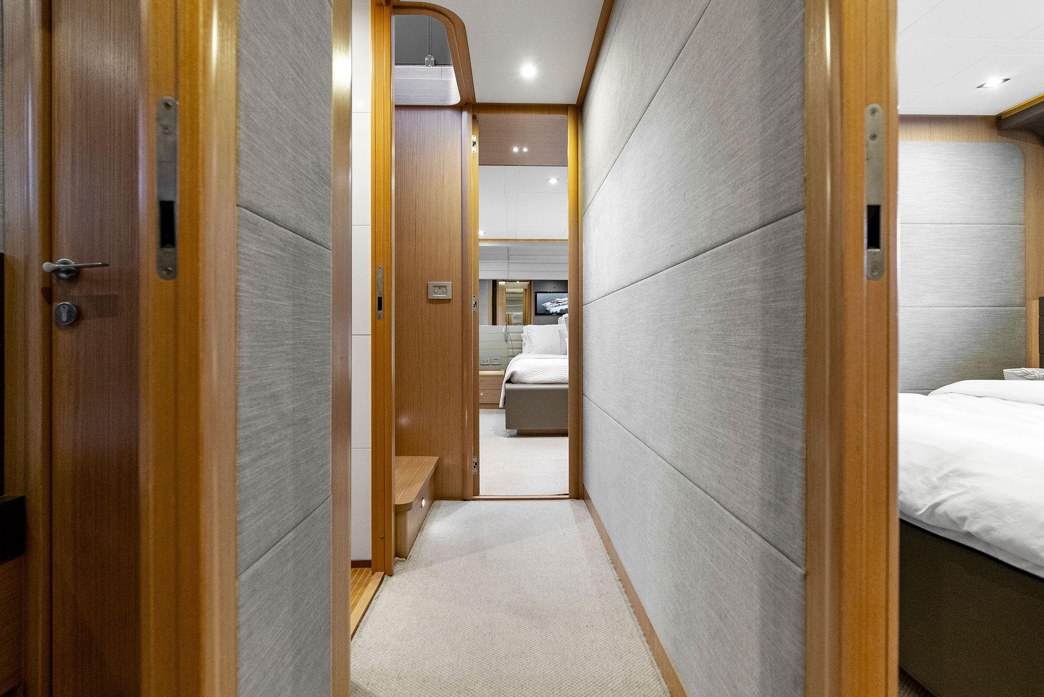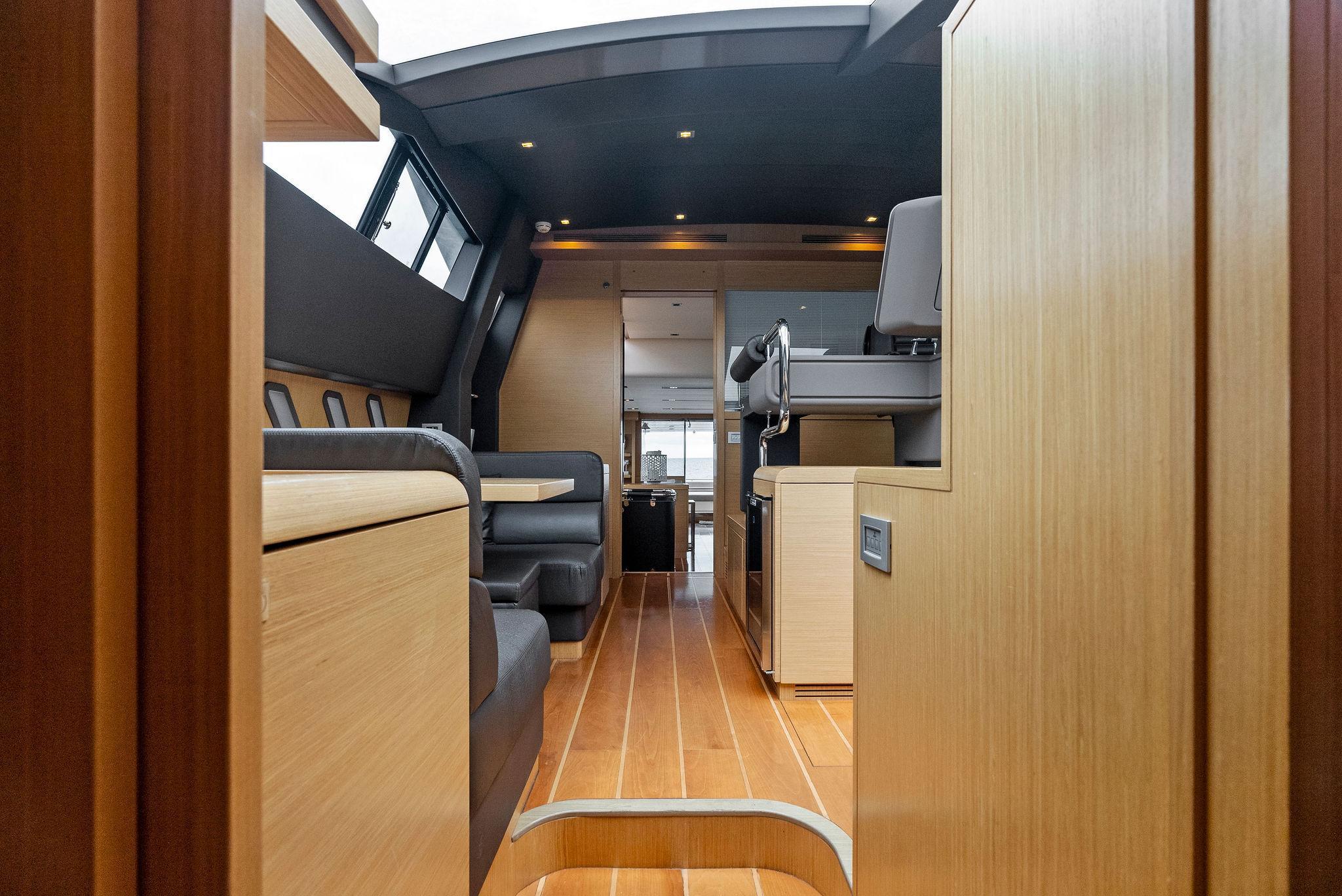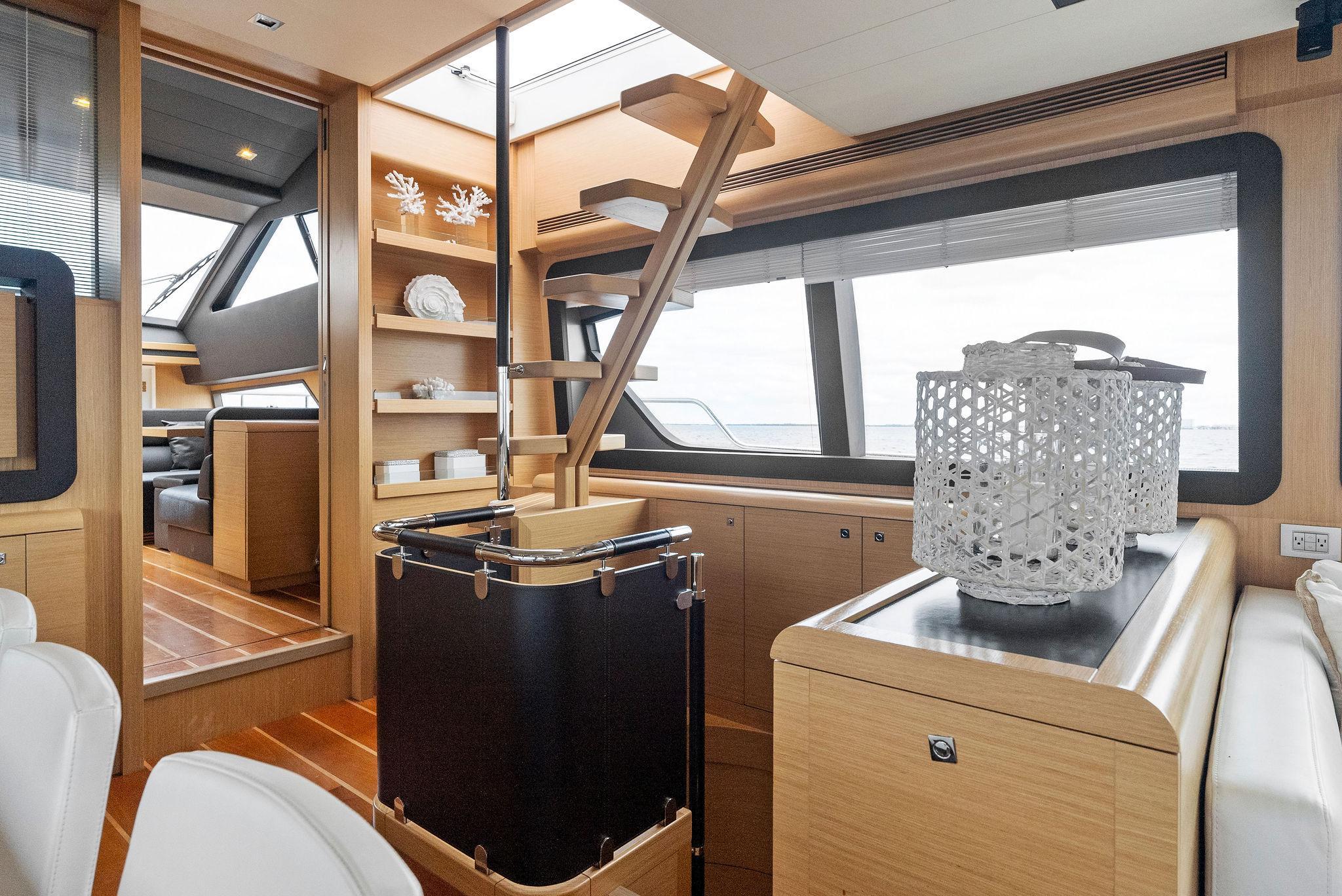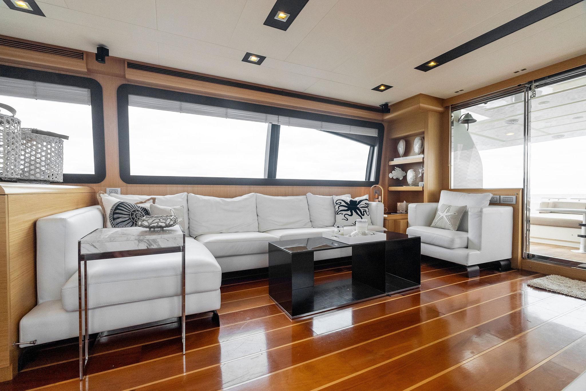 - Wood flooring throughout main deck of yacht