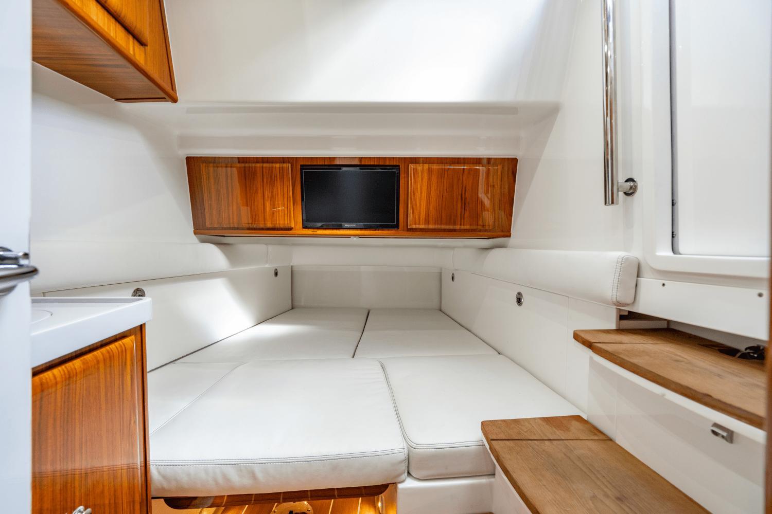 The bow area is dual purpose with seating to accommodate guests on the forward-facing lounger or around bow seats and table that convert to a large sun pad for lazy days catching rays; or remove the cushions for a fully functional fishing platform. The luxuriously functional cabin with queen sized berth, storage galore, galley kitchen, and separate head/shower compartment is the perfect place for air-conditioned comfort on hot days as well as longer trips with overnight stays.
