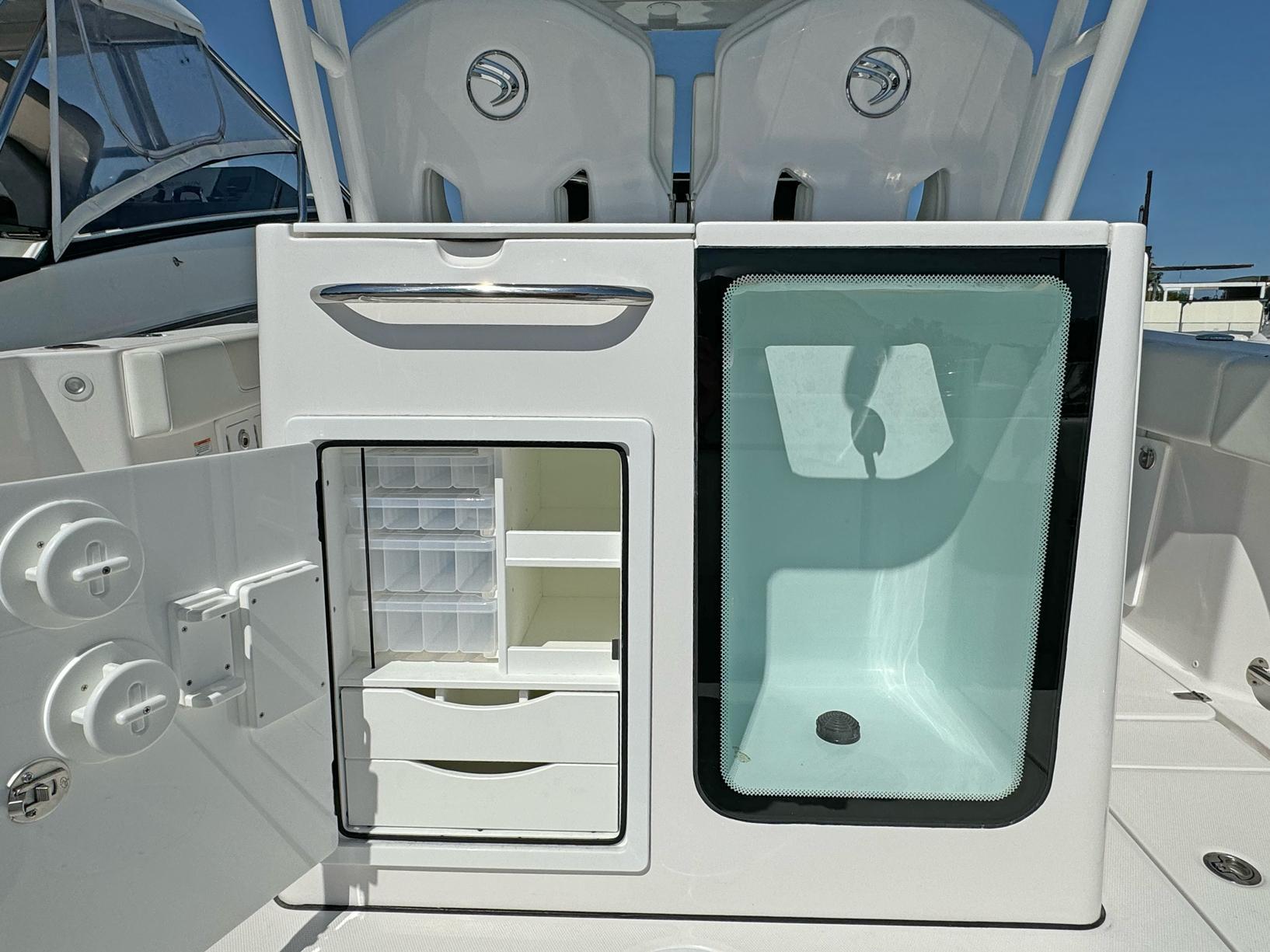 - Prep Station with Premium Counter Top, Sink with Folding Faucet, Storage Drawers (3), Aquarium View Pressurized Livewell (38gal)