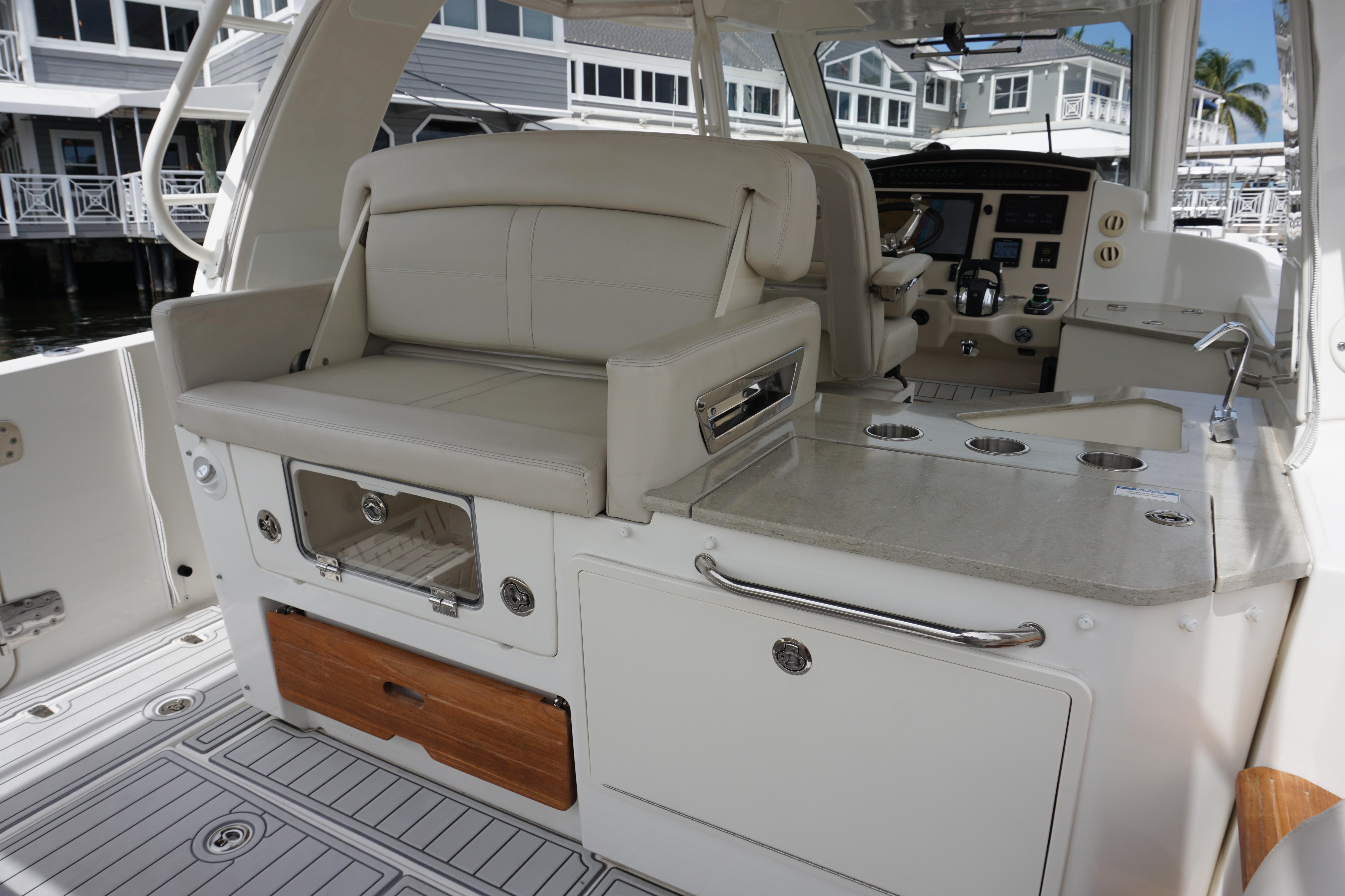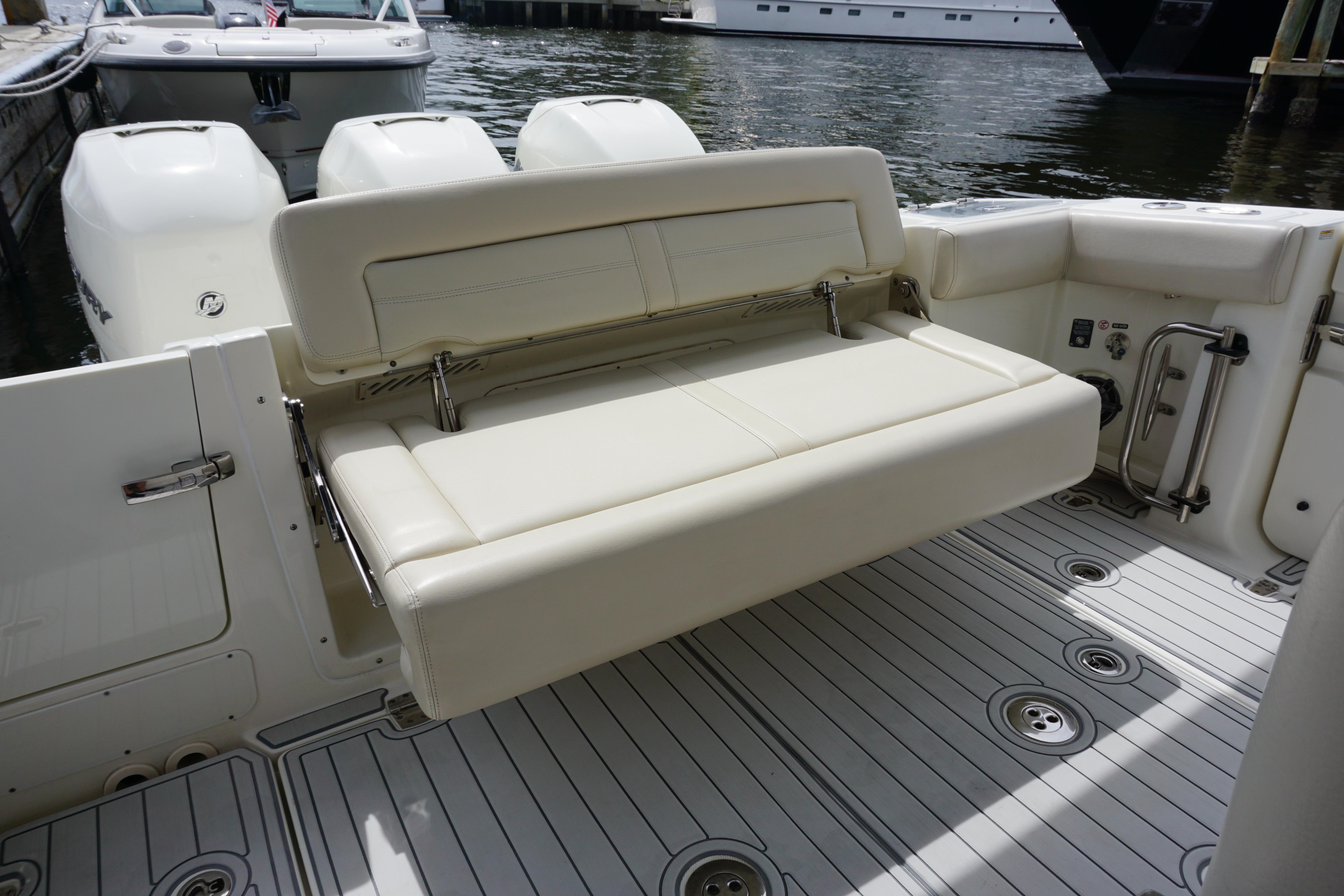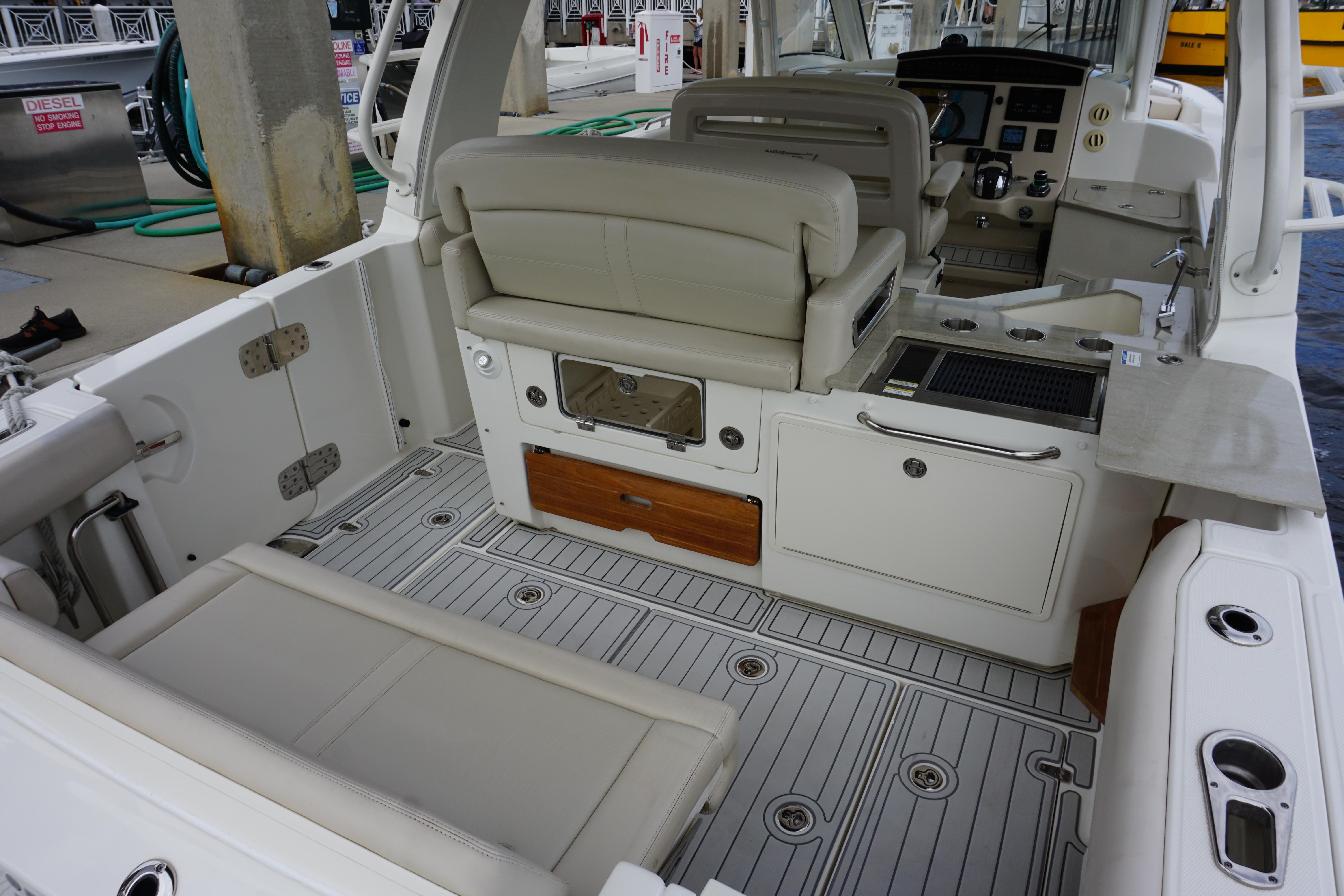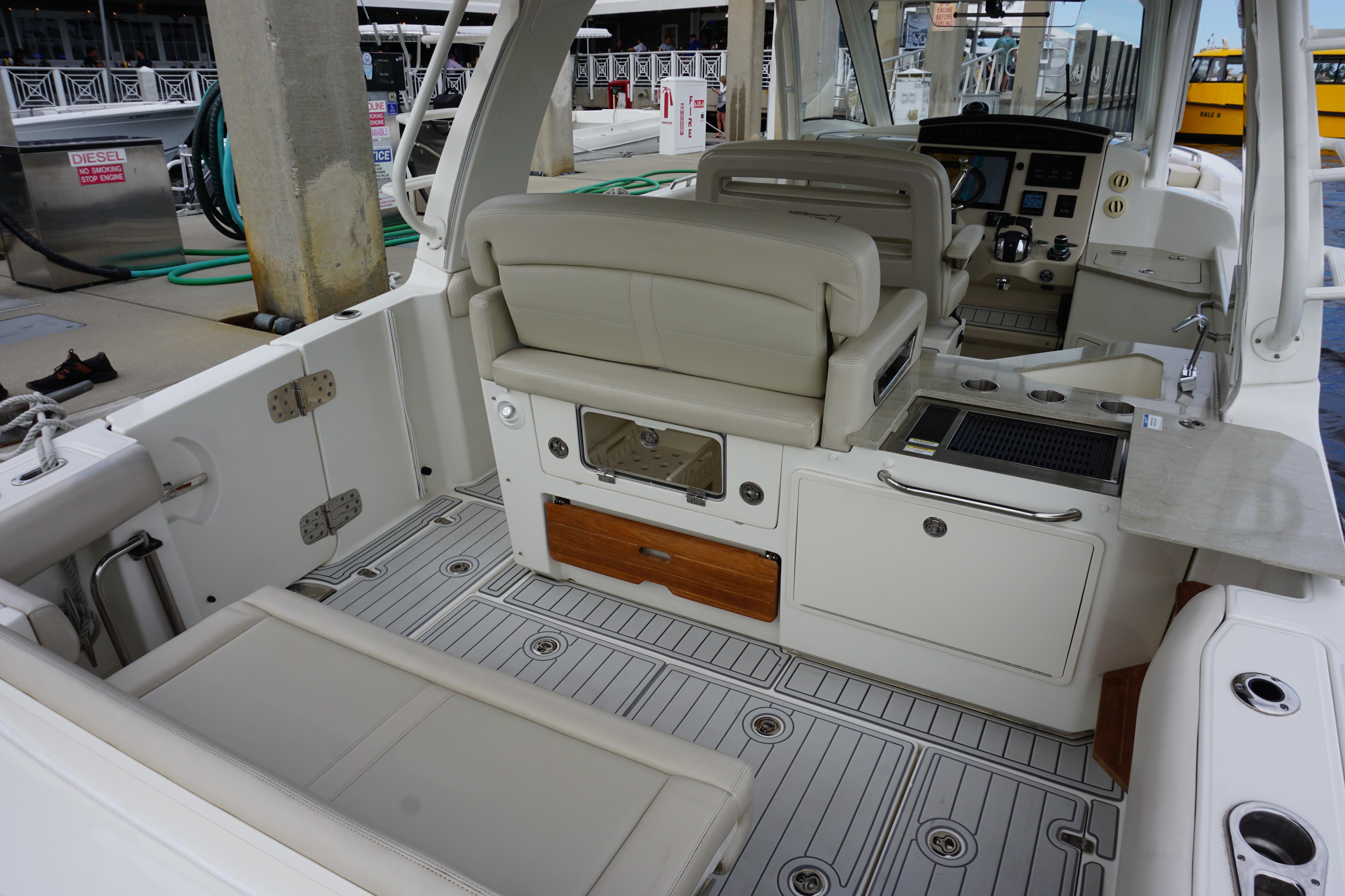 - Robust forward console lounge includes fold-down armrests and drink holders, with forward island deck seating opposite.