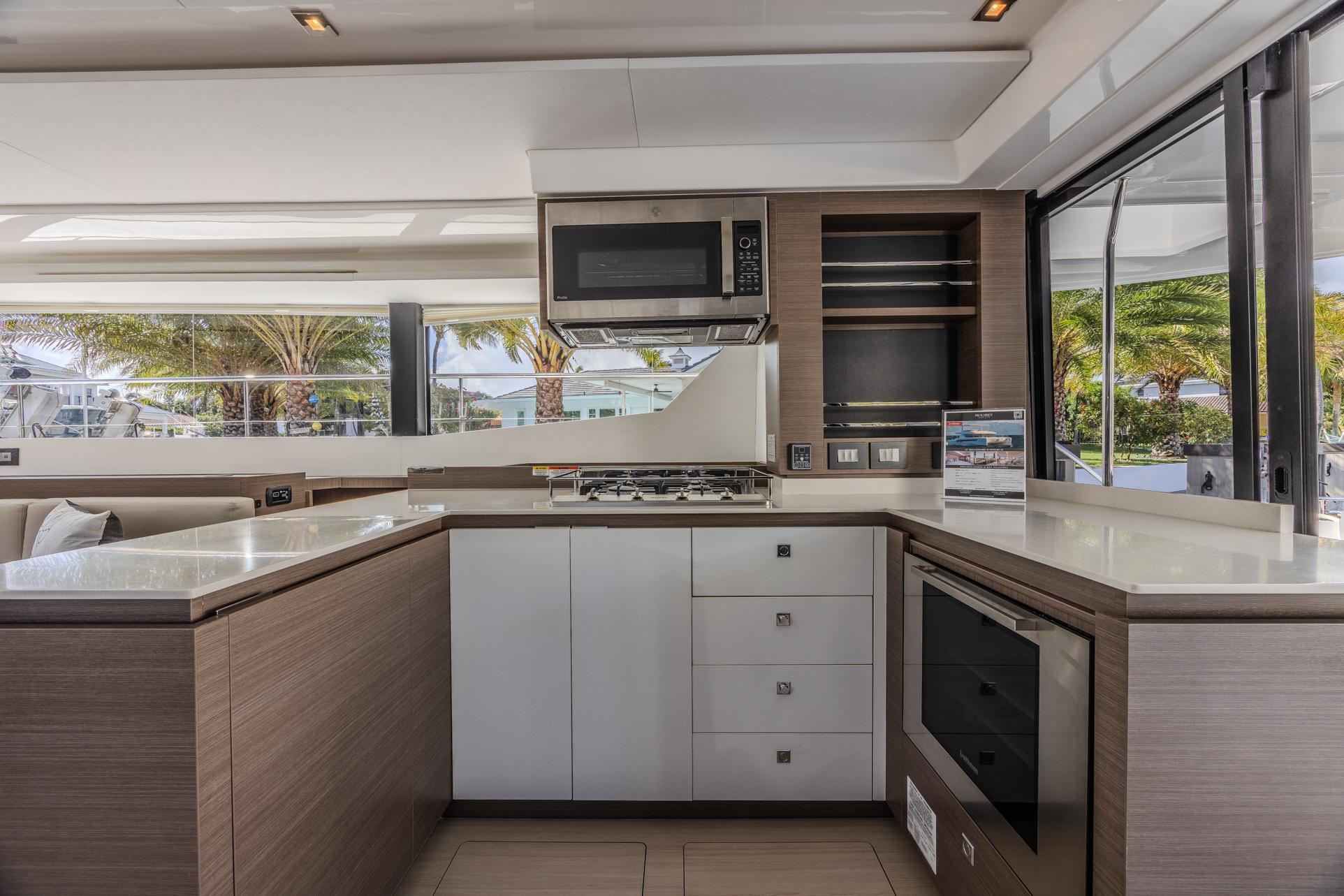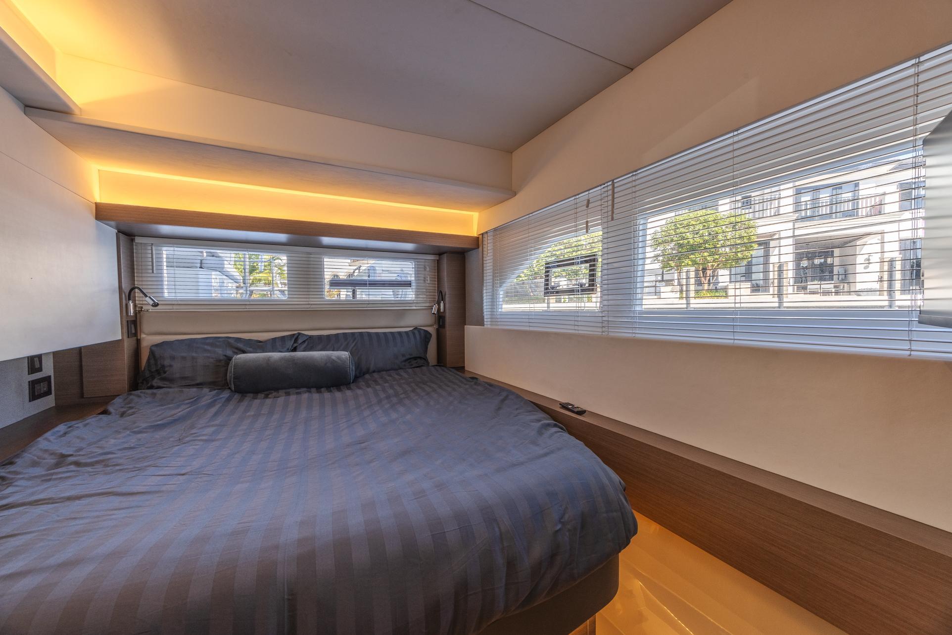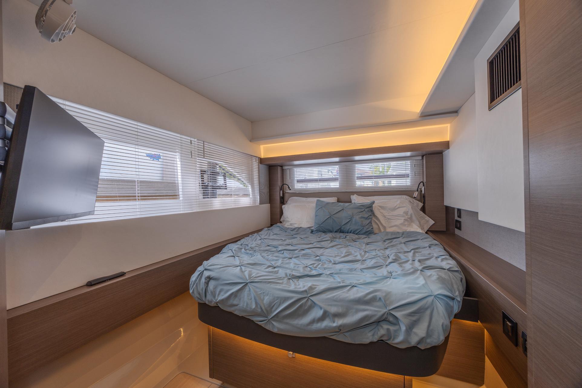 Inside, a modern interior with a cool palette immediately sets the tone for at-sea living. The saloon features an L-shaped lounge and a two-person settee with an option to add an interior navigation station. The hull side window, with the option of different portlight configurations, as well as the coach roof windows and panoramic windows in the saloon, bring in an abundance of natural light. At night, smart lighting casts warm, consistent light throughout the space. It’s easy to move about with access to the foredeck through the forward saloon door. The galley, a natural gathering spot, offers ample storage and is outfitted with Staron® worktop surfaces and a full suite of appliances making meal preparations easy and enjoyable.