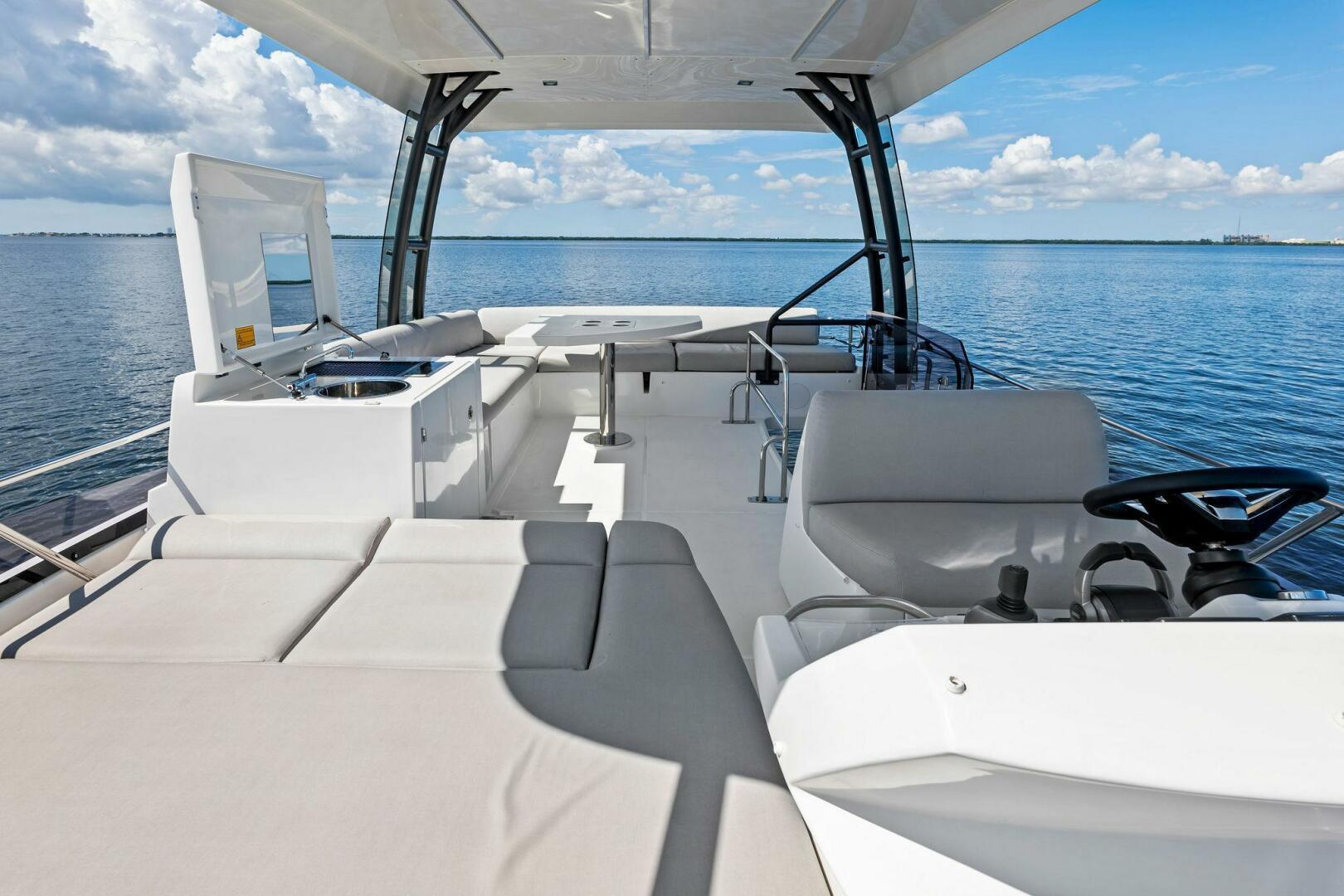 - North American Package 2022: Teak cockpit table with telescopic legs, Maindeck protective covers: cockpit seating and cockpit table cover, Windlass control and chain counter at helm station, Electric trim tabs, Stainless steel bow protection, Electric opening window to starboard, 2- burner ceramic cooktop, Miele combination microwave/grill, Freshwater/saltwater wash-down system in cockpit and anchor locker with dedicated pump, Dock water inlet, Glendinning horsepower cable management system.