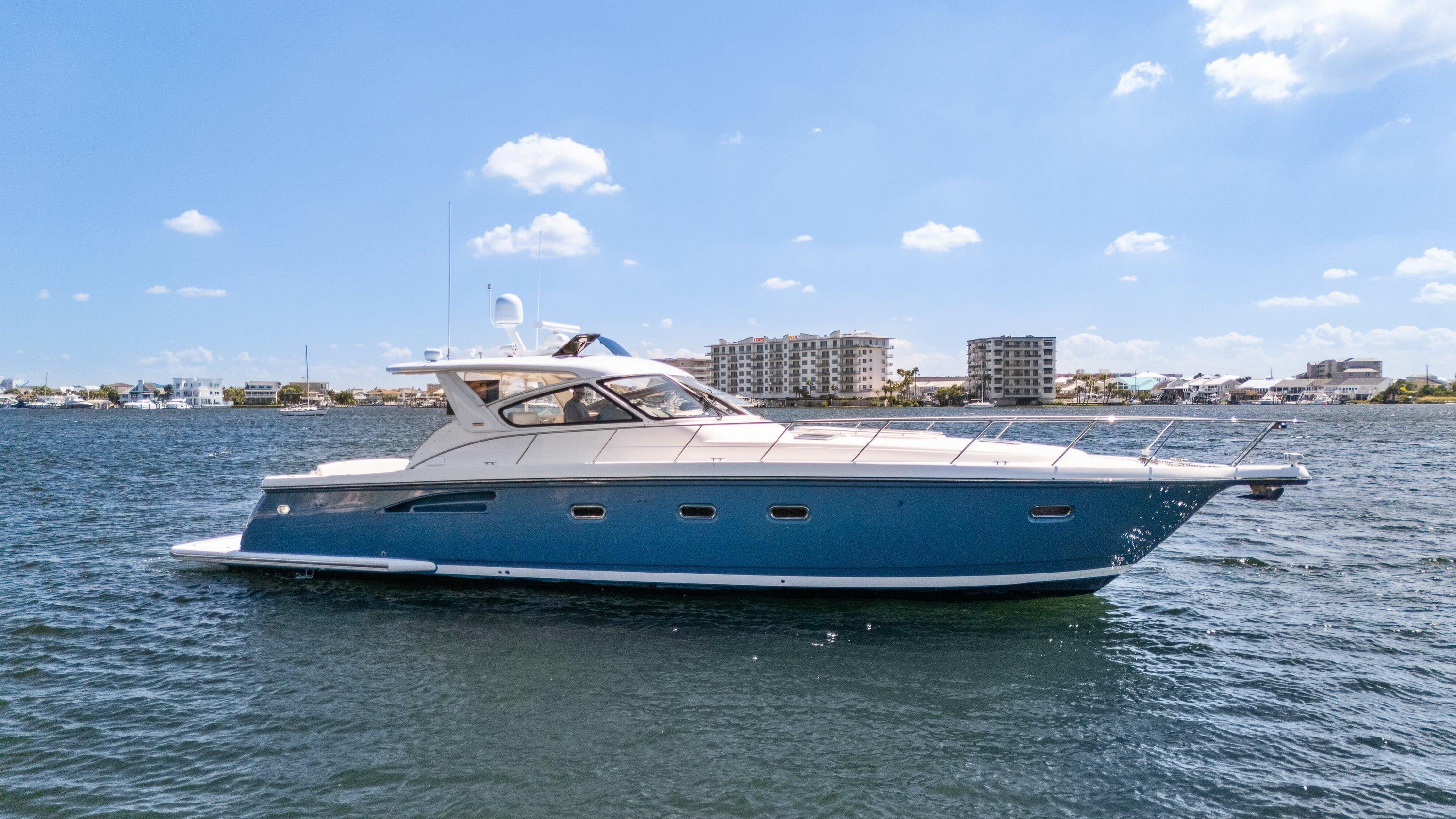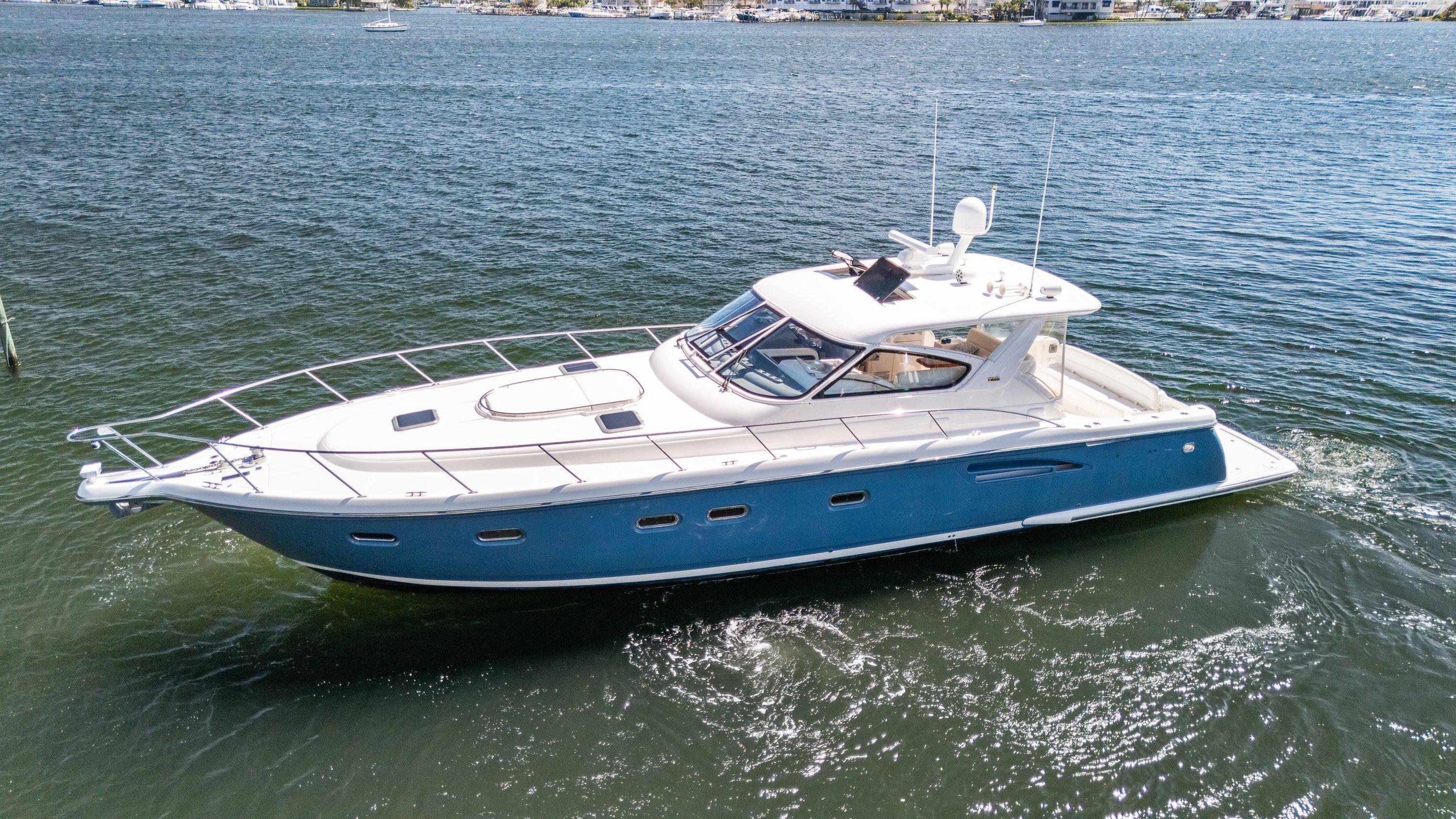 This 2000 Tiara 52’ Express Yacht CERULEAN boasts an impressive layout, with an expansive bridge deck offering a spacious environment, highlighted by a large helm to port for effortless operation of all vessel controls. This 52' Tiara is perfect for entertaining and can comfortably accommodate five adults with its "L” shaped seating that's complemented by a custom teak table. Behind the helm of the Tiara 52’ you'll find a well-appointed wet bar complete with an icemaker and refrigerator, elevating your on-deck experience. CERULEAN is meticulously maintained, featuring weekly washes and cleanings, regular servicing of strainers, and topsides waxed three times a year ensuring she is pristine condition. Vessel Highlights:Boat hull from rail down painted blue (April 2024)Fire ExtinguisherCustom bed covers in both stateroomsNew Pillow, decor throughoutNew stainless microwaveNew cabinetry and hardwareNew wallpaper in bathroomsNew gold vent covers in dining area